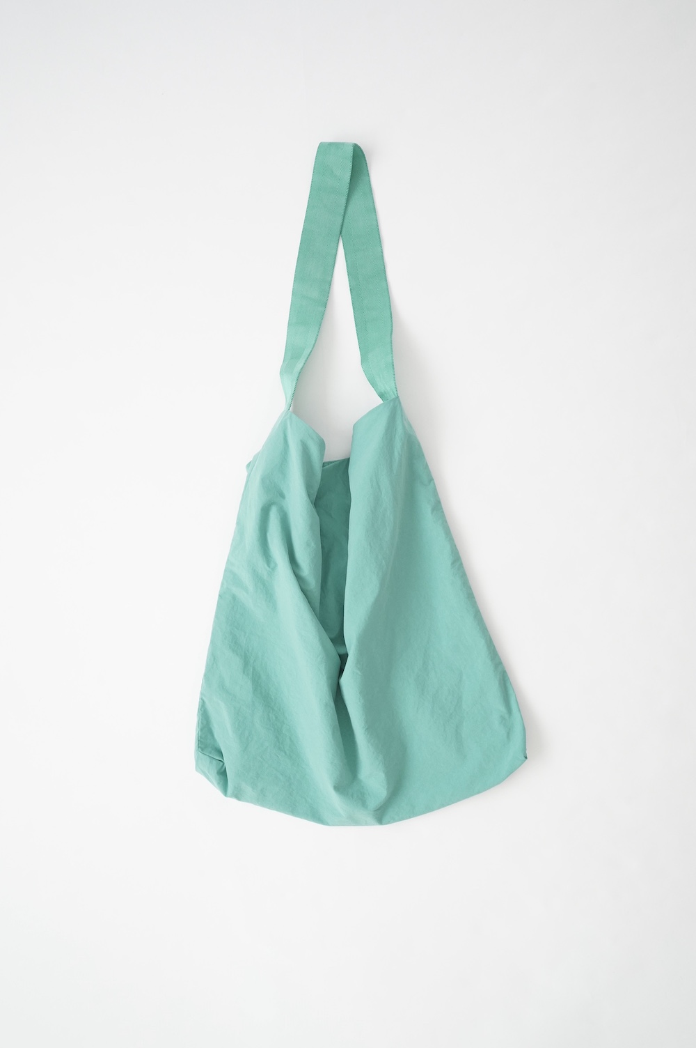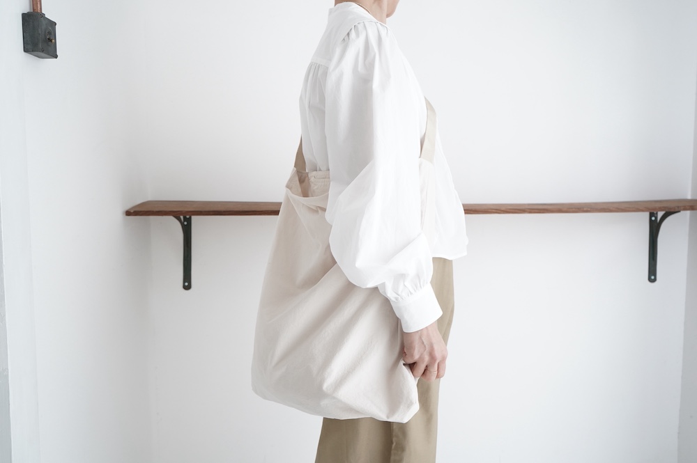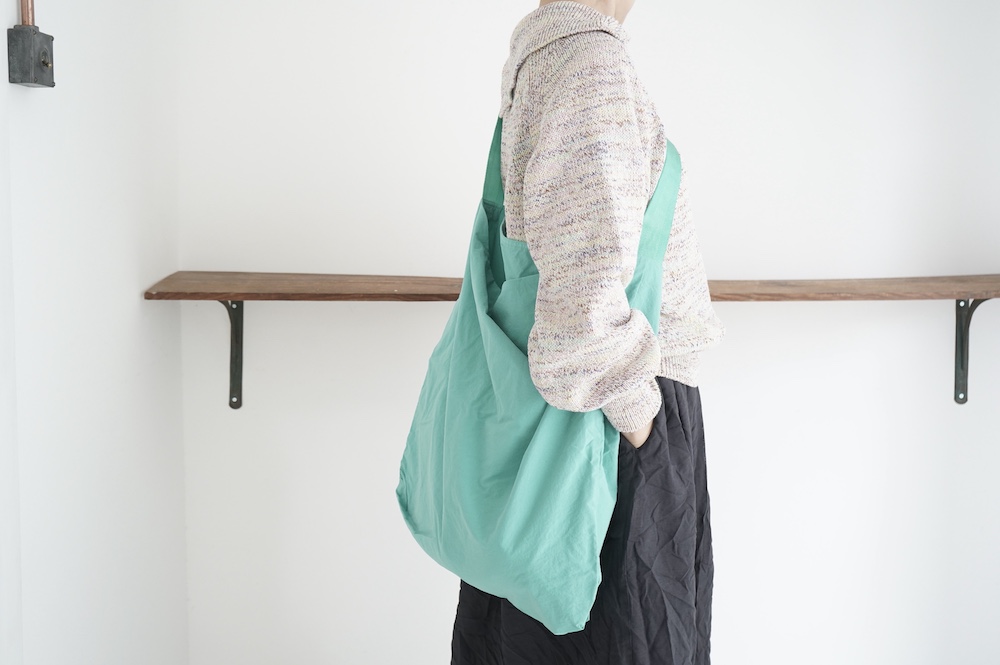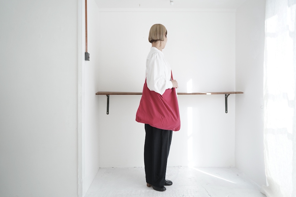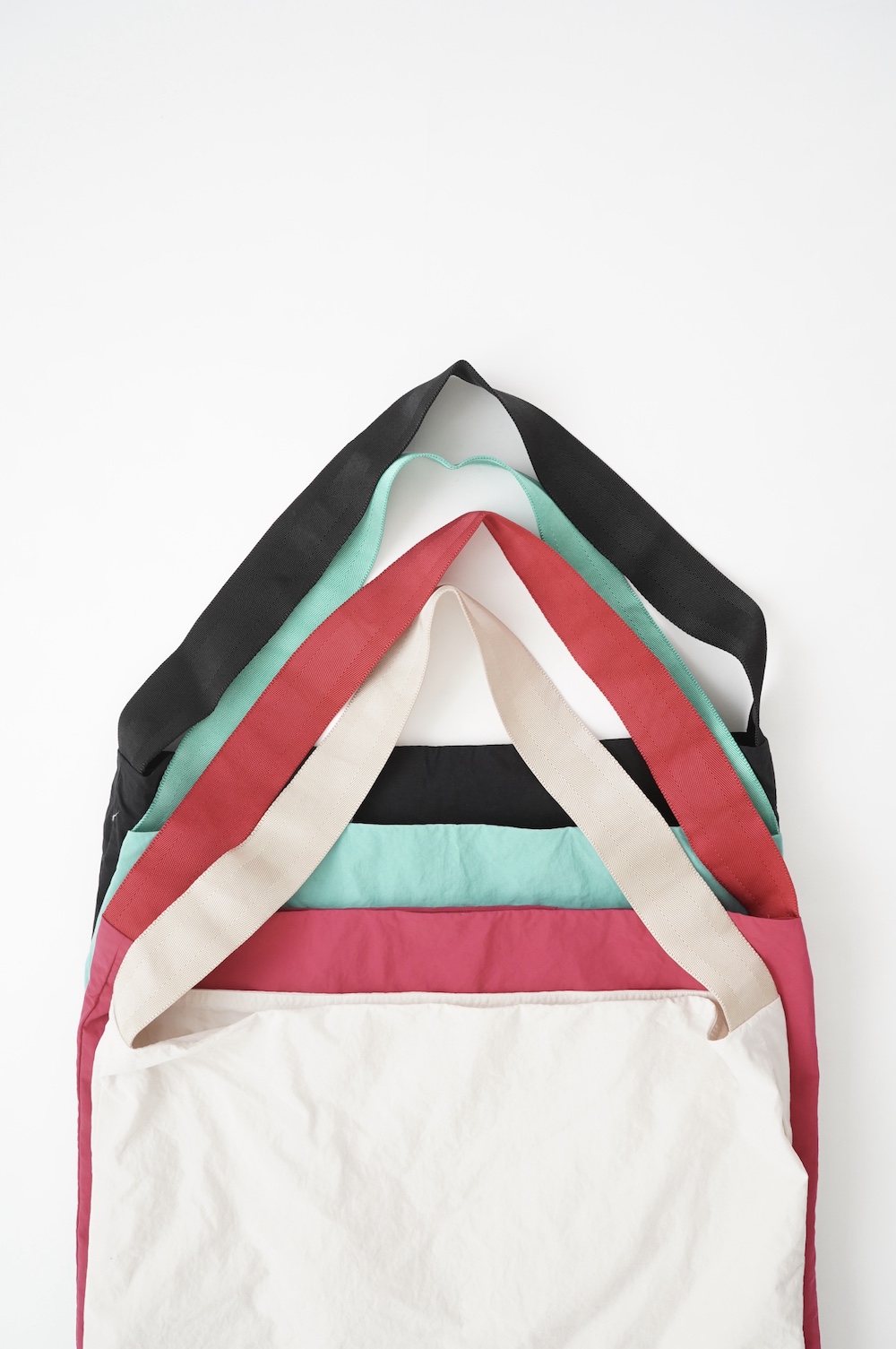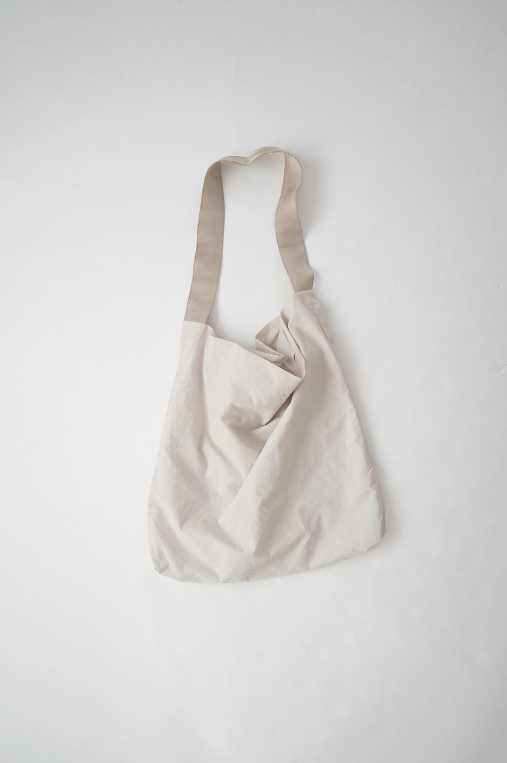 よこ糸にやや太めの糸を用いるタッサーナイロン素材は、「コットンじゃないの?」と思えるくらいの素材感と軽さです。本体は共布が二重になっており、裏地は埃が溜まりにくいように裏地使いしています。また携帯などが入る内ポケットもあり、収納量もかなりございます。ベルト部分は同じナイロンですが、ベルトのナイロンは滑りの良い、誰もがナイロンだと思えるベルトです。丈夫で滑りがよいので持ち手としては最良です。色が鮮やかに出るナイロンだからこその発色や独特の風合いをお楽しみください。また、斜め掛け、ワンショルダーで持つバッグは、男女どちらにもお勧めです。