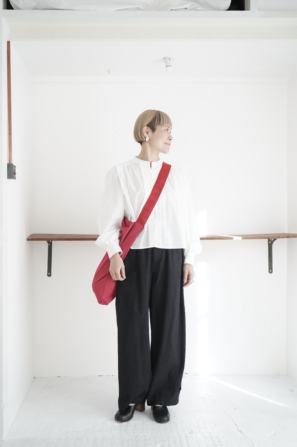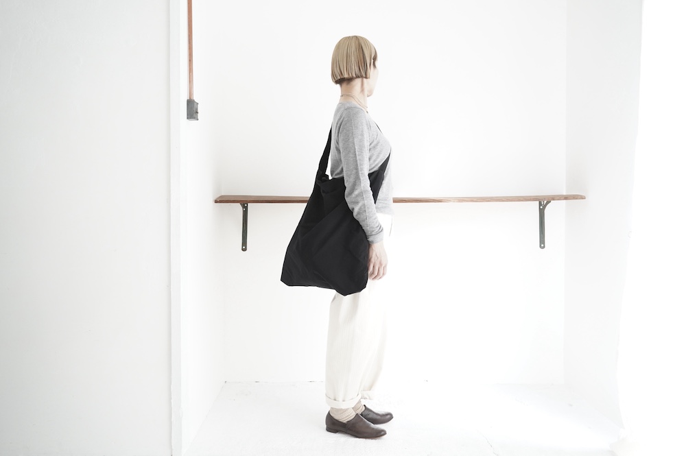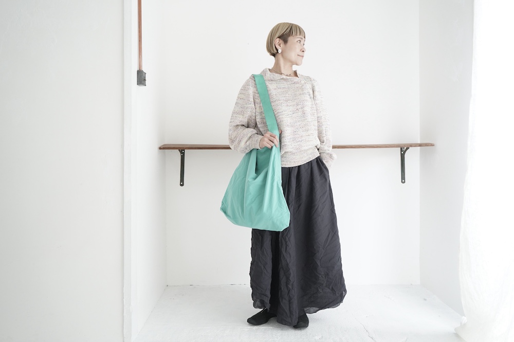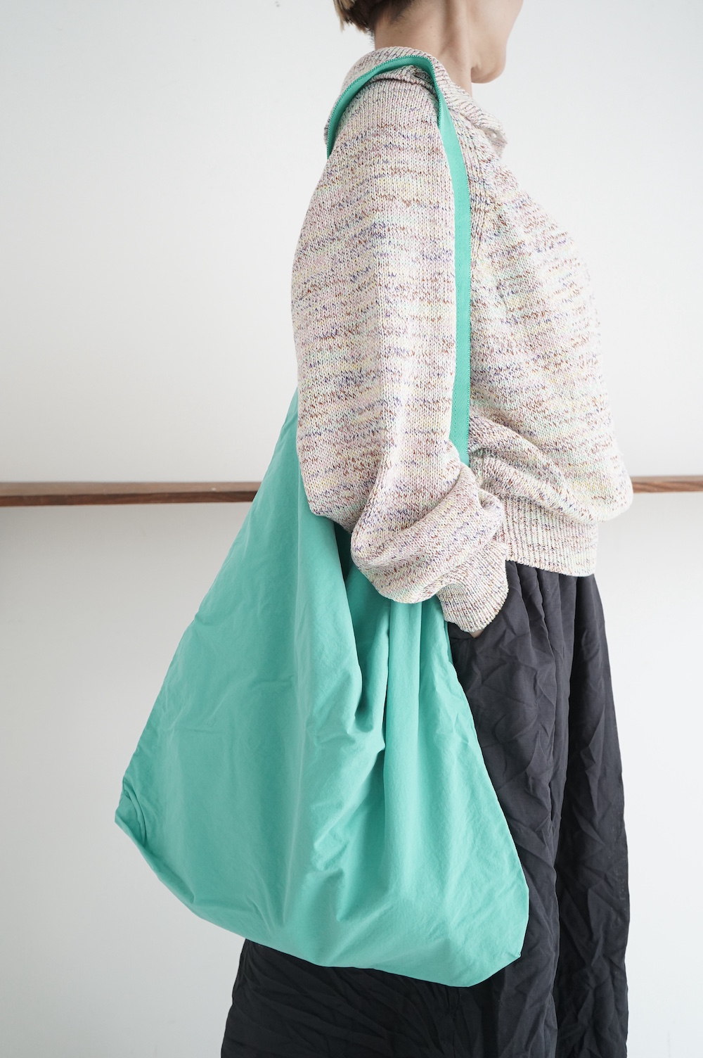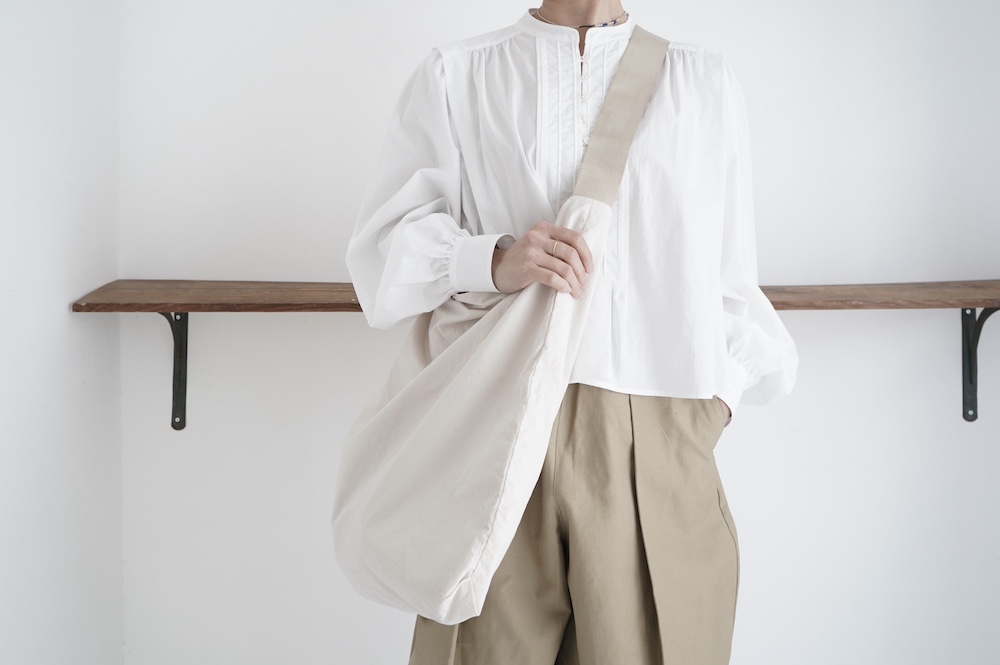 よこ糸にやや太めの糸を用いるタッサーナイロン素材は、「コットンじゃないの?」と思えるくらいの素材感と軽さです。本体は共布が二重になっており、裏地は埃が溜まりにくいように裏地使いしています。また携帯などが入る内ポケットもあり、収納量もかなりございます。ベルト部分は同じナイロンですが、ベルトのナイロンは滑りの良い、誰もがナイロンだと思えるベルトです。丈夫で滑りがよいので持ち手としては最良です。色が鮮やかに出るナイロンだからこその発色や独特の風合いをお楽しみください。また、斜め掛け、ワンショルダーで持つバッグは、男女どちらにもお勧めです。