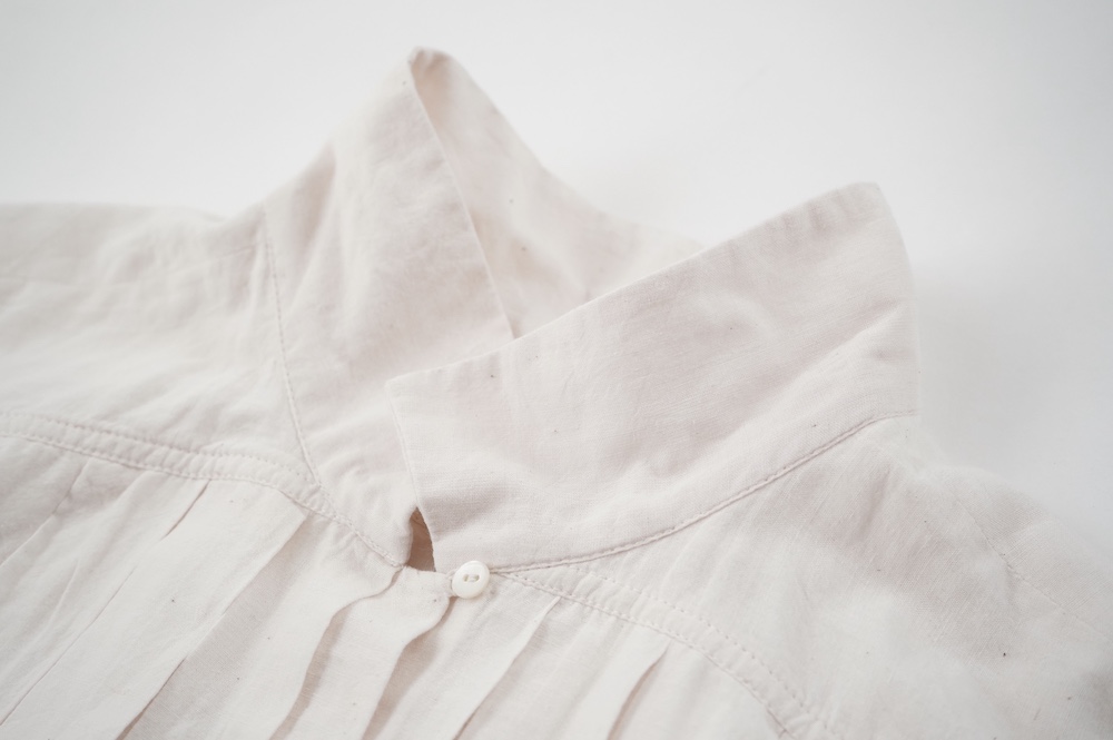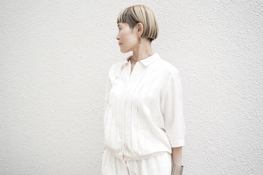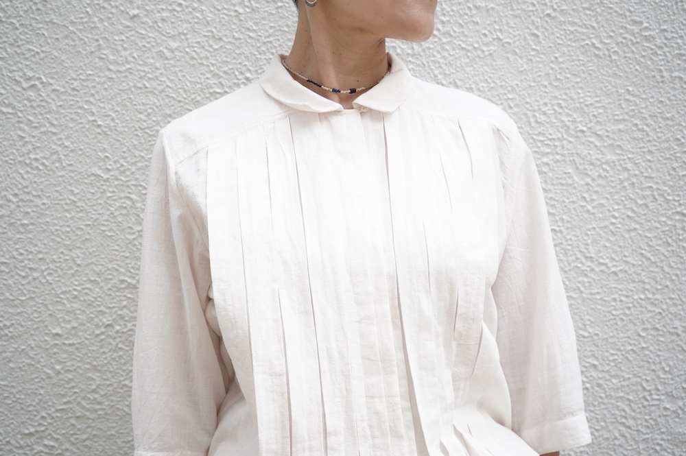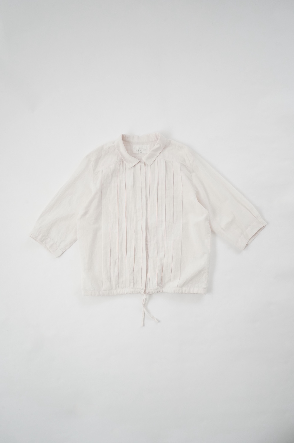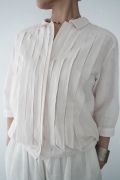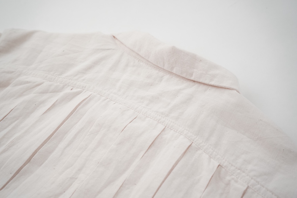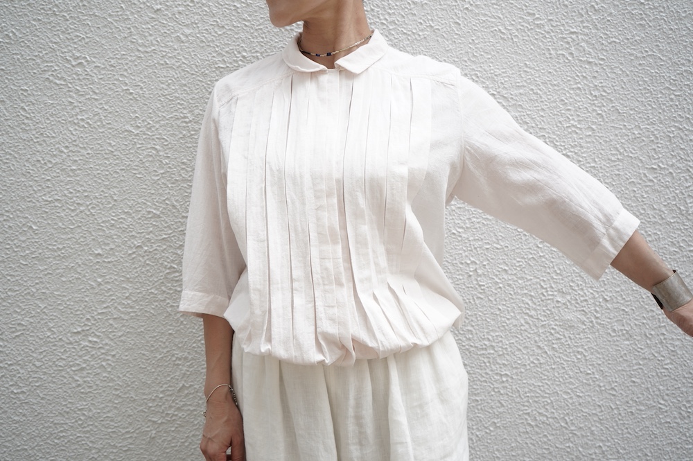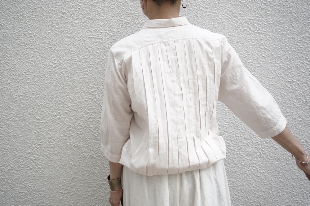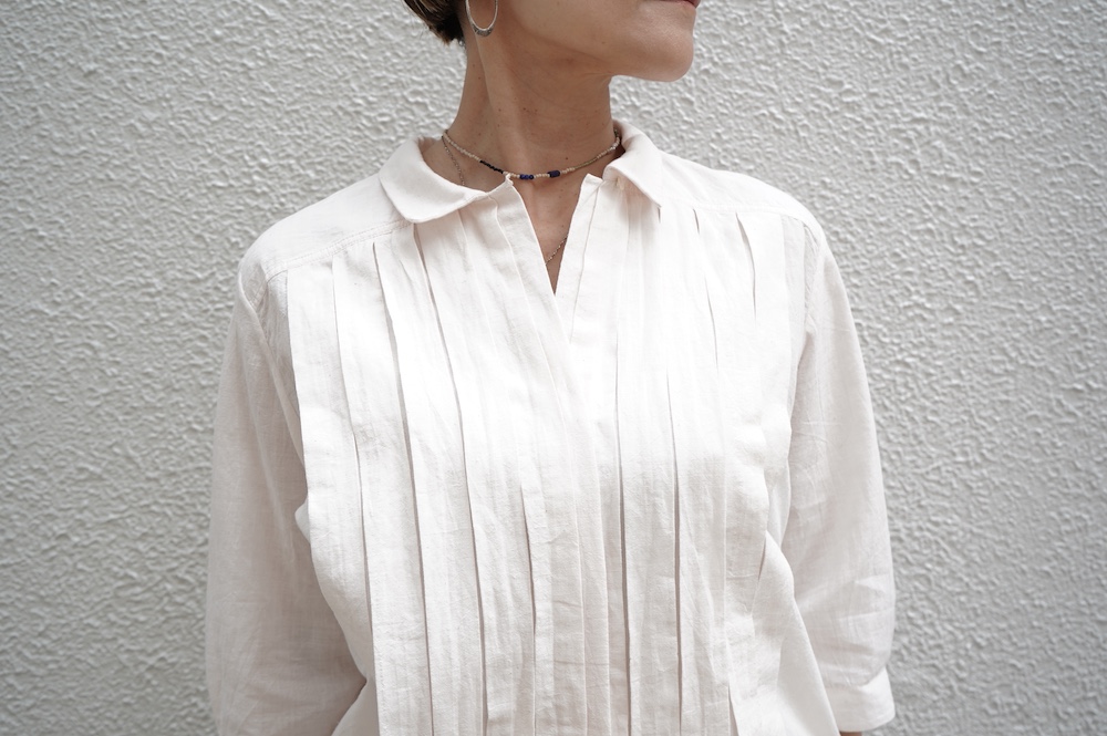デザインは、前後の身頃に施されたボックスプリーツが目を引くブラウス。襟は台襟のないやや小振りのレギュラーカラーで、中央の一番上のボタンは小さくループで留める仕様になっており、ボタンを開けると開襟シャツのようにも着ていただけます。裾はドローコードが施されているので、キュッと絞ってシルエットを変えることができます。袖は7〜8分袖で袖口にタックを入れてスッキリと見えるデザインに。シャツとしても、またジャケットのように羽織でも素敵なブラウスです。