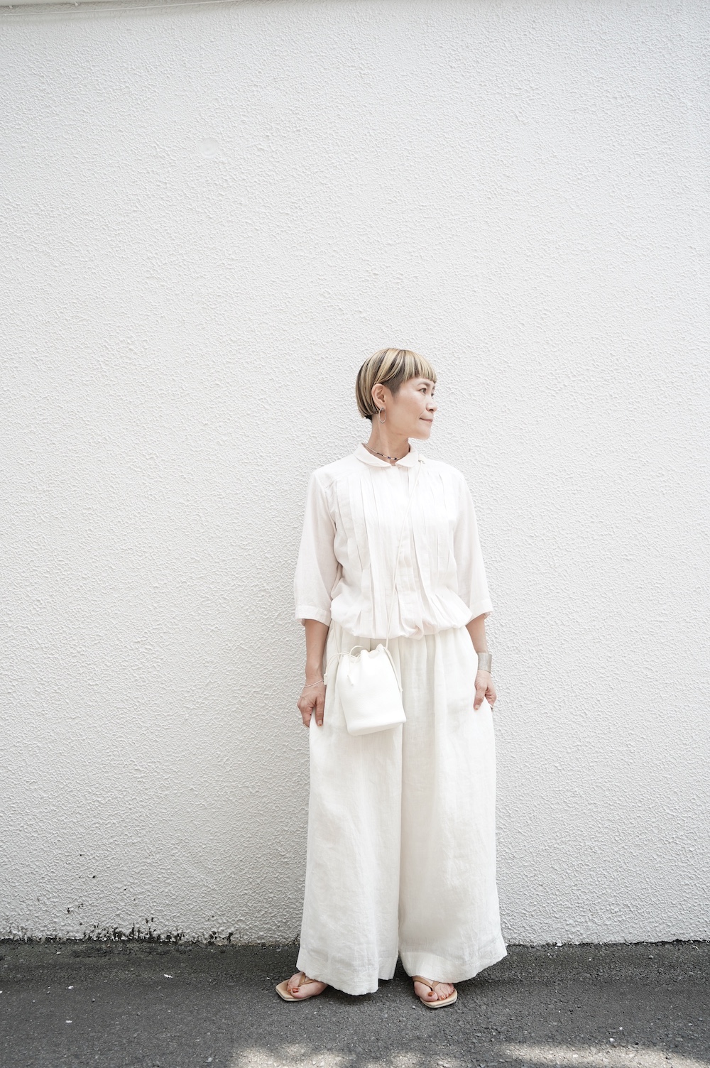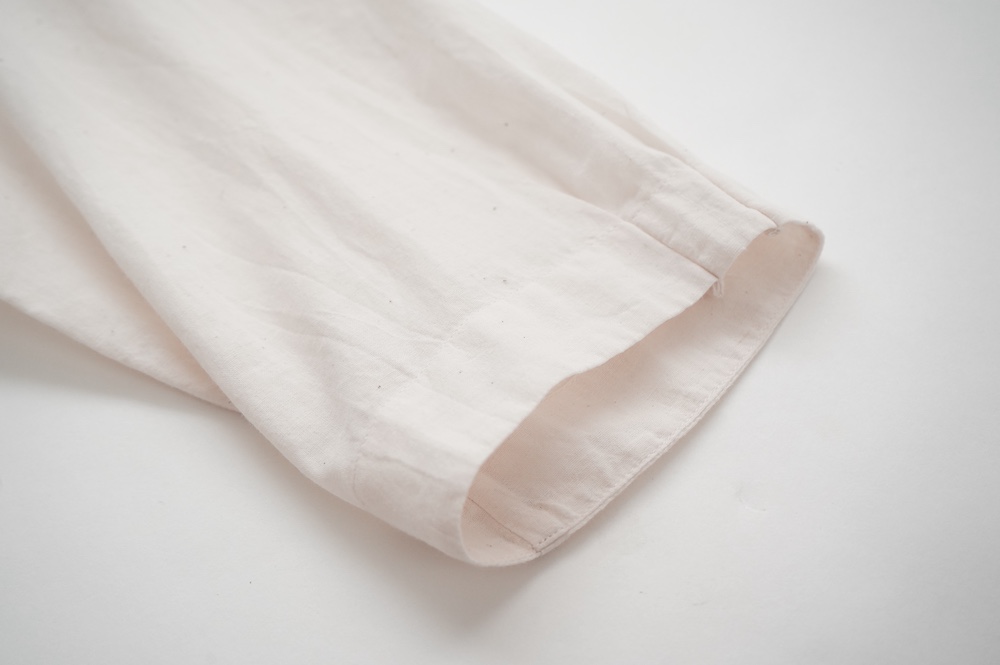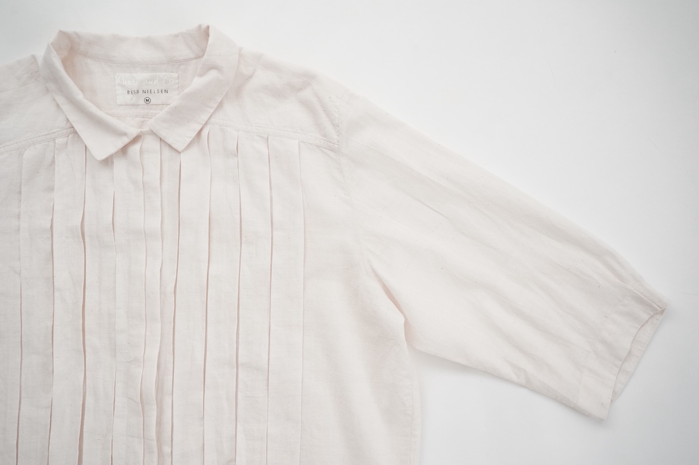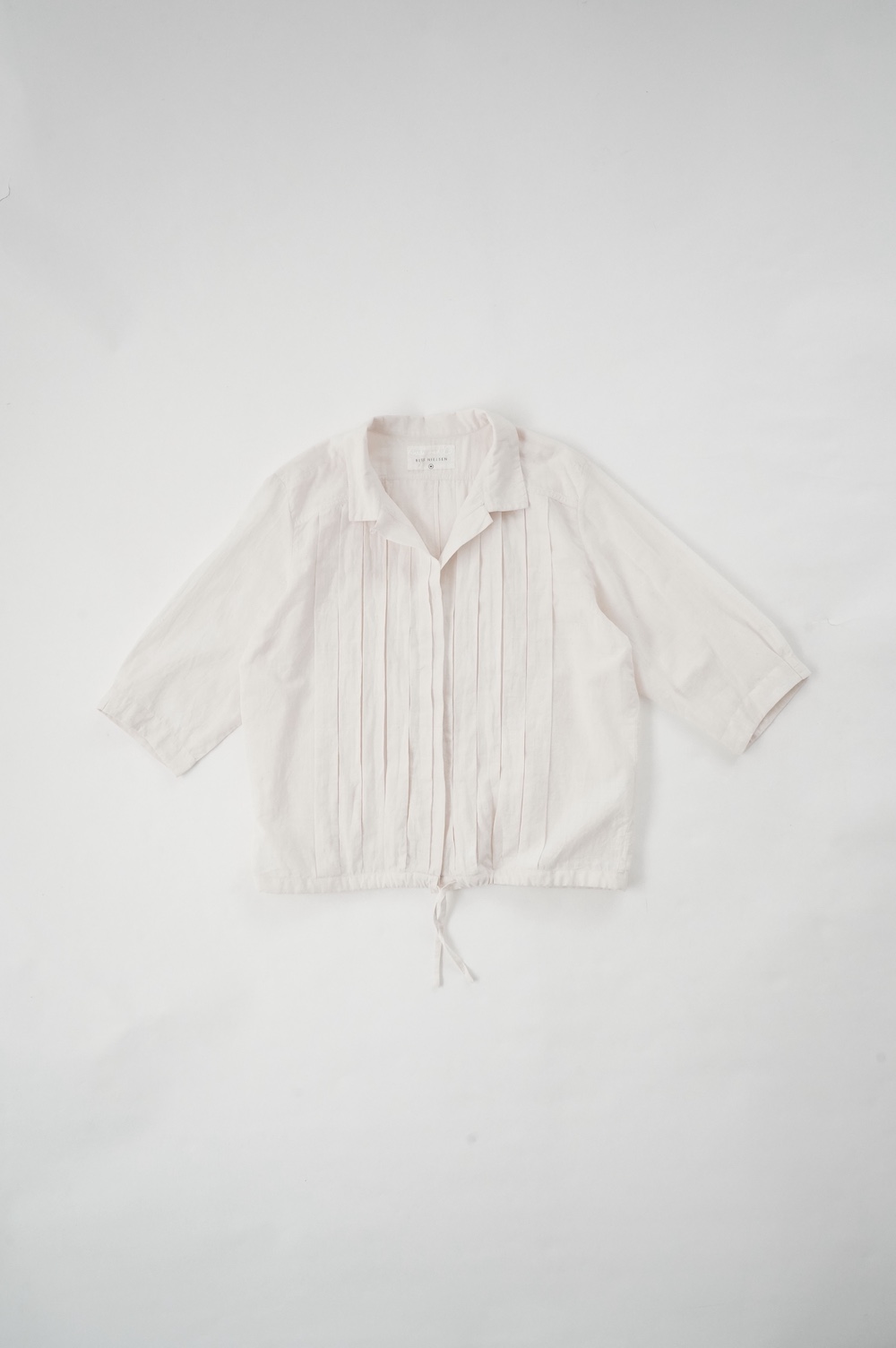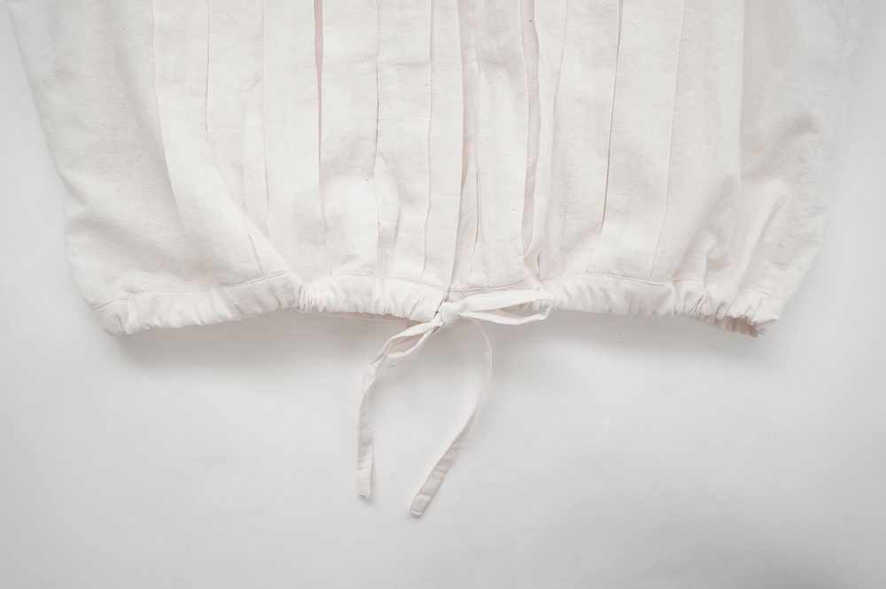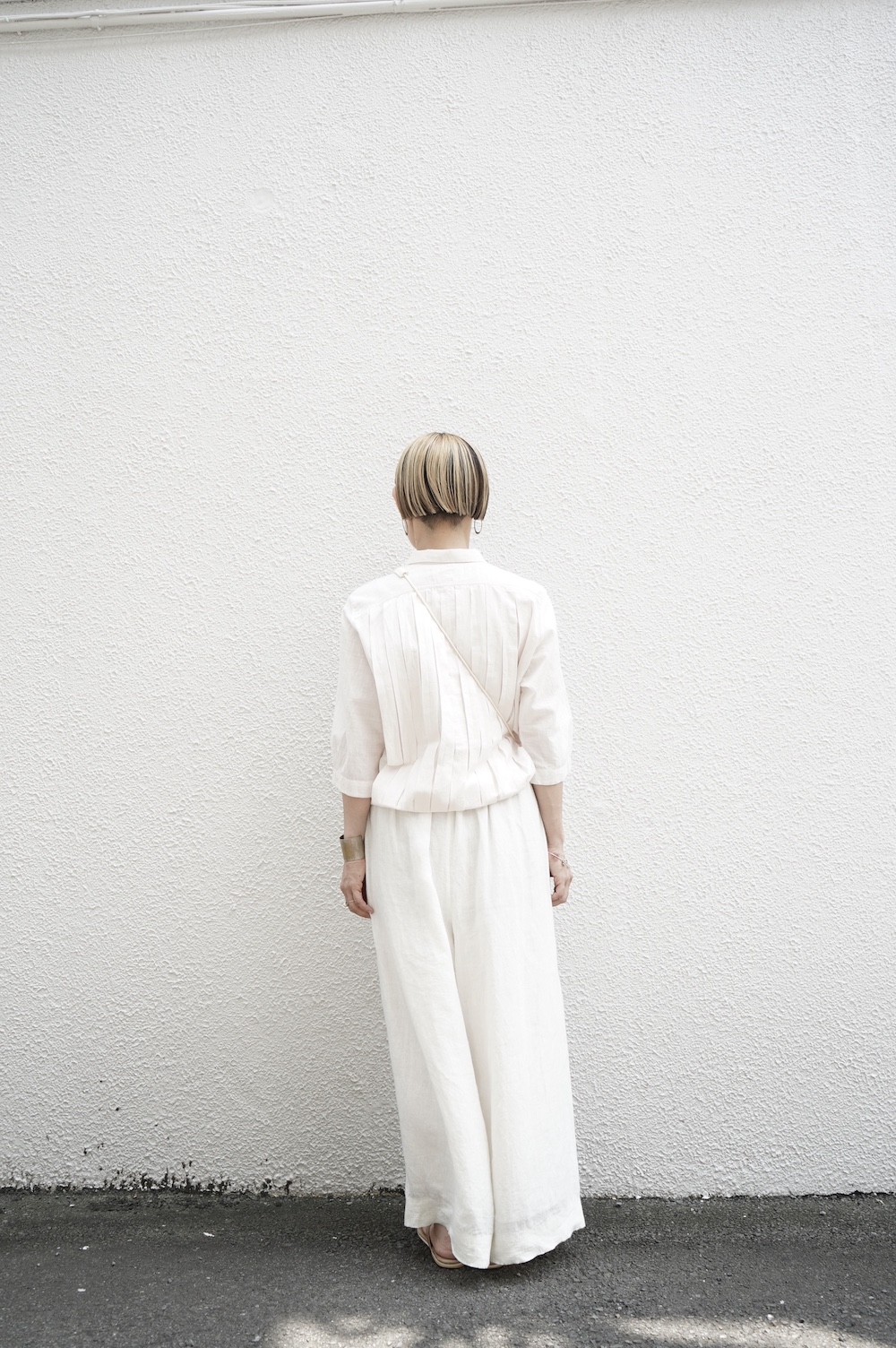 デザインは、前後の身頃に施されたボックスプリーツが目を引くブラウス。襟は台襟のないやや小振りのレギュラーカラーで、中央の一番上のボタンは小さくループで留める仕様になっており、ボタンを開けると開襟シャツのようにも着ていただけます。裾はドローコードが施されているので、キュッと絞ってシルエットを変えることができます。袖は7〜8分袖で袖口にタックを入れてスッキリと見えるデザインに。シャツとしても、またジャケットのように羽織でも素敵なブラウスです。
