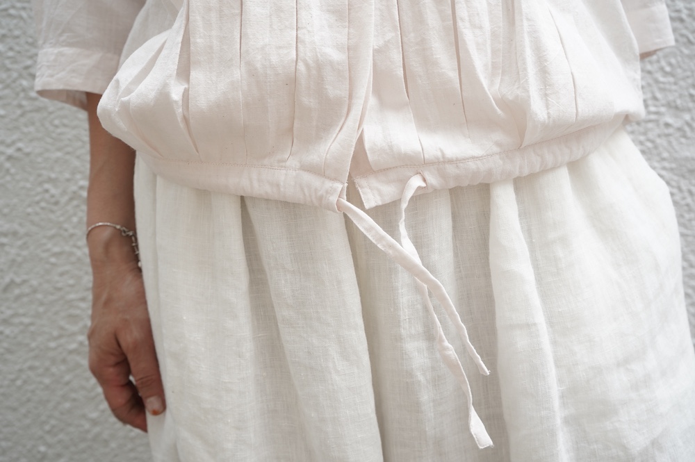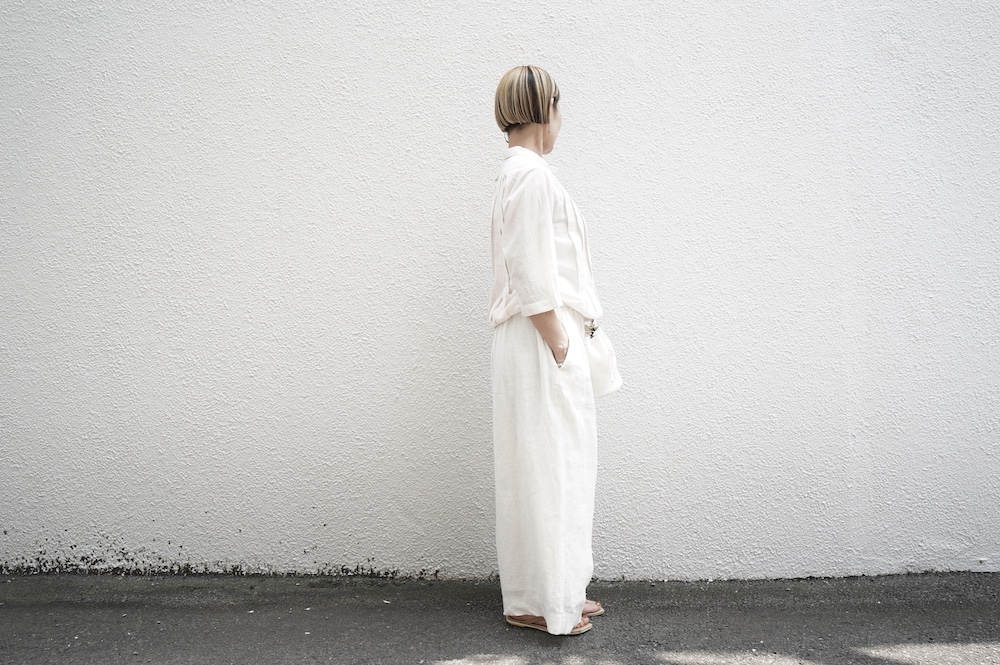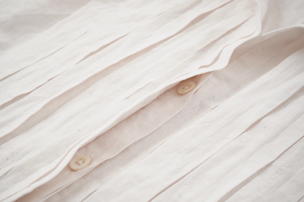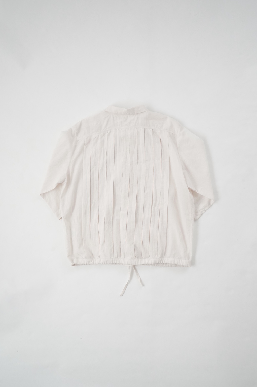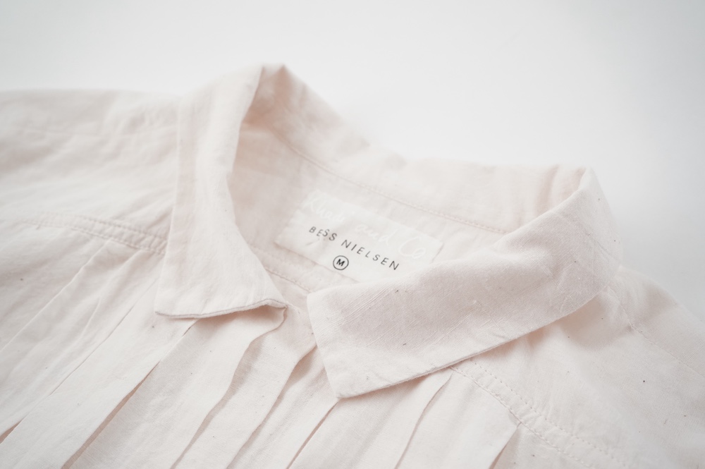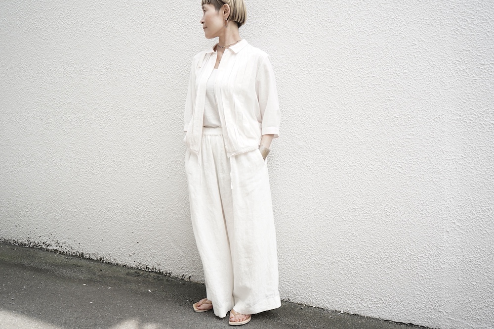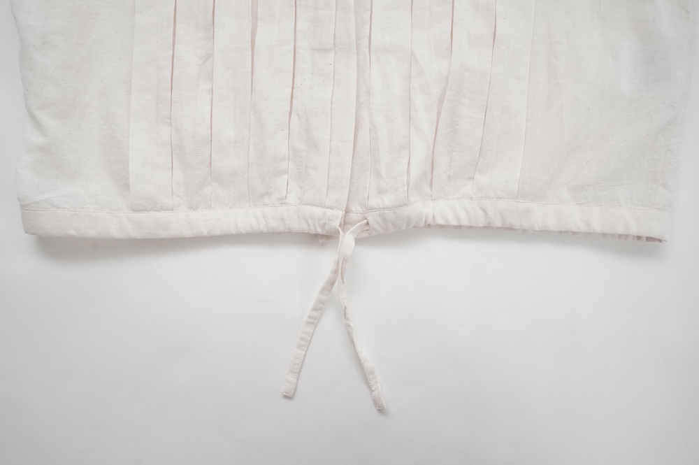 デザインは、前後の身頃に施されたボックスプリーツが目を引くブラウス。襟は台襟のないやや小振りのレギュラーカラーで、中央の一番上のボタンは小さくループで留める仕様になっており、ボタンを開けると開襟シャツのようにも着ていただけます。裾はドローコードが施されているので、キュッと絞ってシルエットを変えることができます。袖は7〜8分袖で袖口にタックを入れてスッキリと見えるデザインに。シャツとしても、またジャケットのように羽織でも素敵なブラウスです。