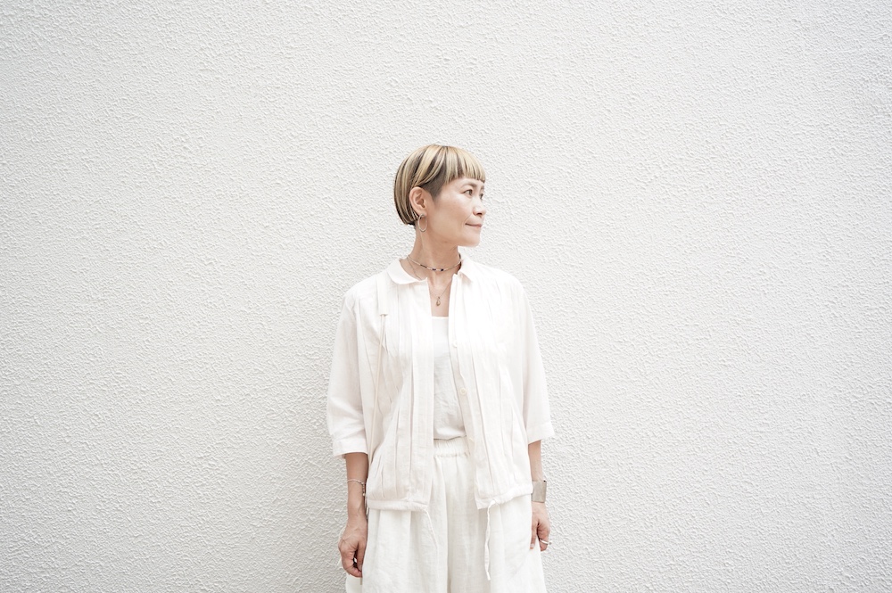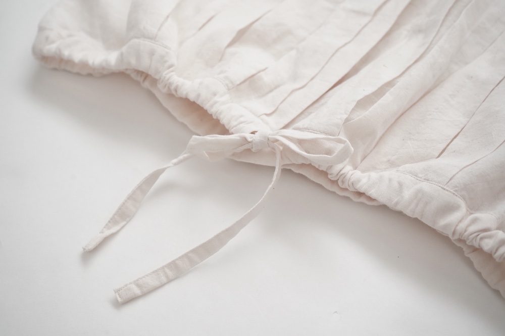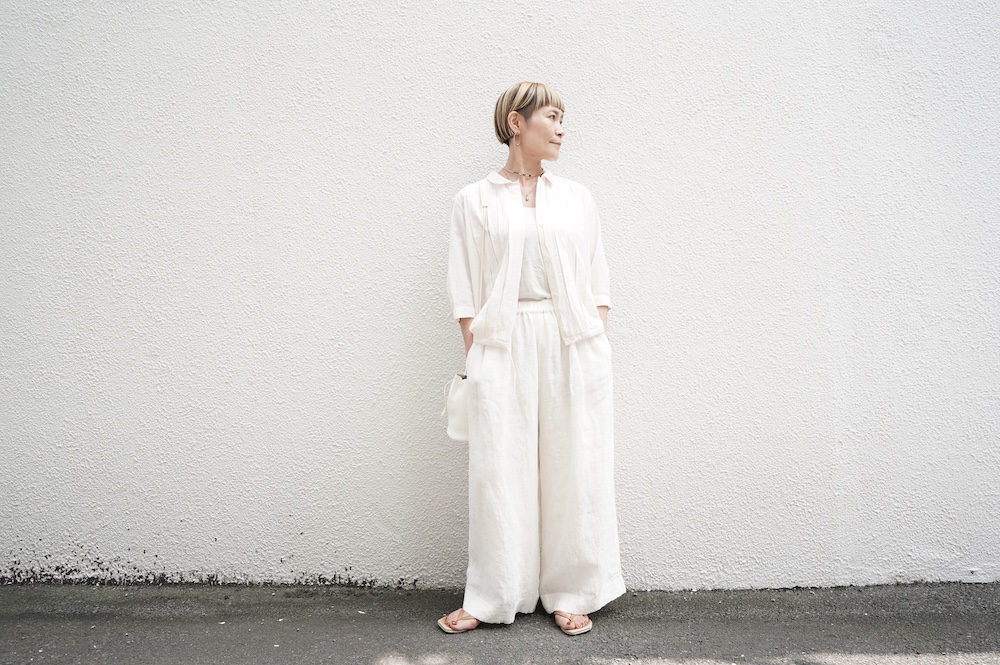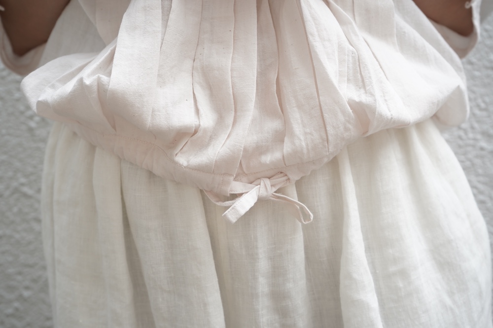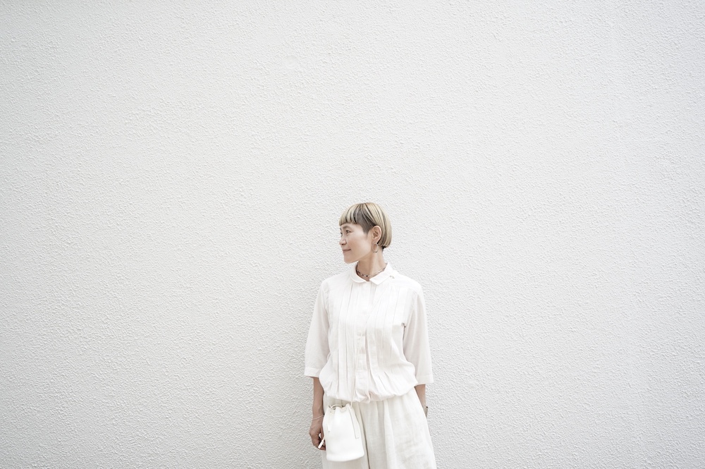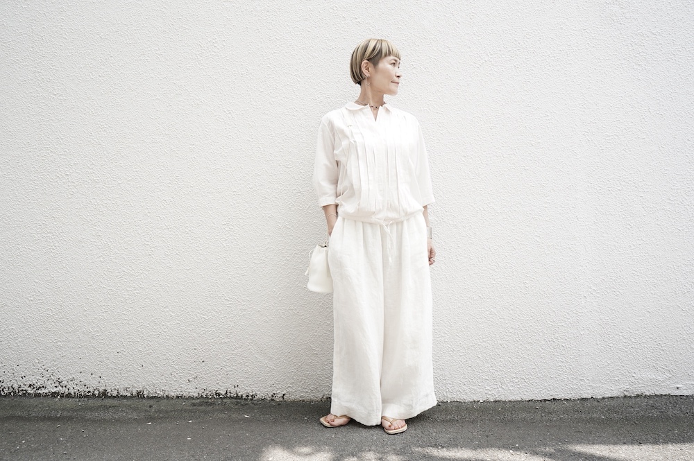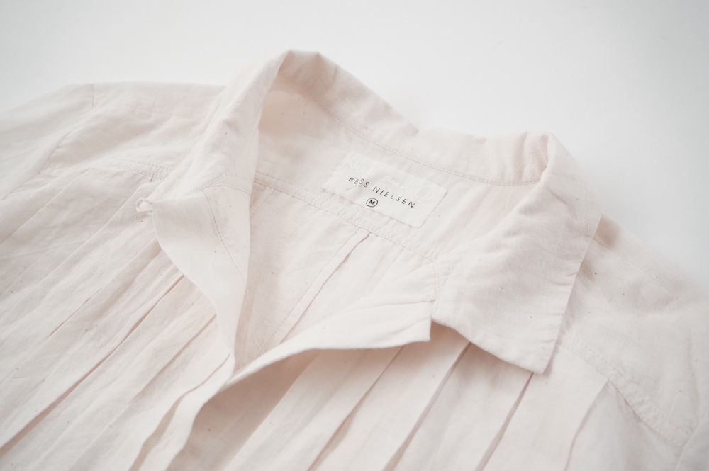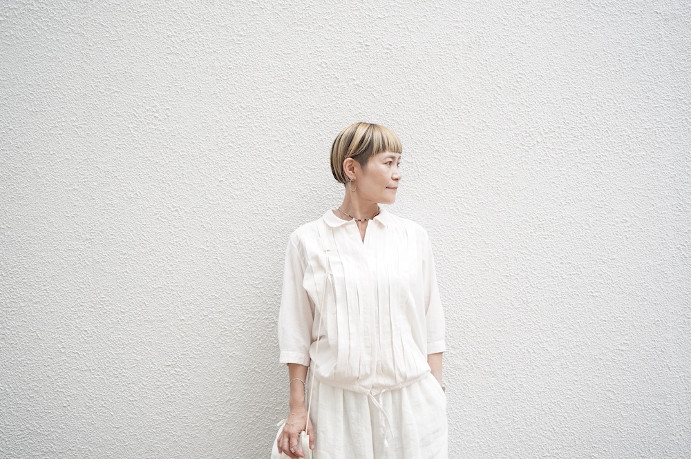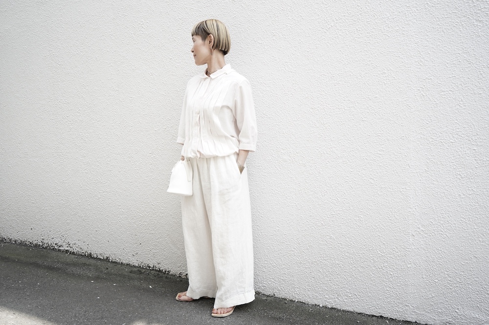 デザインは、前後の身頃に施されたボックスプリーツが目を引くブラウス。襟は台襟のないやや小振りのレギュラーカラーで、中央の一番上のボタンは小さくループで留める仕様になっており、ボタンを開けると開襟シャツのようにも着ていただけます。裾はドローコードが施されているので、キュッと絞ってシルエットを変えることができます。袖は7〜8分袖で袖口にタックを入れてスッキリと見えるデザインに。シャツとしても、またジャケットのように羽織でも素敵なブラウスです。