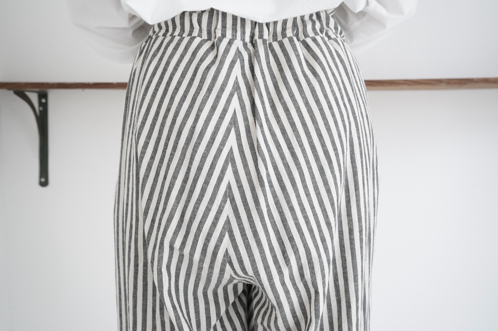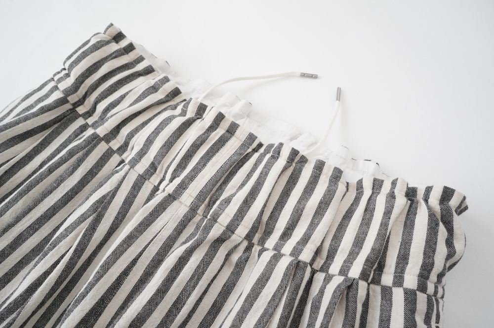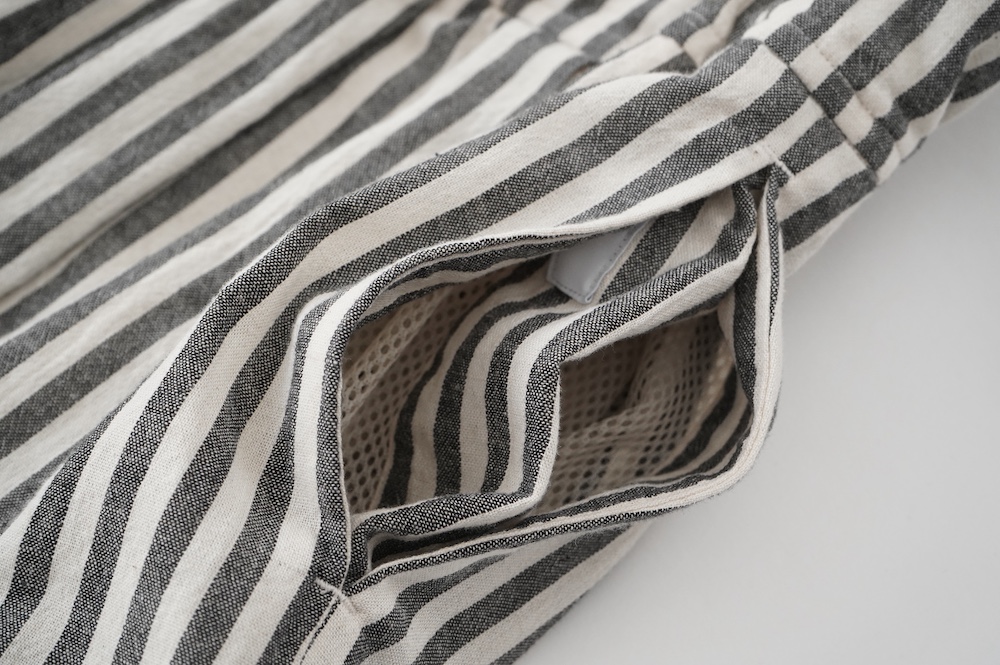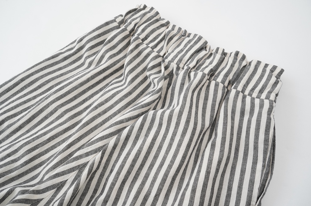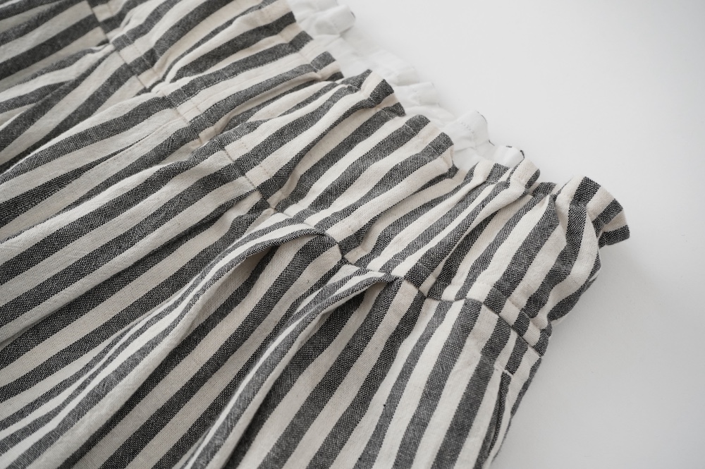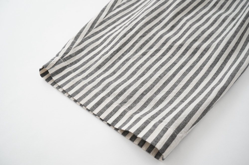 経糸がコットン、緯糸がコットンリネンのシーチング素材で、タテヨコ20番手のシーチングらしいシーチングです。生地は仕上げにスターチ加工(糊付け)を施しており、軽やかながら適度な張り感とドライタッチな感触が春夏らしいストライプです。