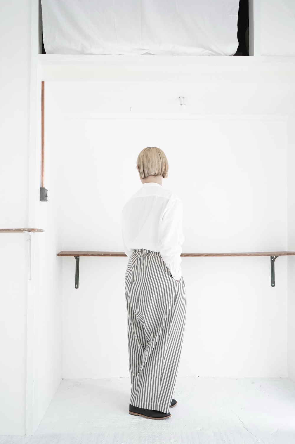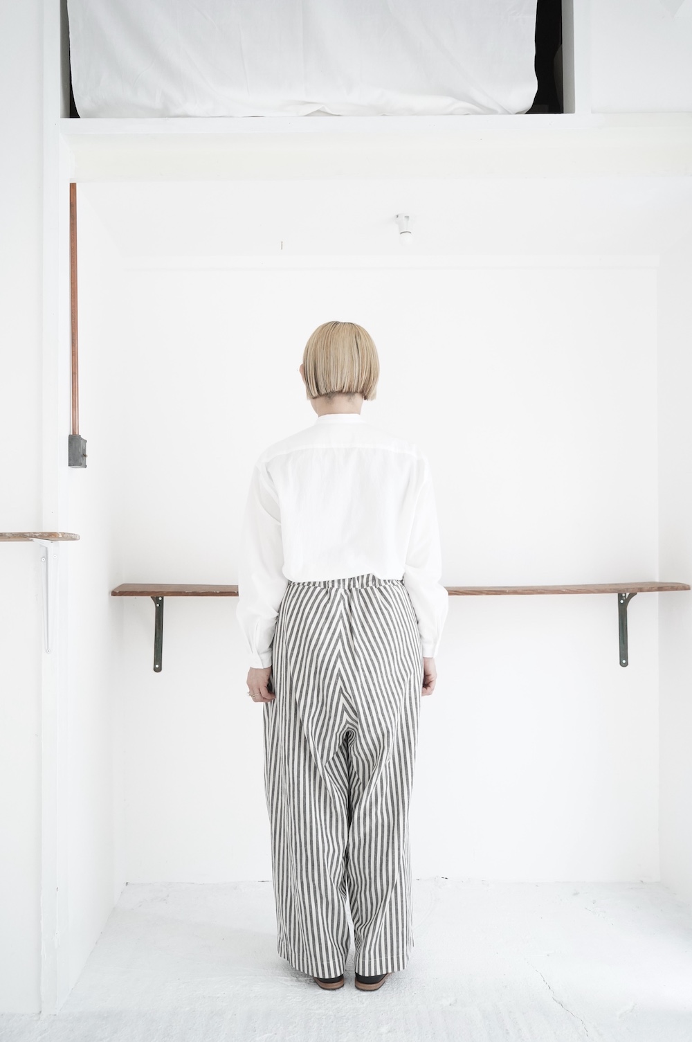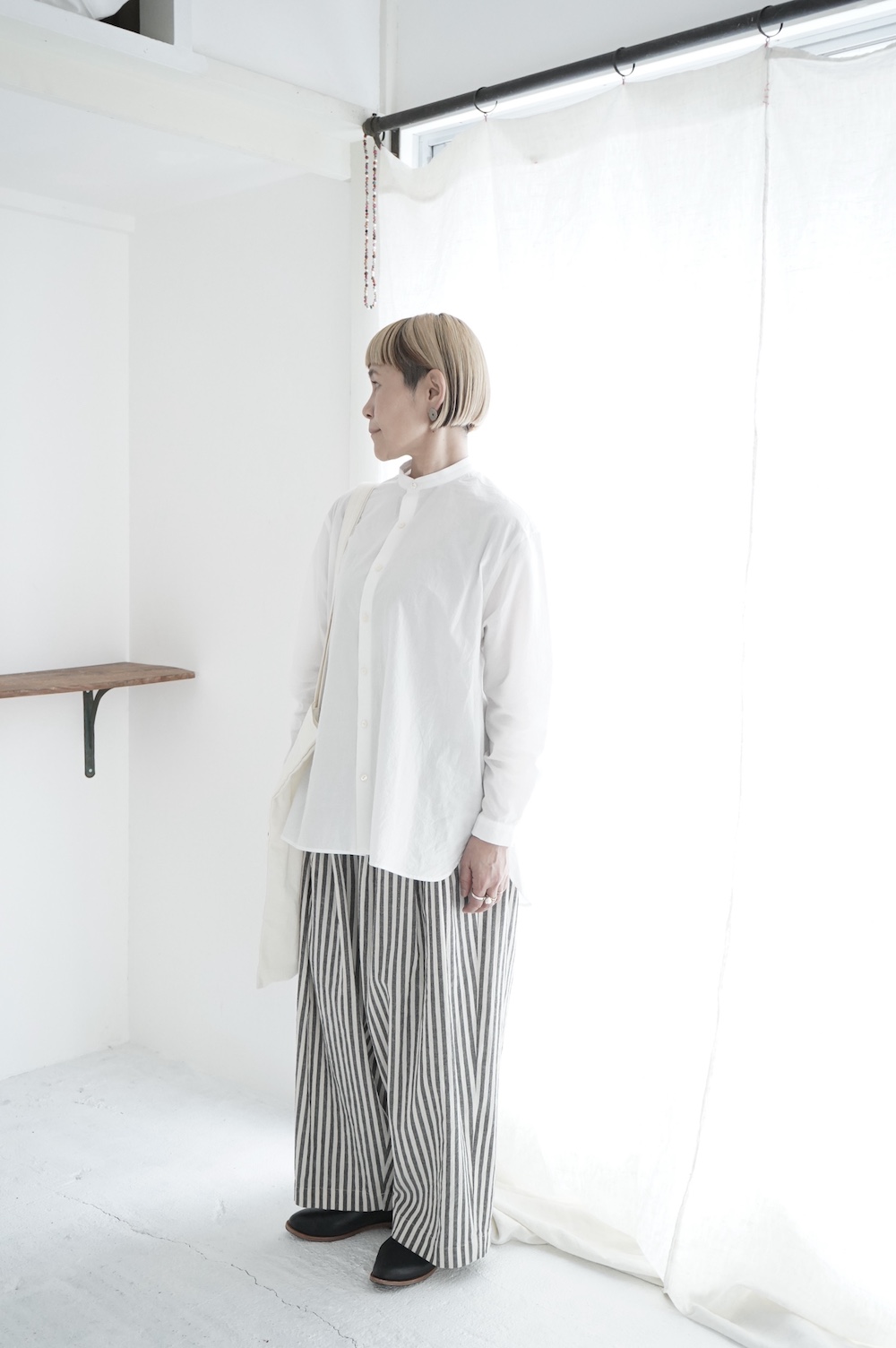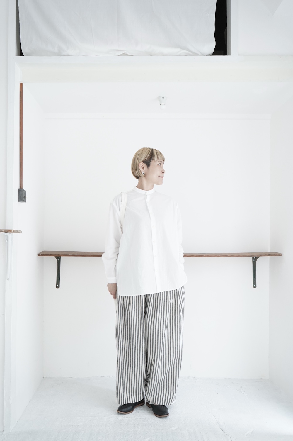 経糸がコットン、緯糸がコットンリネンのシーチング素材で、タテヨコ20番手のシーチングらしいシーチングです。生地は仕上げにスターチ加工(糊付け)を施しており、軽やかながら適度な張り感とドライタッチな感触が春夏らしいストライプです。