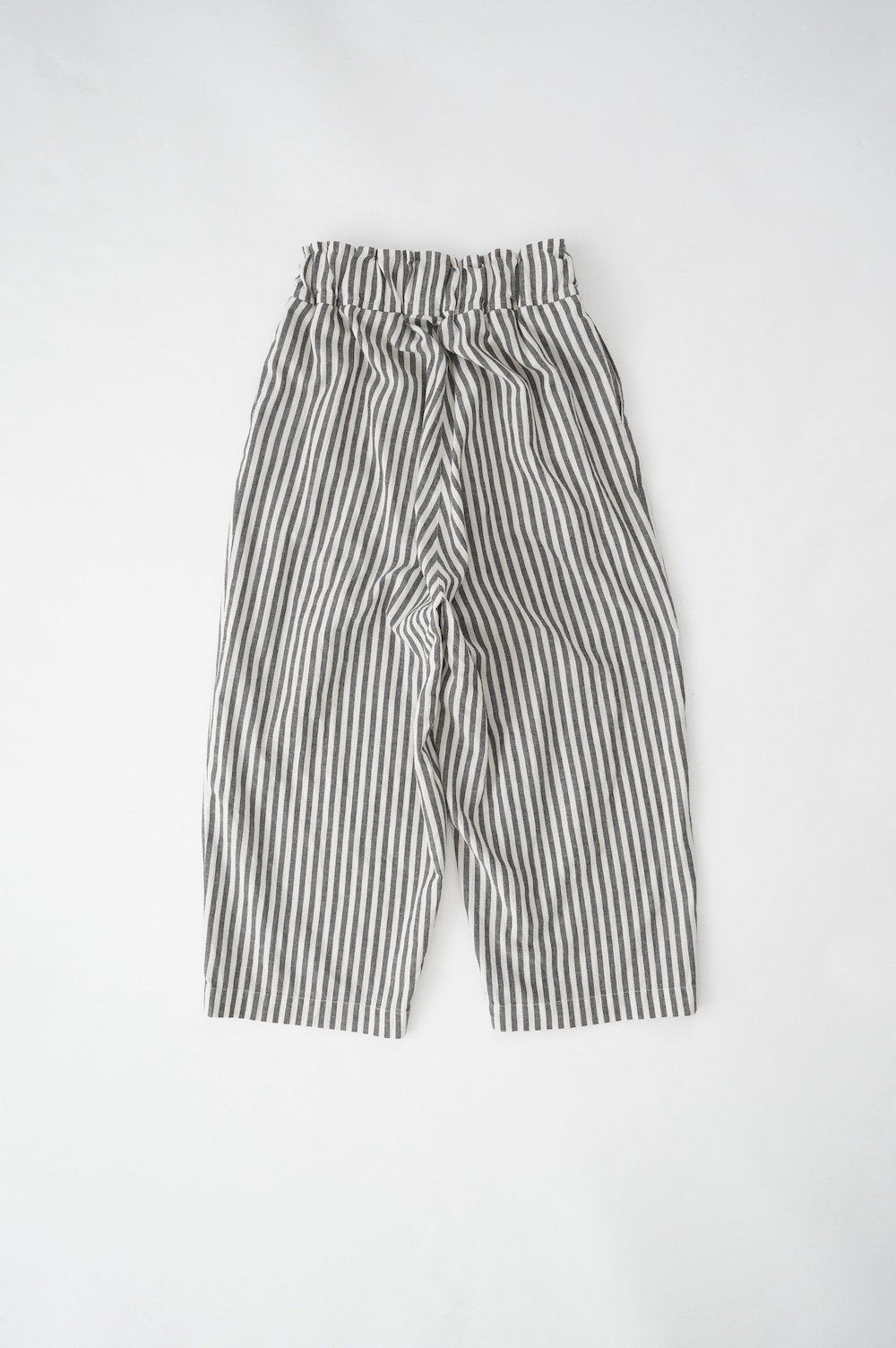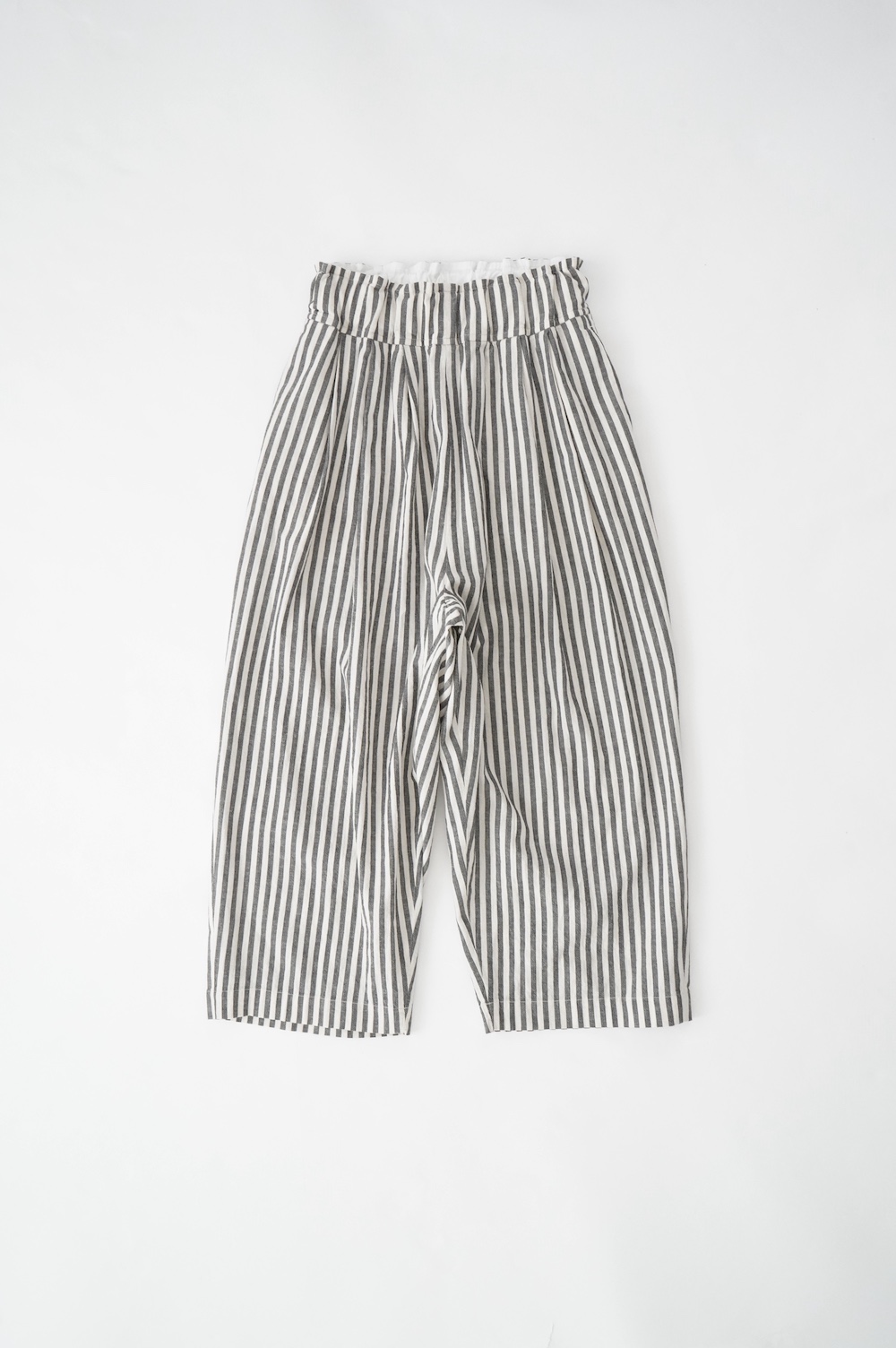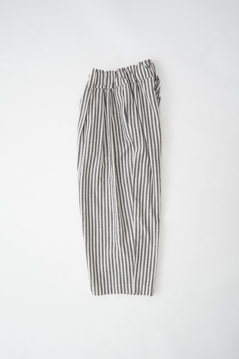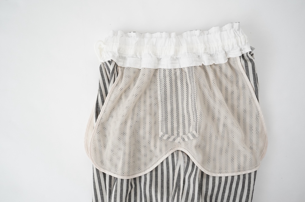 経糸がコットン、緯糸がコットンリネンのシーチング素材で、タテヨコ20番手のシーチングらしいシーチングです。生地は仕上げにスターチ加工(糊付け)を施しており、軽やかながら適度な張り感とドライタッチな感触が春夏らしいストライプです。