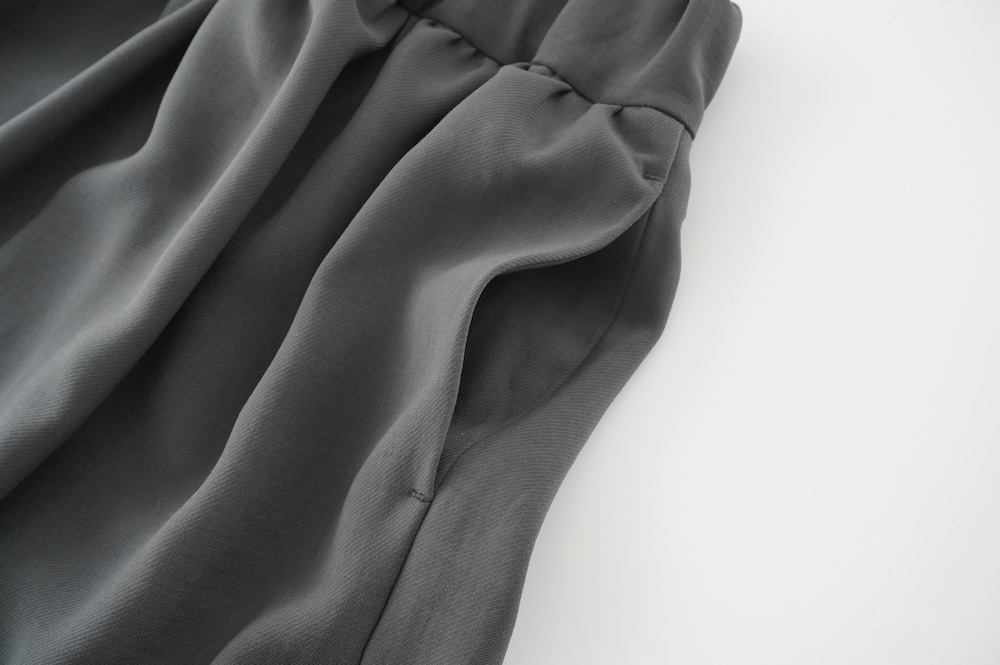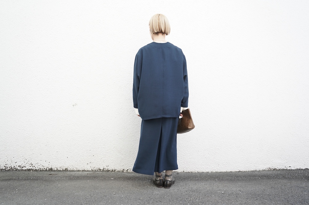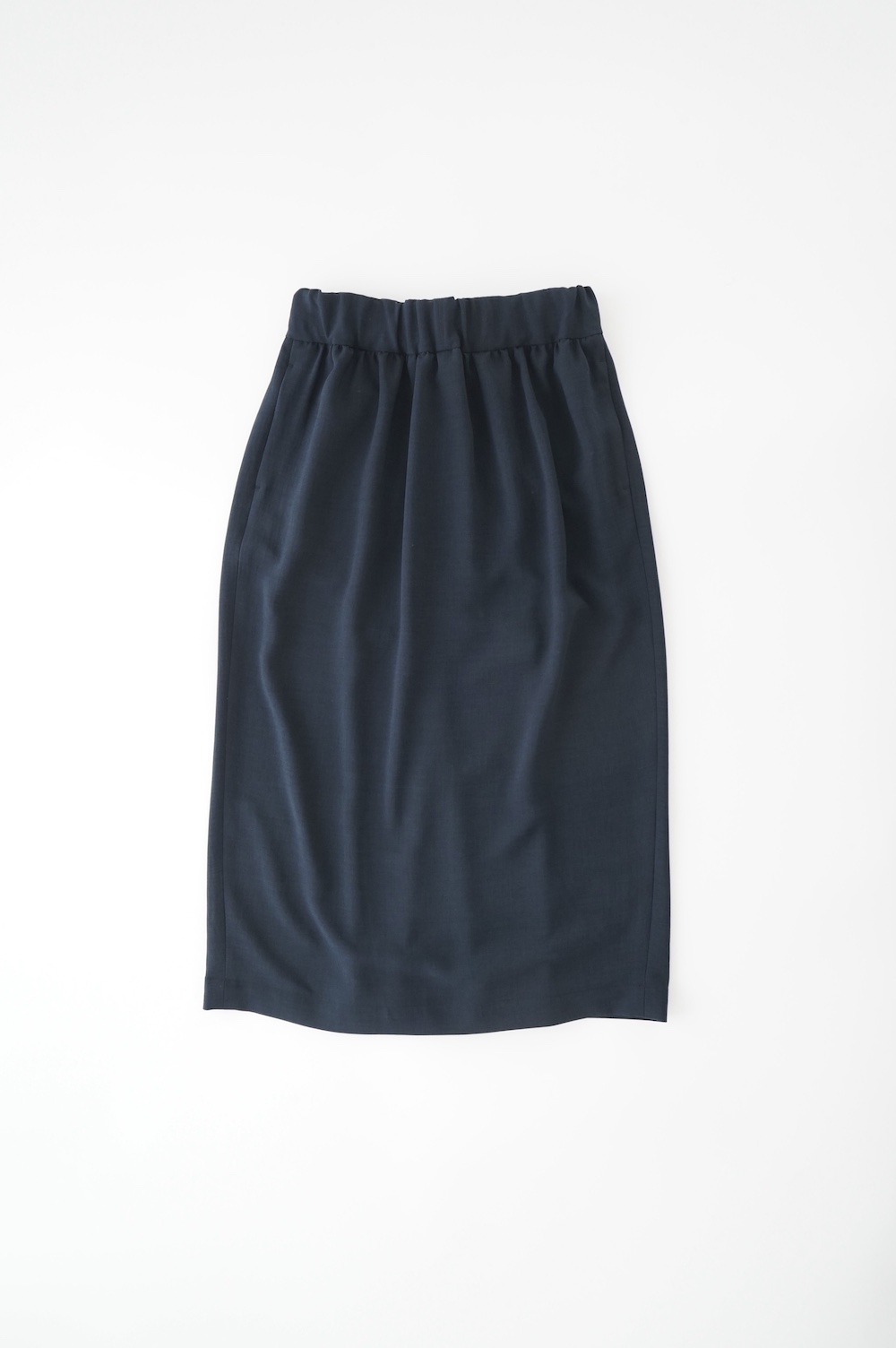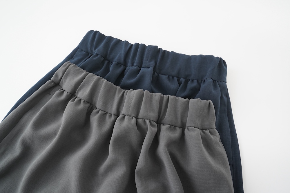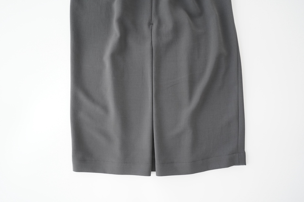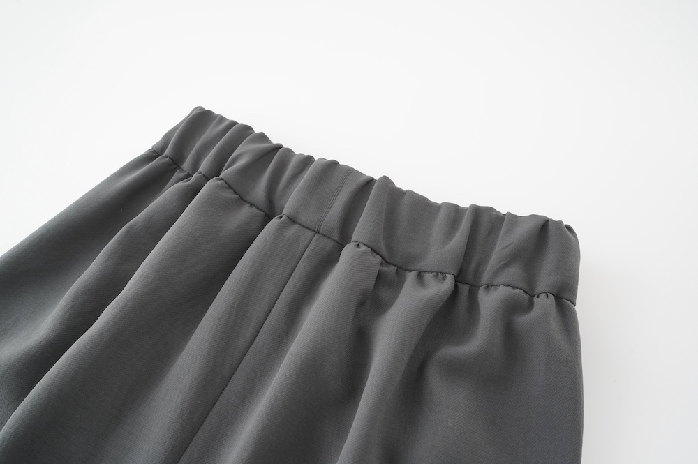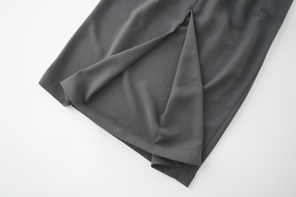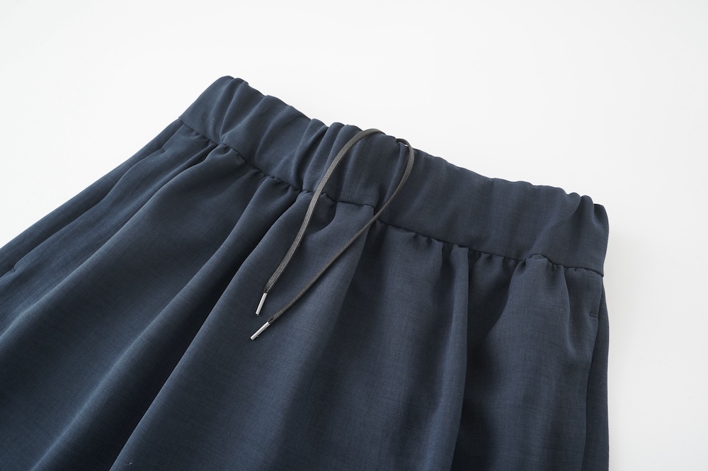 デザインは、テーパードシルエットのロングスカート。バックスリットが実はインバーテッドプリーツになっているので足さばきも良く、足が見えないようになっています。ウエストはゴムと紐。腰回りはゆったりとしていますが、裾にかけてテーパードシルエットになっているのでスッキリとした印象に。ブラウスやTシャツでカジュアルに合わせてももちろんのこと、セットアップのジャケットと合わせればお仕事や式典などにも活躍します。春のさまざまな装いにどうぞ。