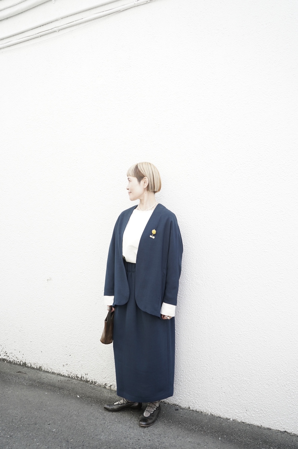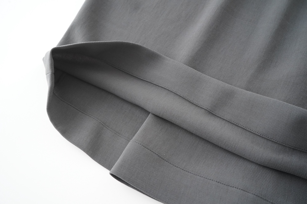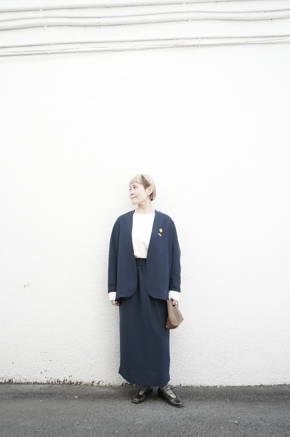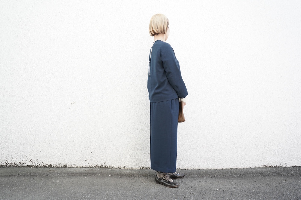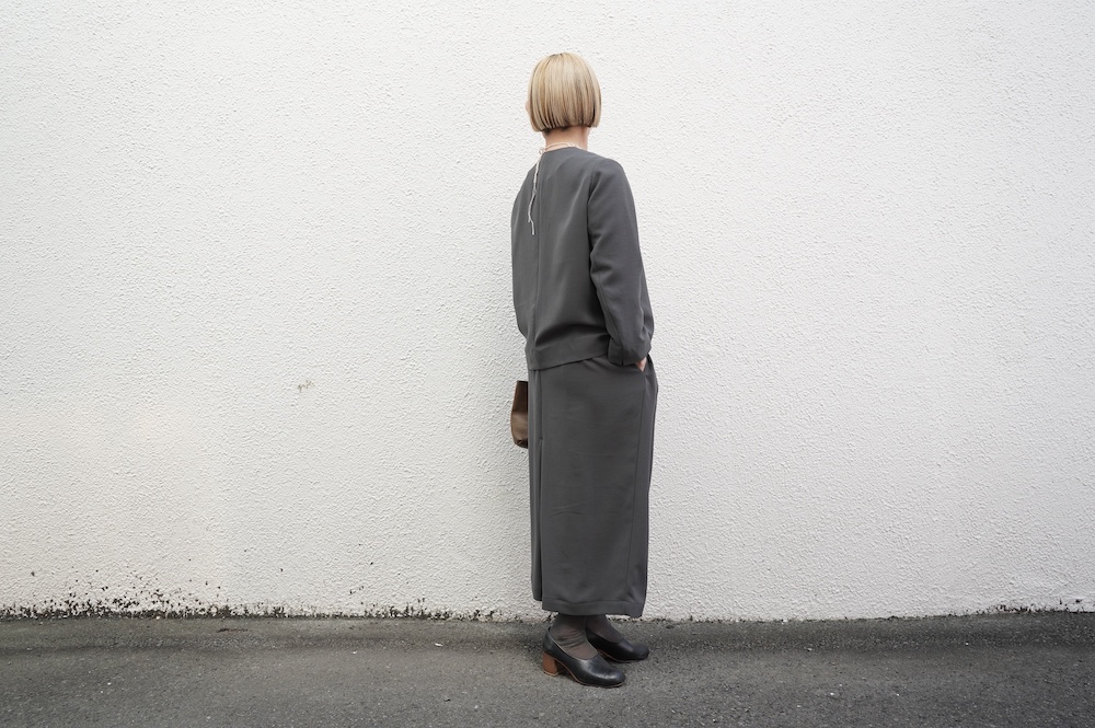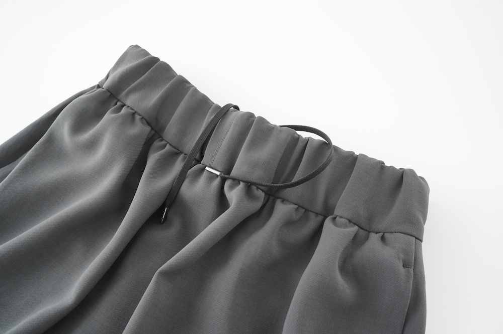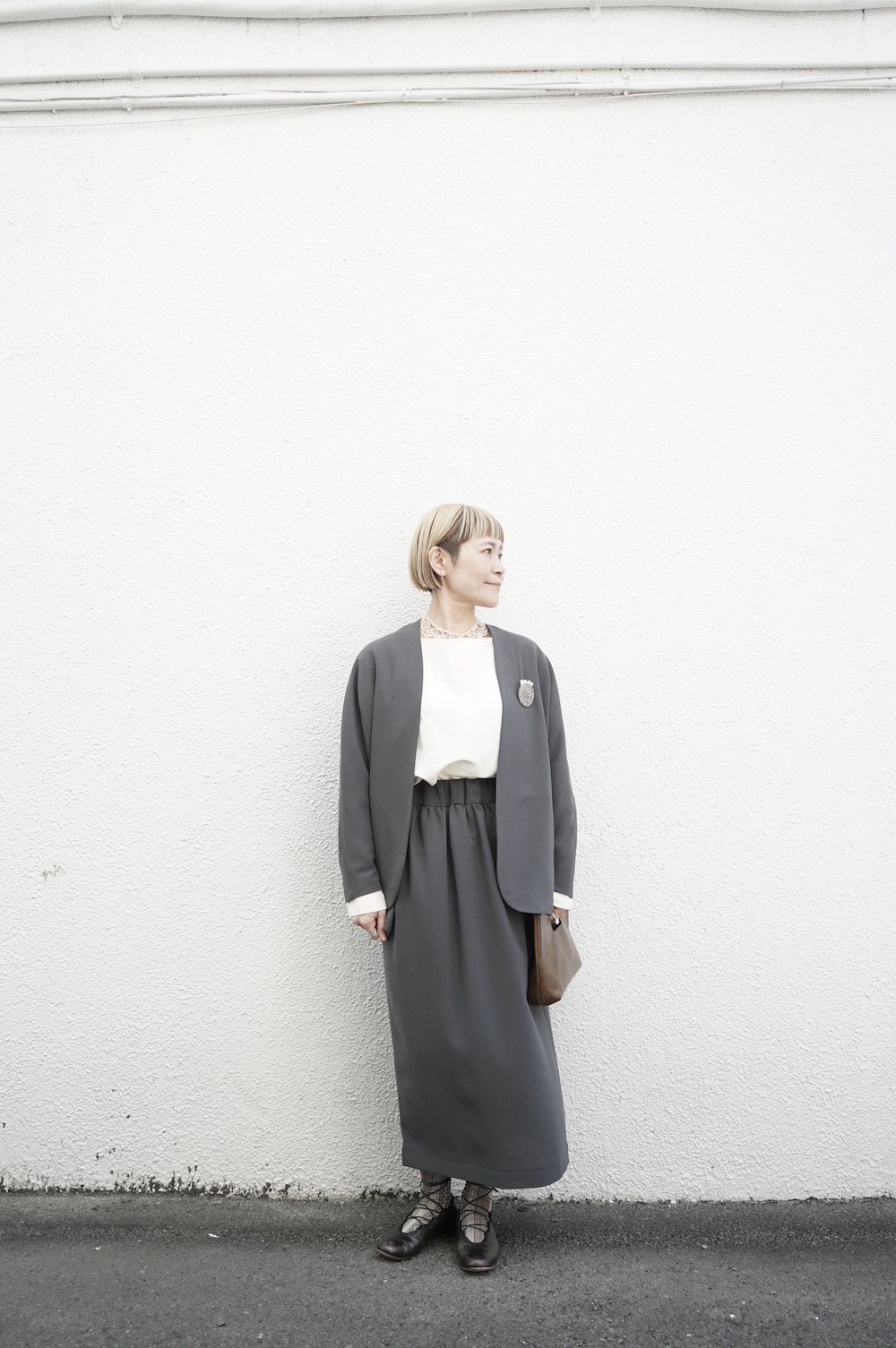 デザインは、テーパードシルエットのロングスカート。バックスリットが実はインバーテッドプリーツになっているので足さばきも良く、足が見えないようになっています。ウエストはゴムと紐。腰回りはゆったりとしていますが、裾にかけてテーパードシルエットになっているのでスッキリとした印象に。ブラウスやTシャツでカジュアルに合わせてももちろんのこと、セットアップのジャケットと合わせればお仕事や式典などにも活躍します。春のさまざまな装いにどうぞ。