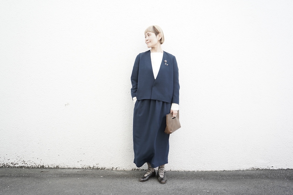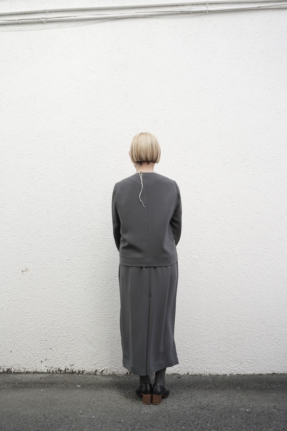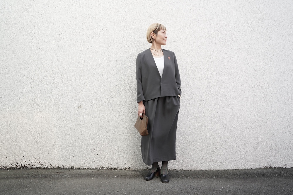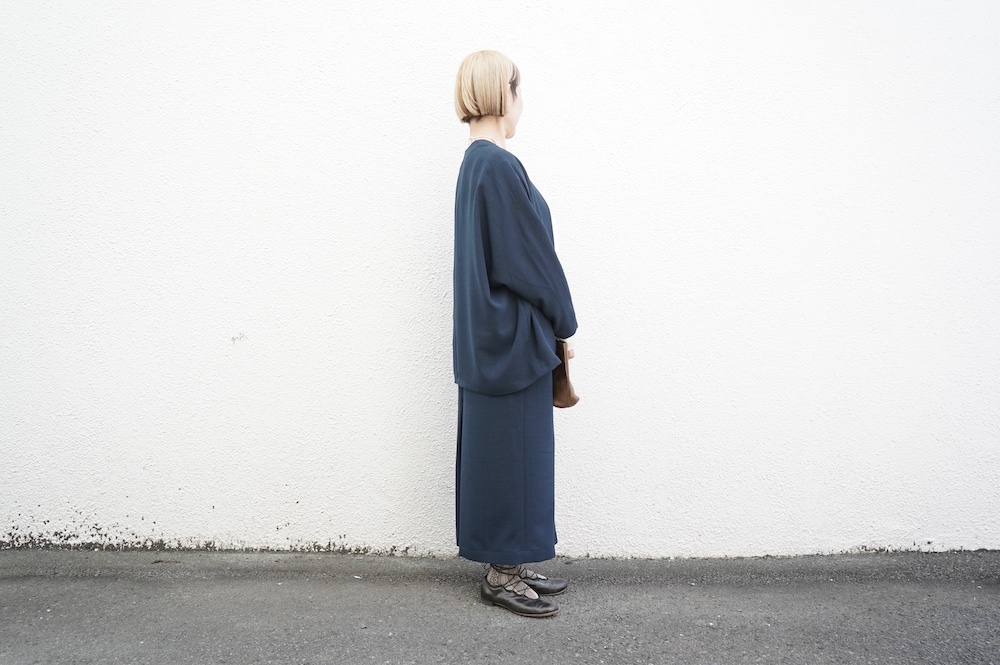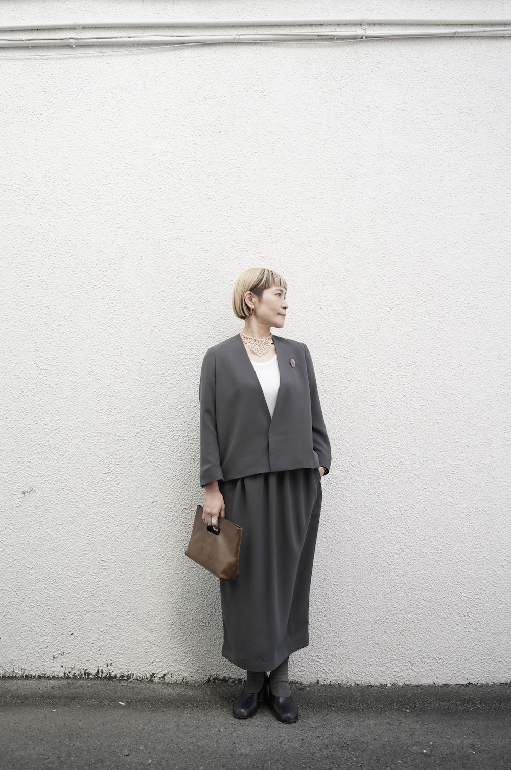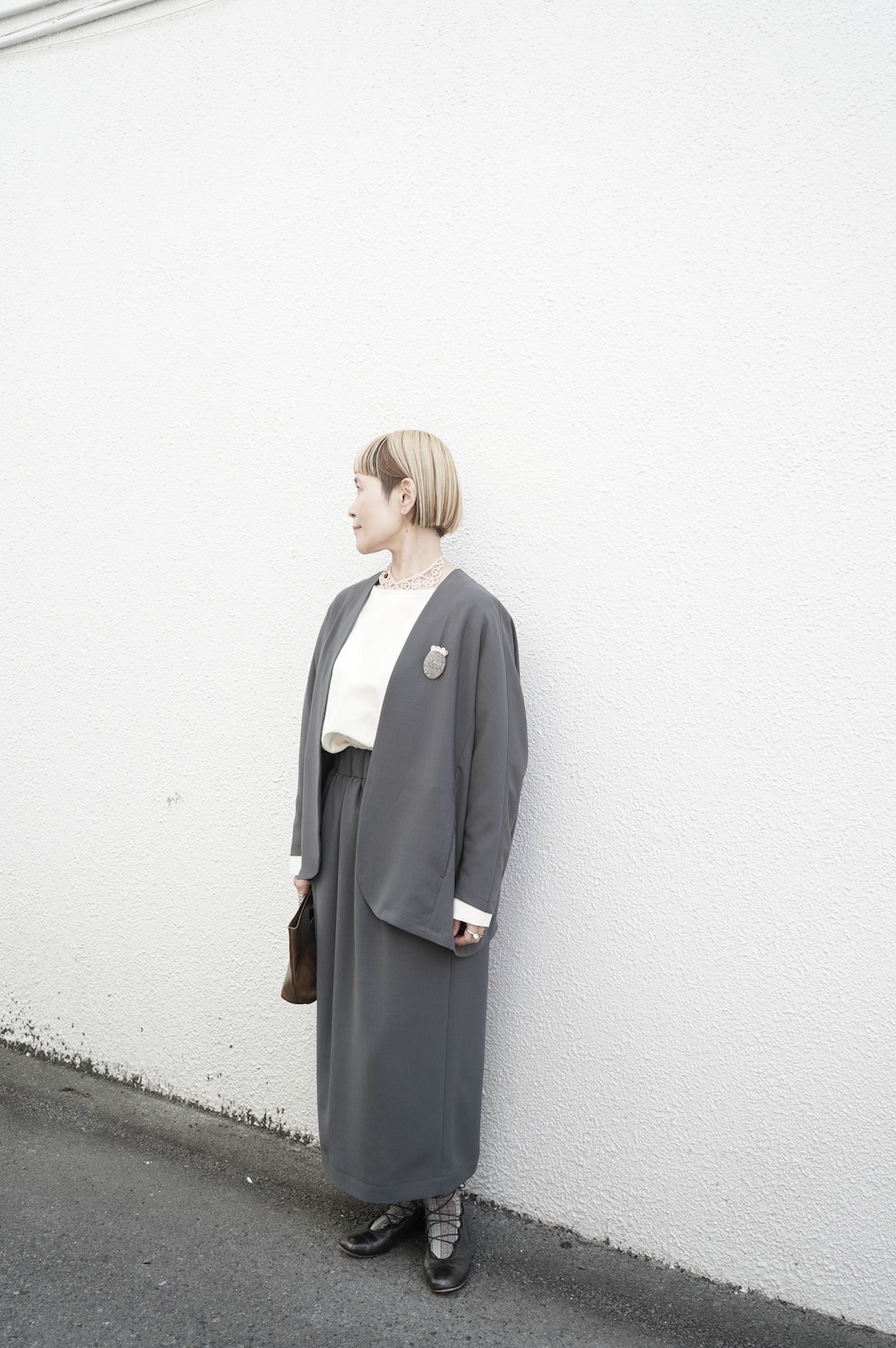 デザインは、テーパードシルエットのロングスカート。バックスリットが実はインバーテッドプリーツになっているので足さばきも良く、足が見えないようになっています。ウエストはゴムと紐。腰回りはゆったりとしていますが、裾にかけてテーパードシルエットになっているのでスッキリとした印象に。ブラウスやTシャツでカジュアルに合わせてももちろんのこと、セットアップのジャケットと合わせればお仕事や式典などにも活躍します。春のさまざまな装いにどうぞ。