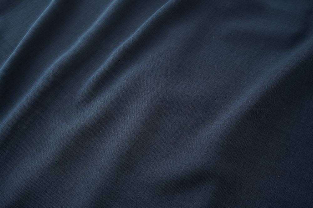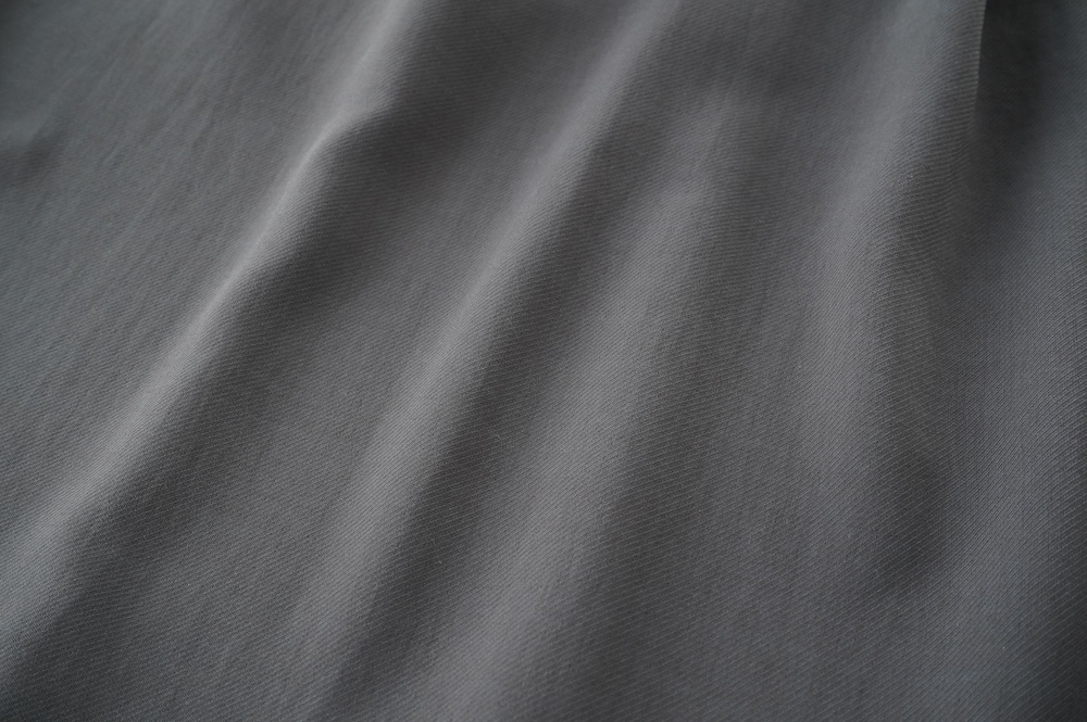 強撚のポリエステル糸を使用したカルゼ織りの生地に、ナチュラル感を出すSV加工(ビンテージ加工)を施しています。落ち感と柔らかな手触りになっており、シワにもなりにくい素材です。また繊細な生地に見えて、家庭洗濯可能なのも嬉しいポイントです。