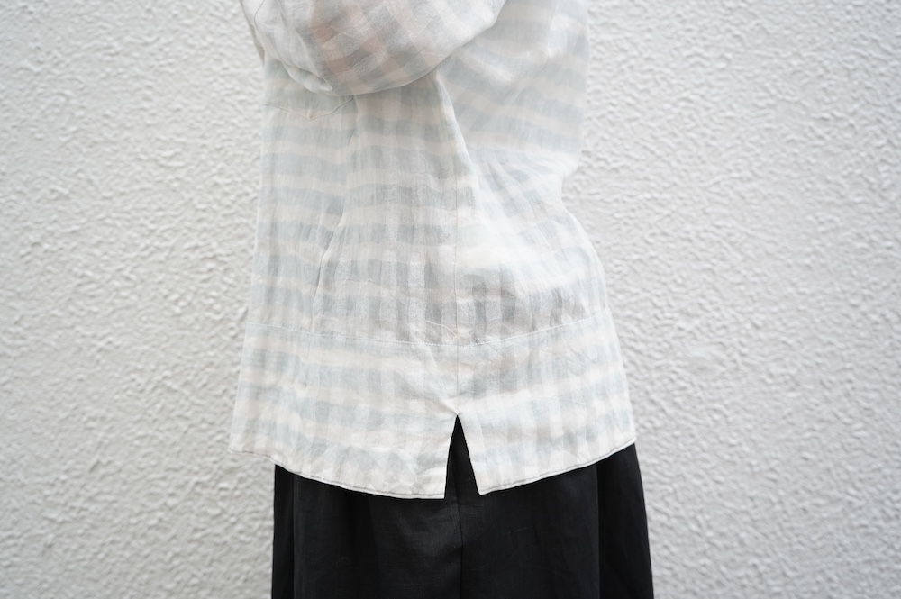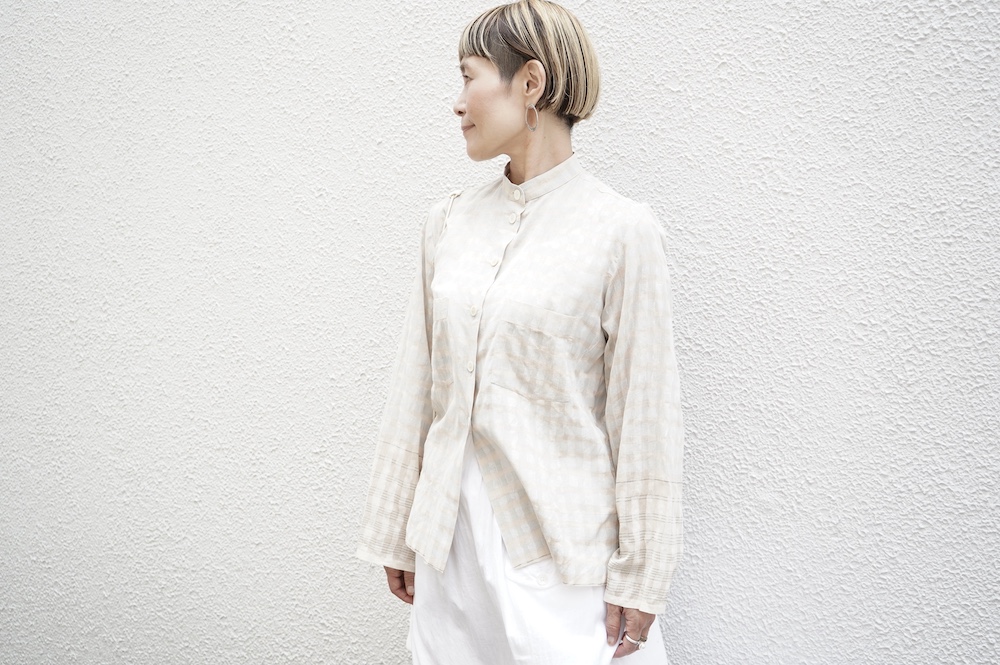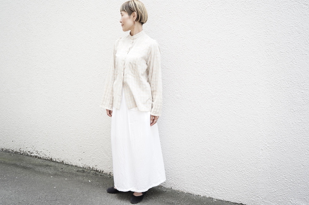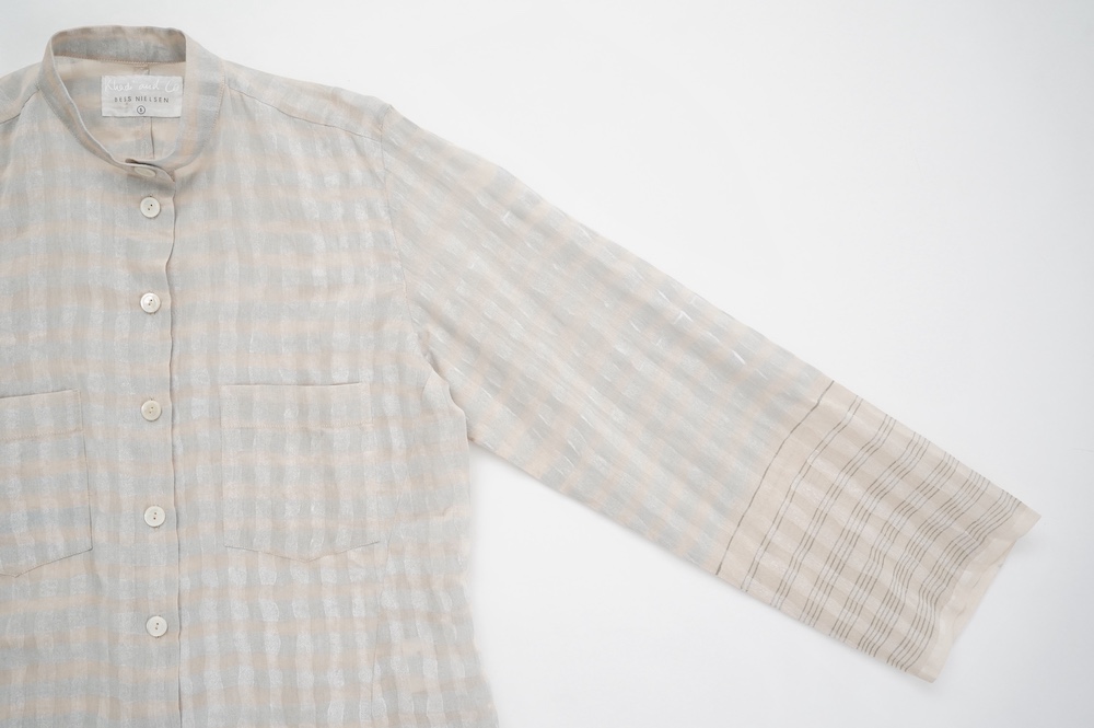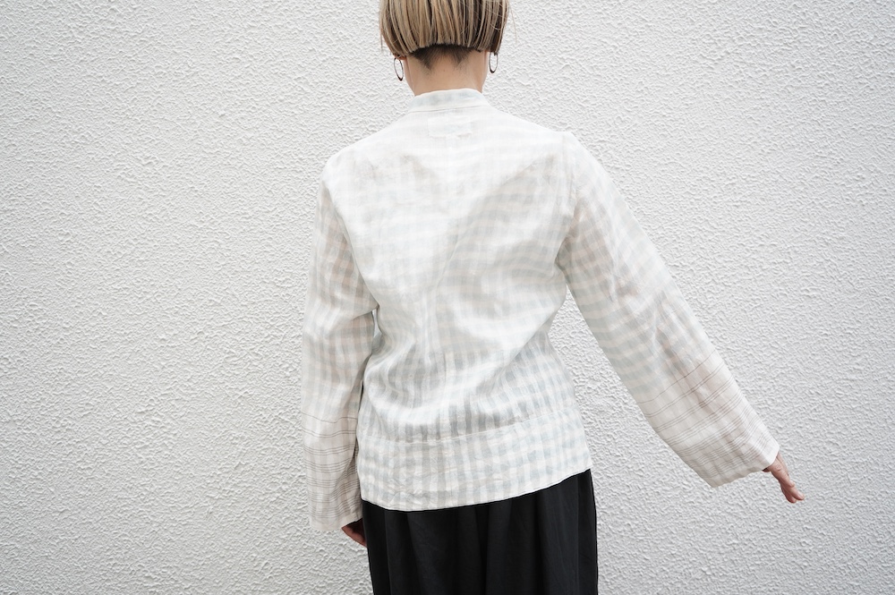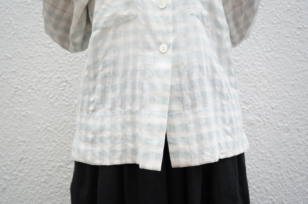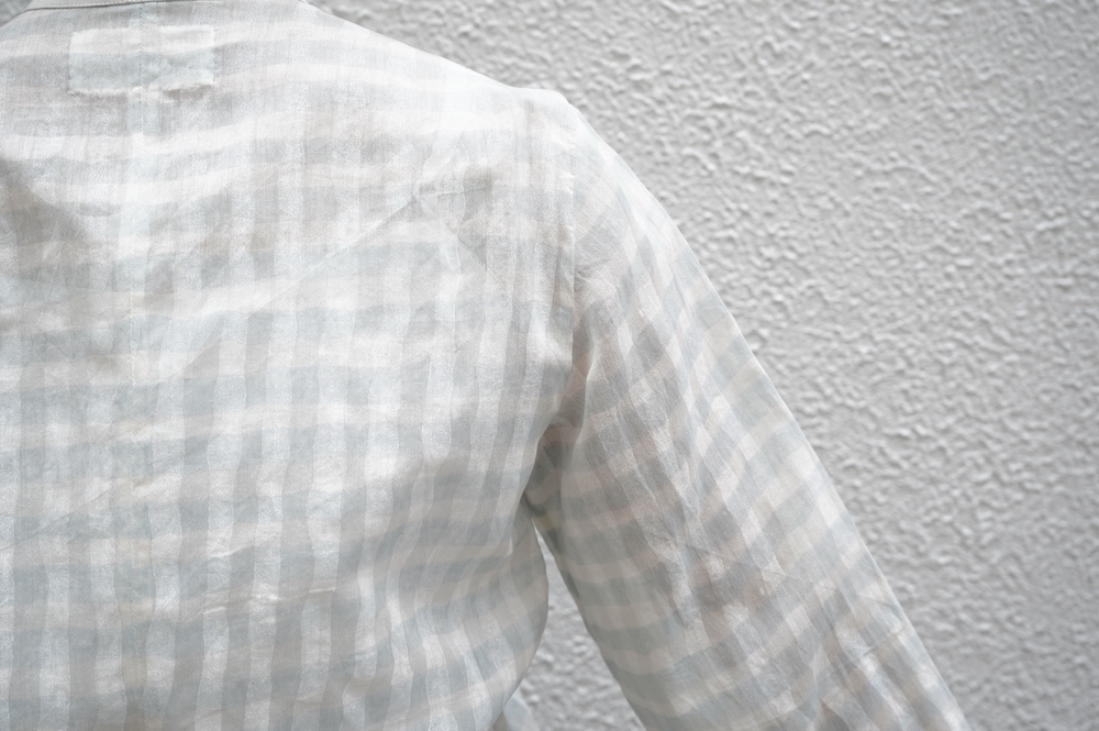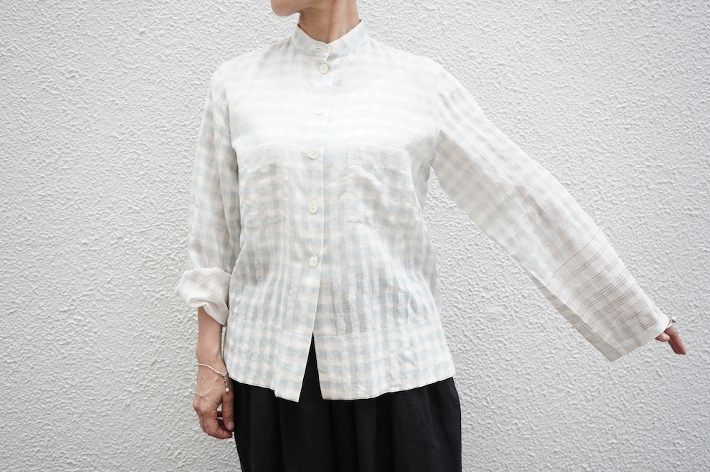 デザインは、スタンドカラーのジャケットのようなスッキリとした印象のシャツ。前身頃にはジャケットのパネル切り替えのようにダーツが施されており綺麗なシルエットが作られています。袖口は生地の端をそのまま活かして使用しているので、袖口も捲りやすく軽やかな仕上がりです。ハンドプリントで施された柔らかなチェック柄がさりげなく、また軽いカディ生地が見た目にも爽やか。ジャッケットのように羽織っても、またシャツとしても格好良く一枚で着ていただけるお洋服です。