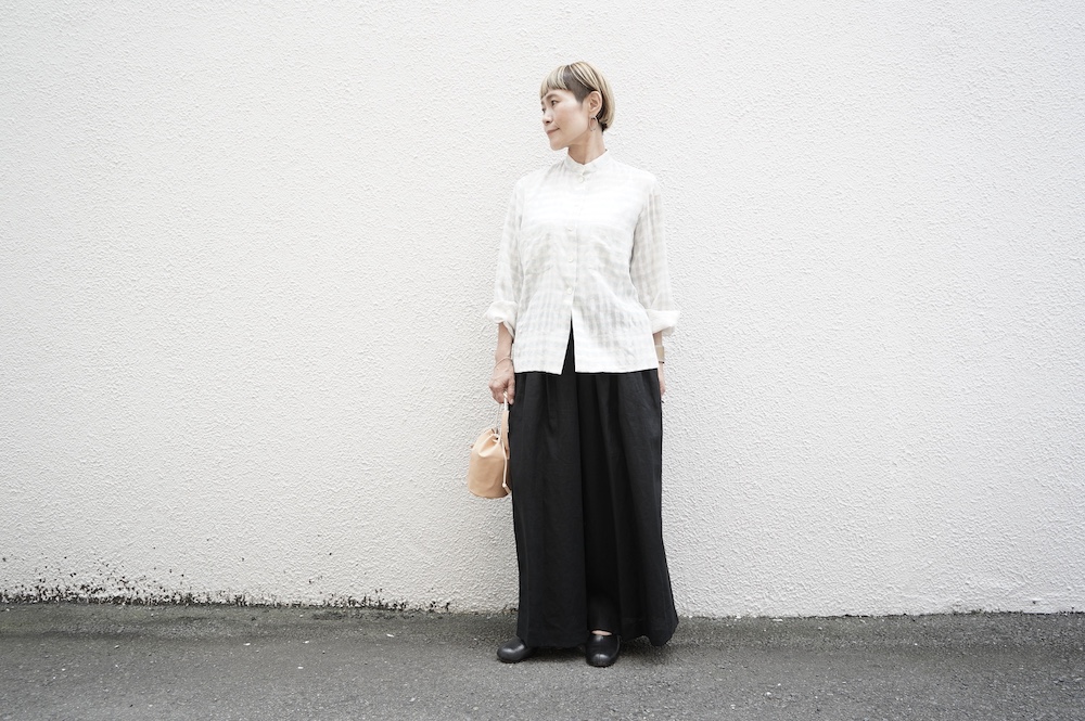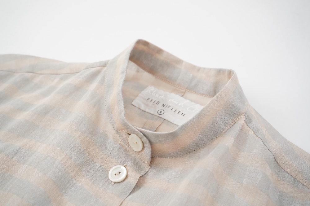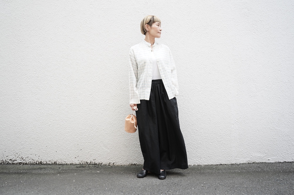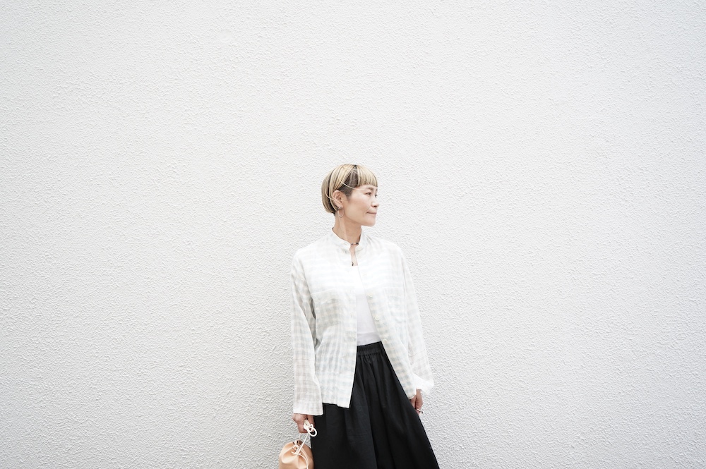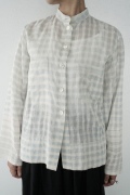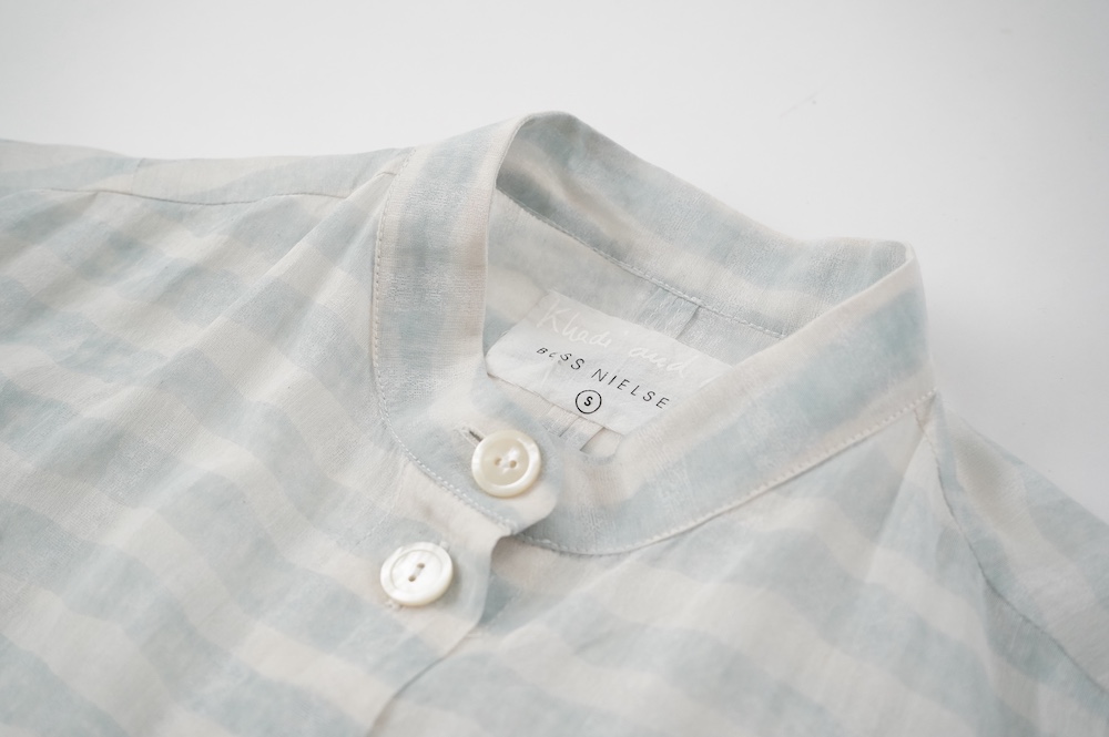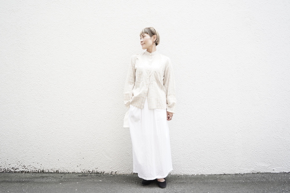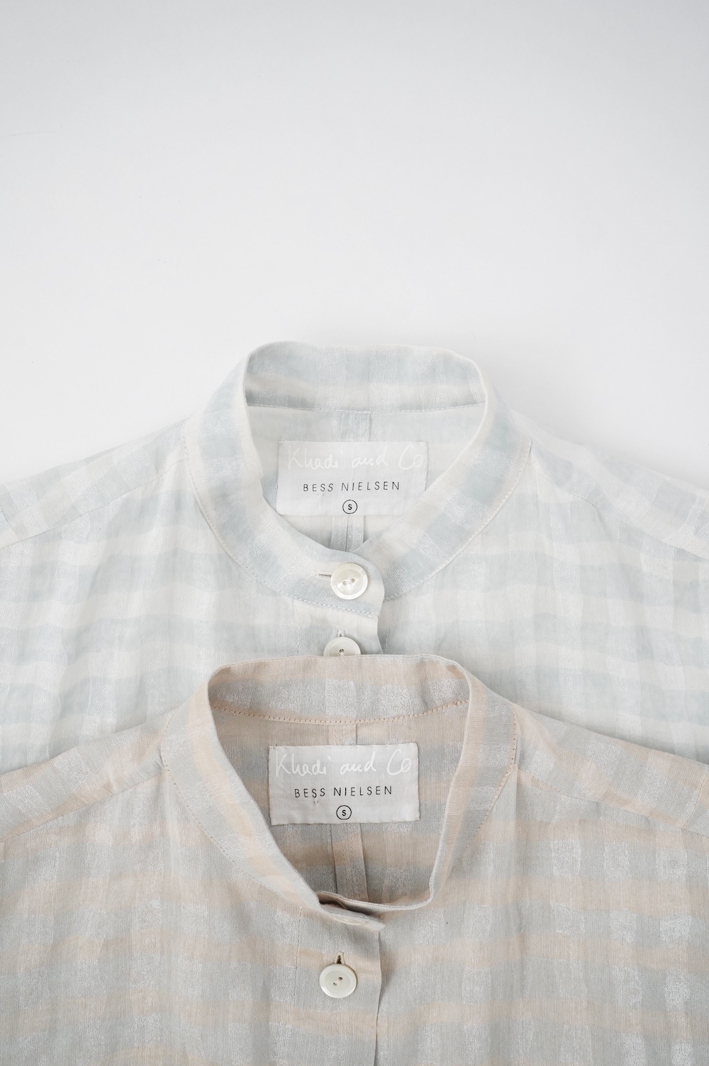 デザインは、スタンドカラーのジャケットのようなスッキリとした印象のシャツ。前身頃にはジャケットのパネル切り替えのようにダーツが施されており綺麗なシルエットが作られています。袖口は生地の端をそのまま活かして使用しているので、袖口も捲りやすく軽やかな仕上がりです。ハンドプリントで施された柔らかなチェック柄がさりげなく、また軽いカディ生地が見た目にも爽やか。ジャッケットのように羽織っても、またシャツとしても格好良く一枚で着ていただけるお洋服です。