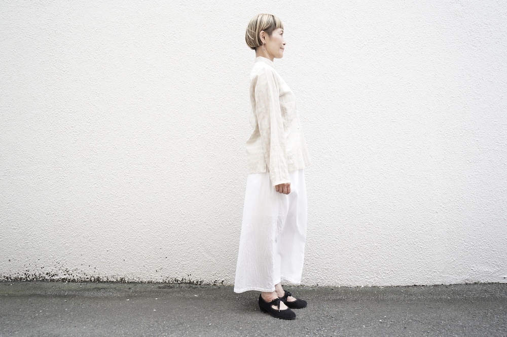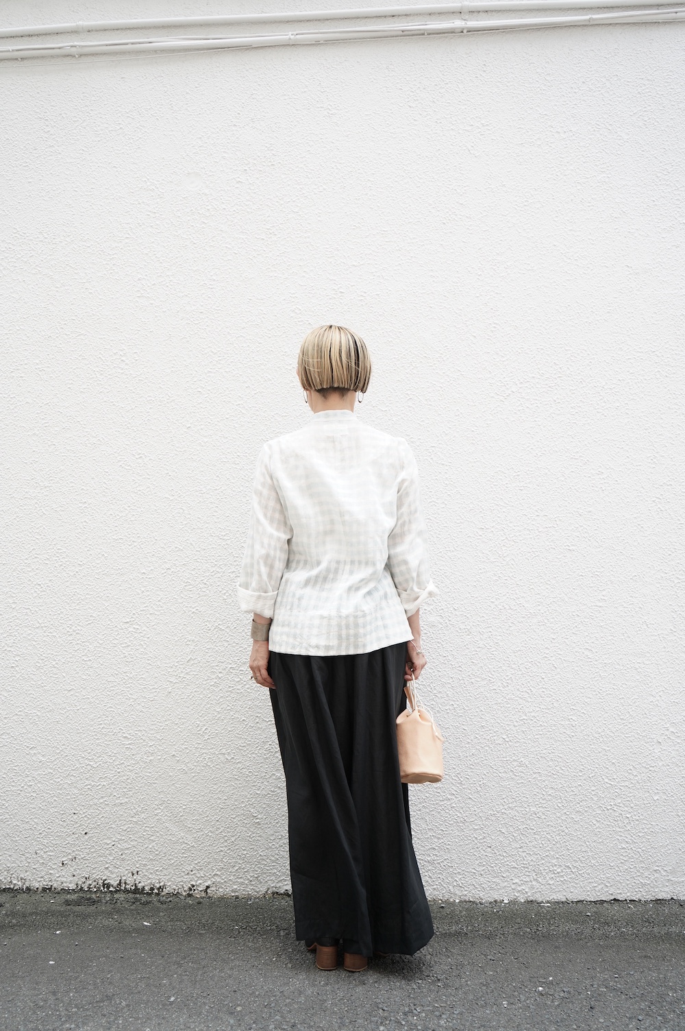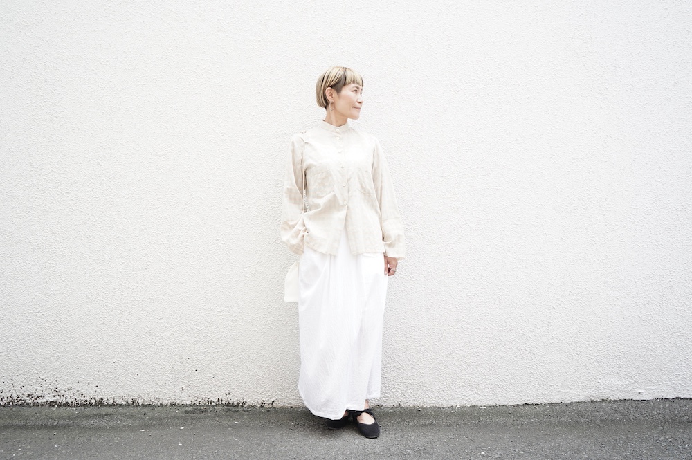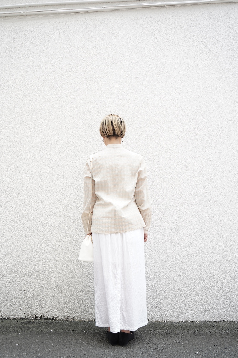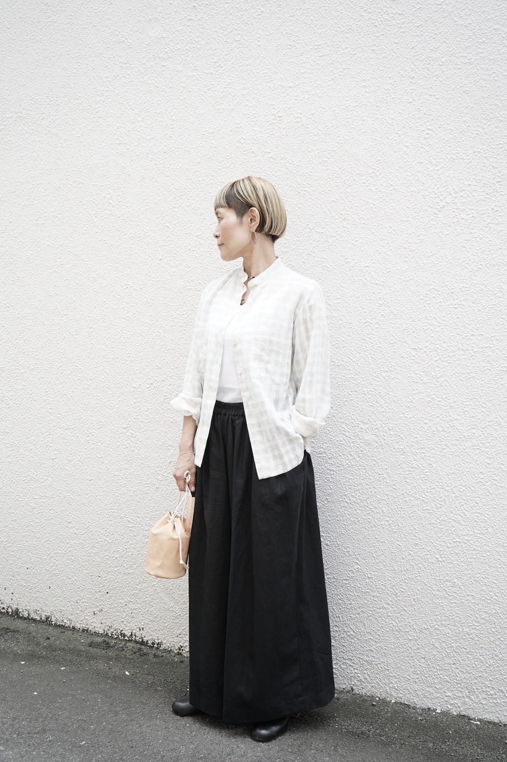 デザインは、スタンドカラーのジャケットのようなスッキリとした印象のシャツ。前身頃にはジャケットのパネル切り替えのようにダーツが施されており綺麗なシルエットが作られています。袖口は生地の端をそのまま活かして使用しているので、袖口も捲りやすく軽やかな仕上がりです。ハンドプリントで施された柔らかなチェック柄がさりげなく、また軽いカディ生地が見た目にも爽やか。ジャッケットのように羽織っても、またシャツとしても格好良く一枚で着ていただけるお洋服です。