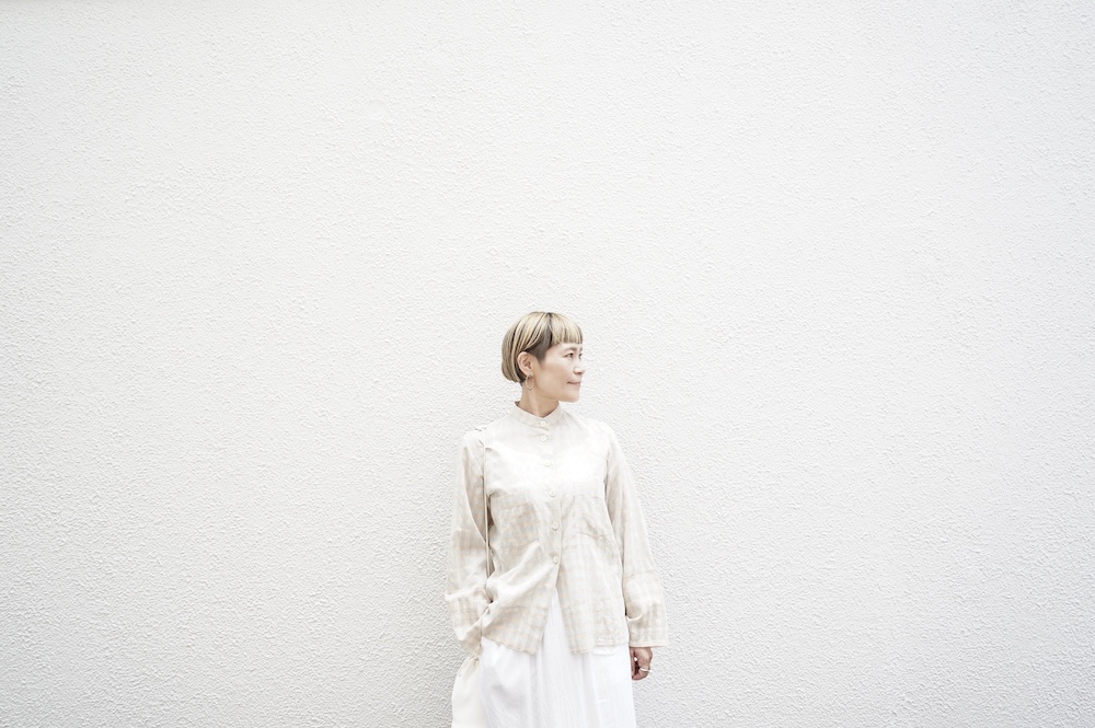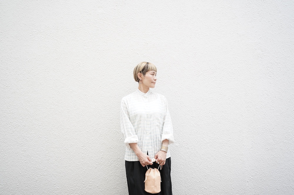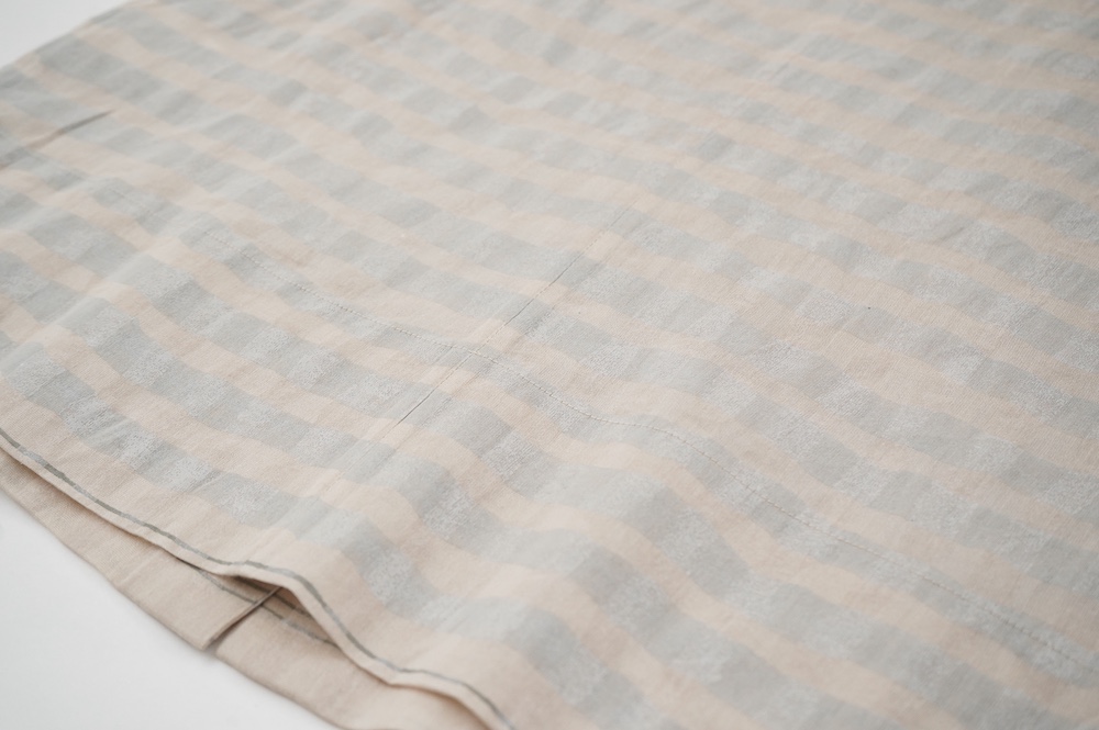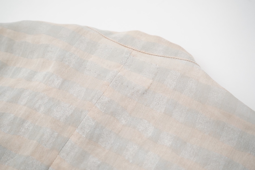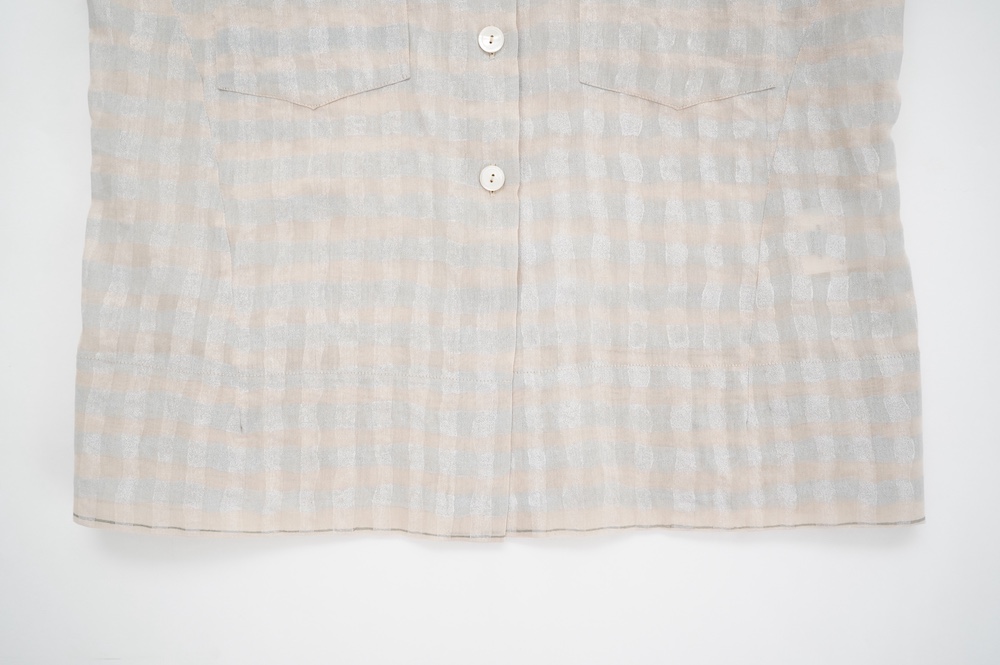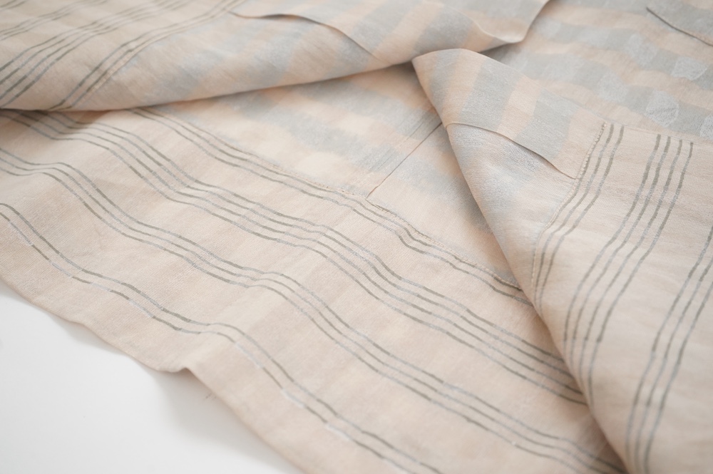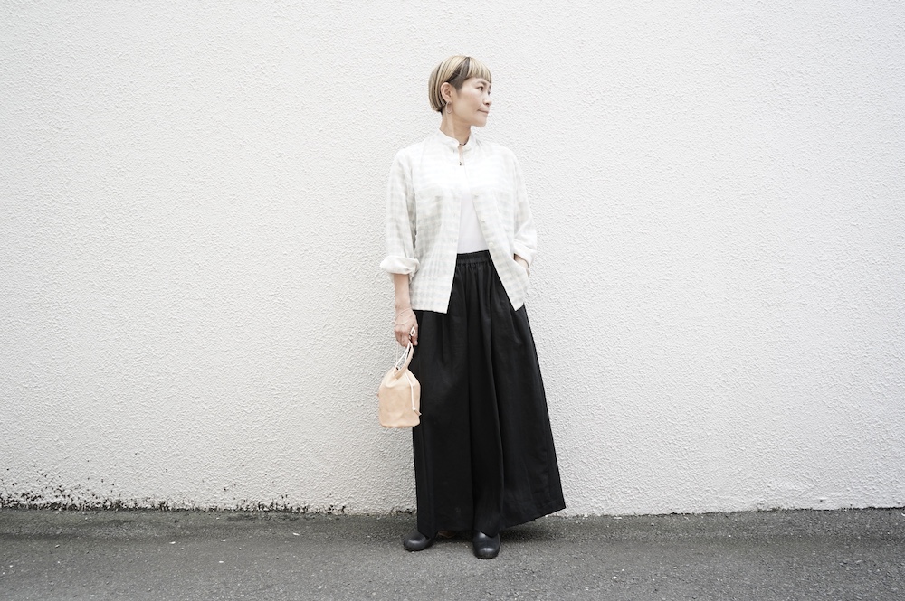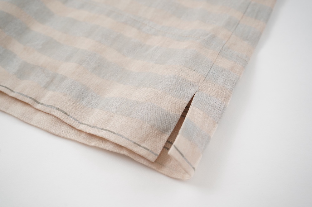 デザインは、スタンドカラーのジャケットのようなスッキリとした印象のシャツ。前身頃にはジャケットのパネル切り替えのようにダーツが施されており綺麗なシルエットが作られています。袖口は生地の端をそのまま活かして使用しているので、袖口も捲りやすく軽やかな仕上がりです。ハンドプリントで施された柔らかなチェック柄がさりげなく、また軽いカディ生地が見た目にも爽やか。ジャッケットのように羽織っても、またシャツとしても格好良く一枚で着ていただけるお洋服です。