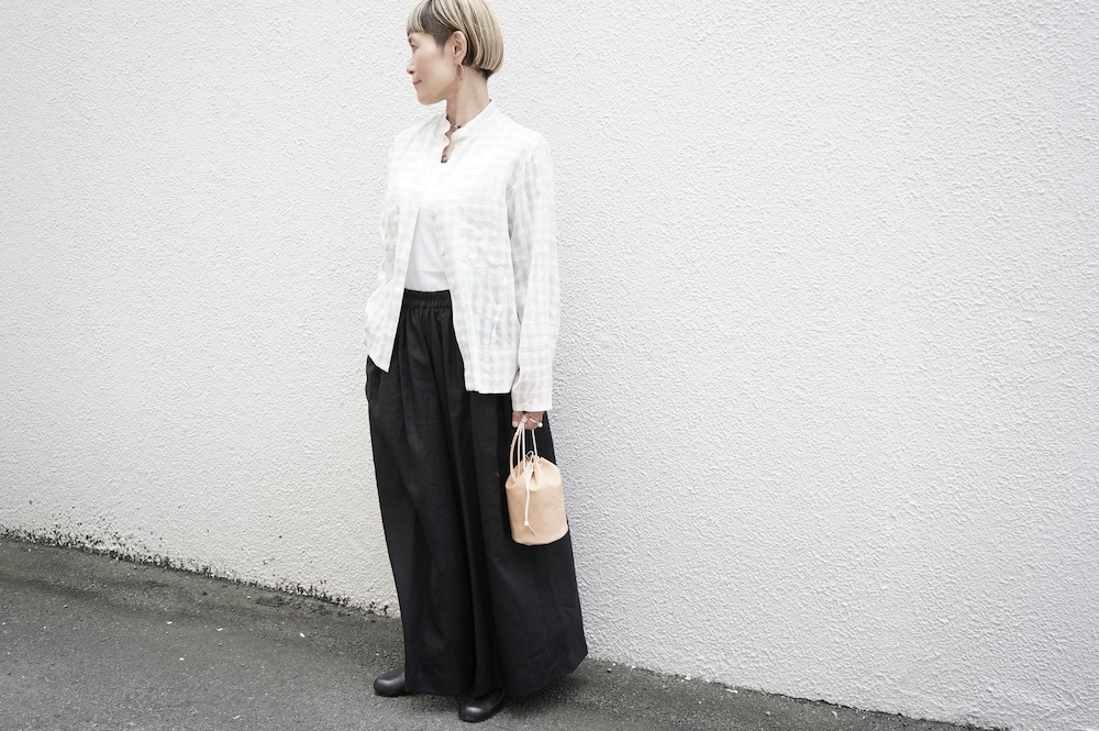 ホワイトはブラックのワイドパンツに合わせてまずは前を開けて