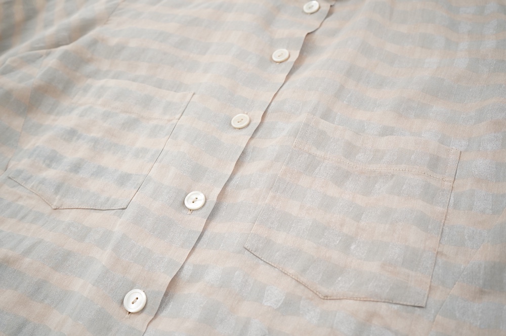 "カディ アンド コー"のシャツ。上質なコットンシルクのカディ生地に、ハンドプリントでチェックとストライプ柄が施されたとても贅沢な生地を仕様。ほんのりと透け感のある見た目にも涼やかな薄手のカディ生地になります。