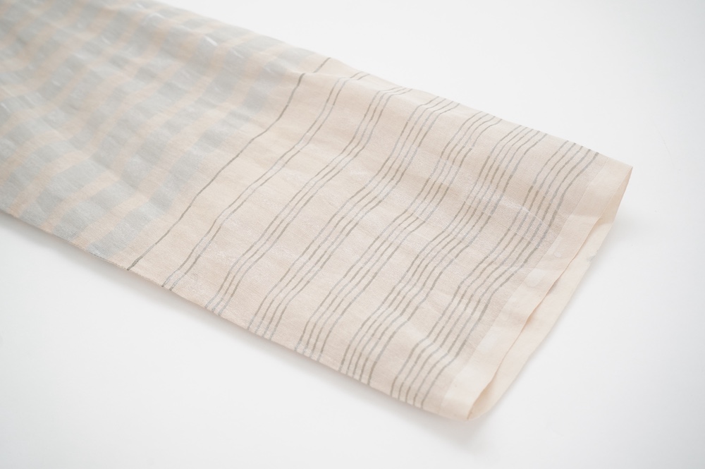 良い感じに掠れたホワイトのストライプと、水色のボーダーが交差する軽やかなハンドブロックプリントのチェック柄。