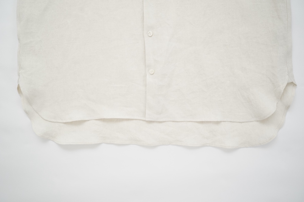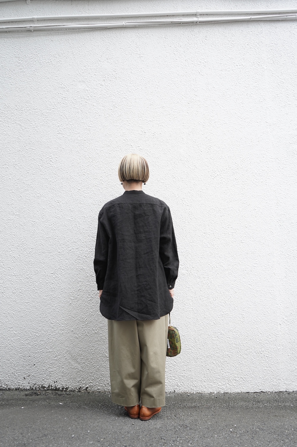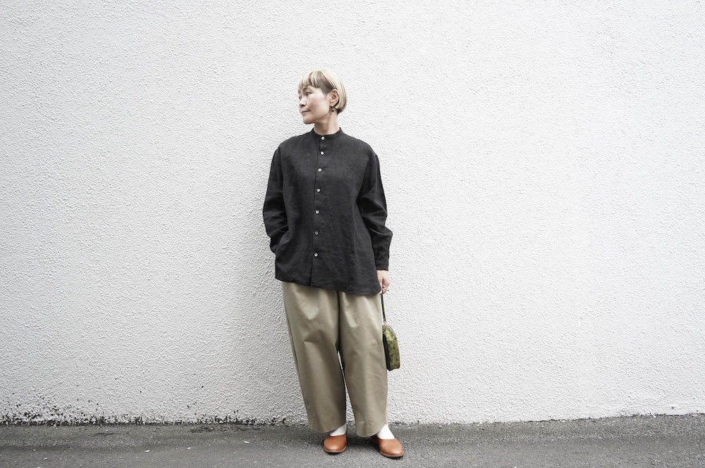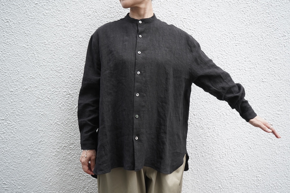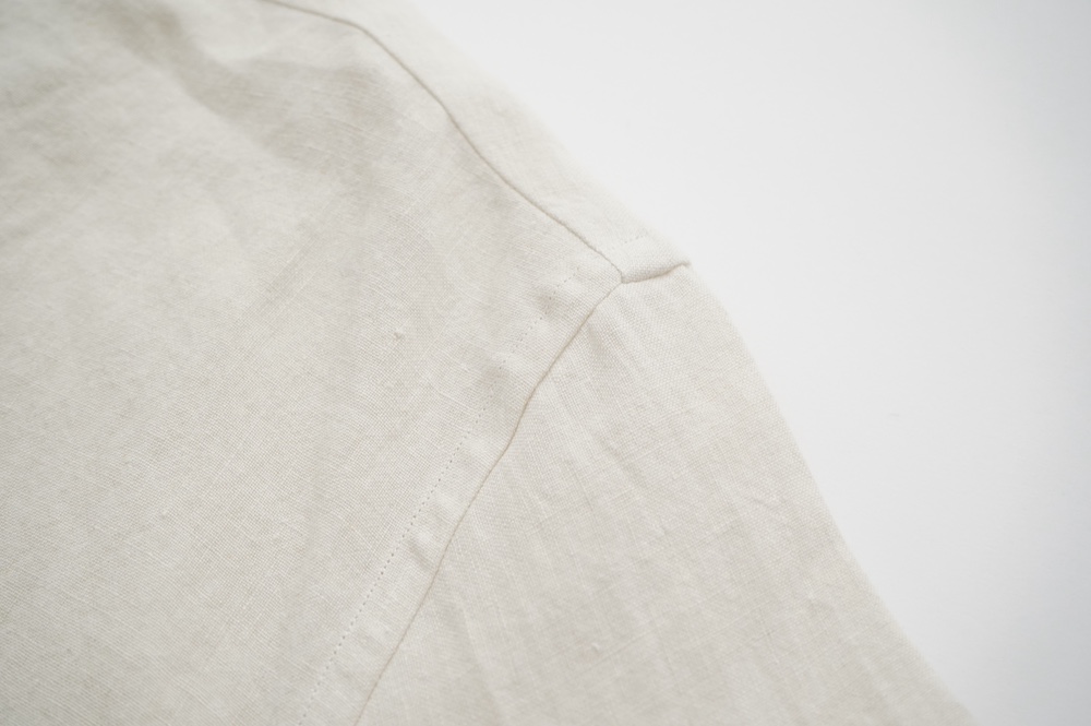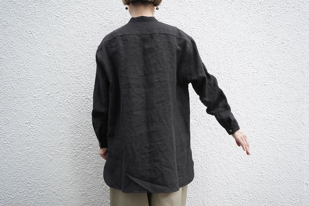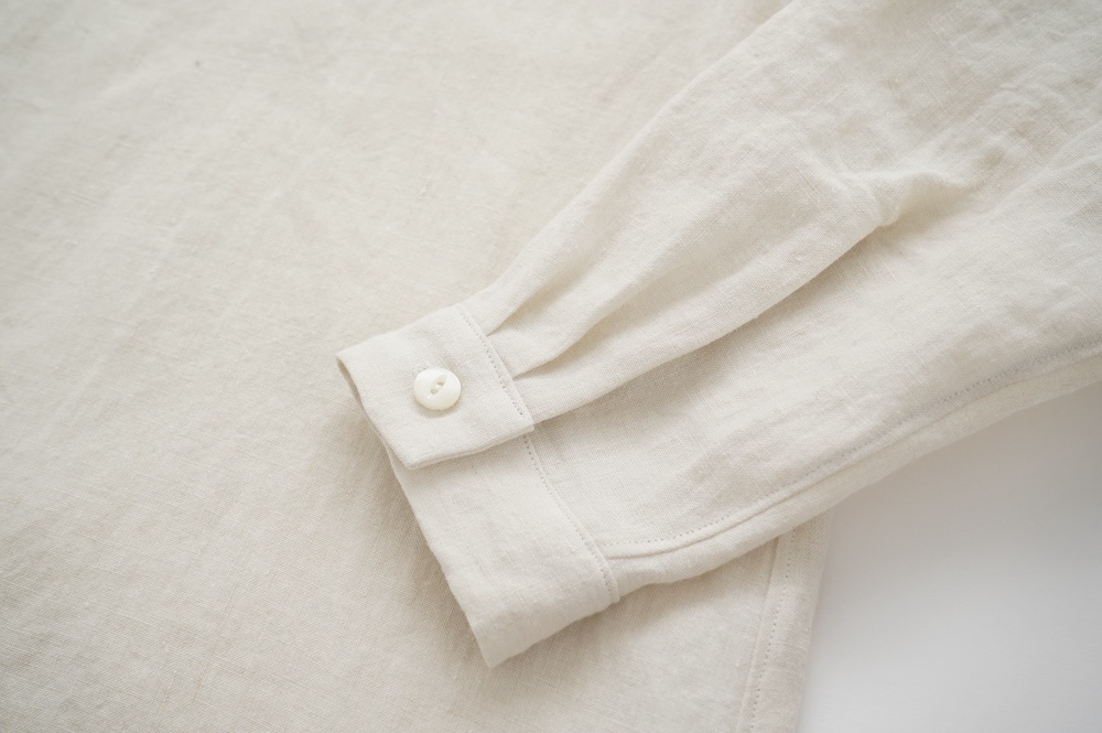デザインはシンプルでリラックスして着れるバンドカラーシャツ。アームホールの構造をジャケットのように体に沿わせるセットインスリーブとシャツのように動きを重視した直線的なタイプを合わせたパターンになっています。そうすることで見た目はとても収まりが良いのにとても動きやすい袖になっています。美しい極狭のステッチ幅でデザイナーが自ら縫製をしています。出来るだけ細かいステッチで縫製することで、強度を強くしています。身幅にゆとりがあり、着丈も少し長めの前後差があるデザインで、フランスのグランパシャツなどをイメージしています。マニッシュな雰囲気のスタンドカラーシャツです。