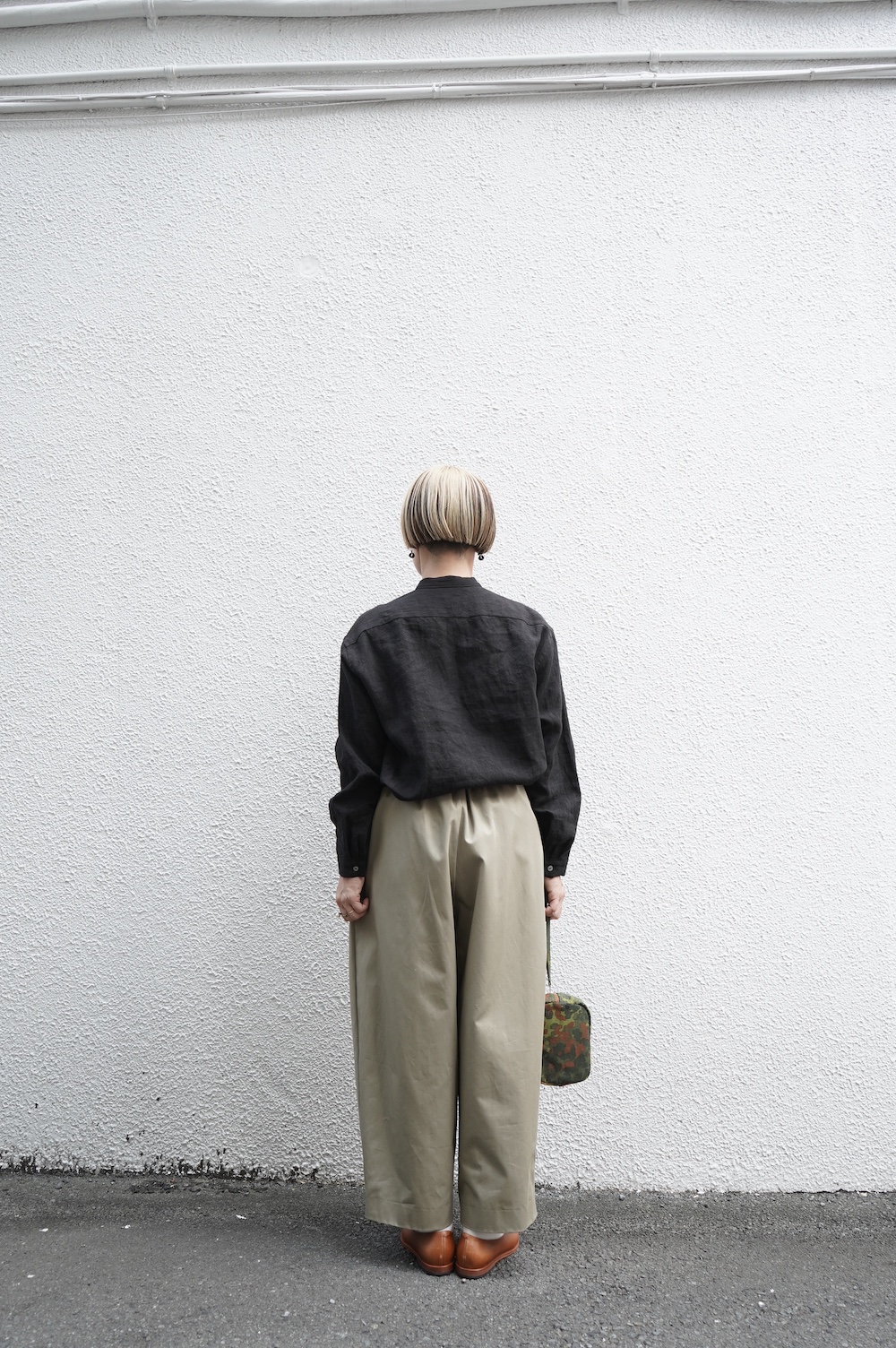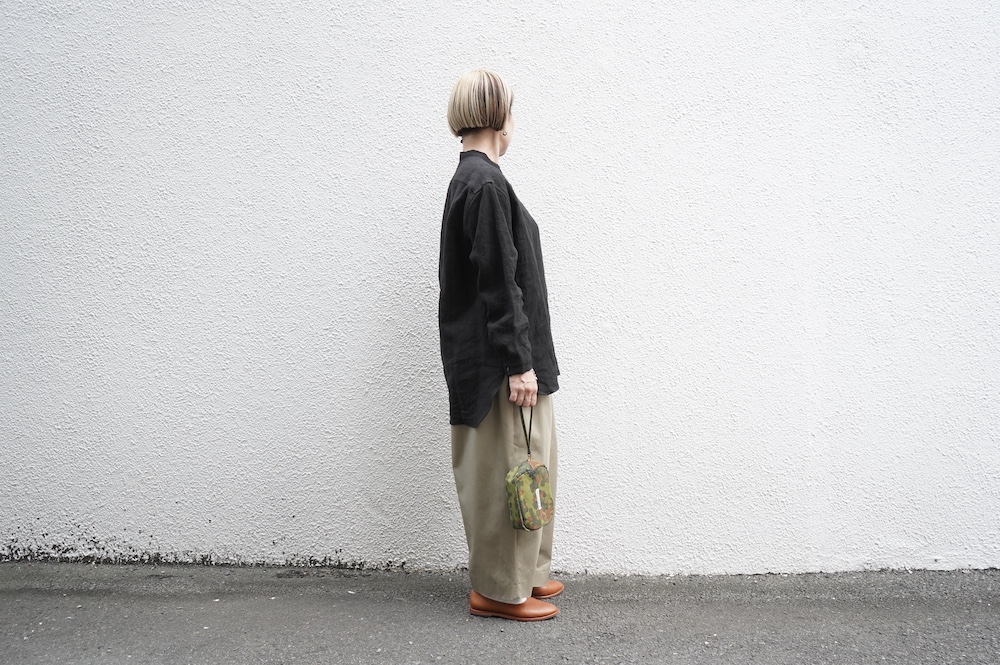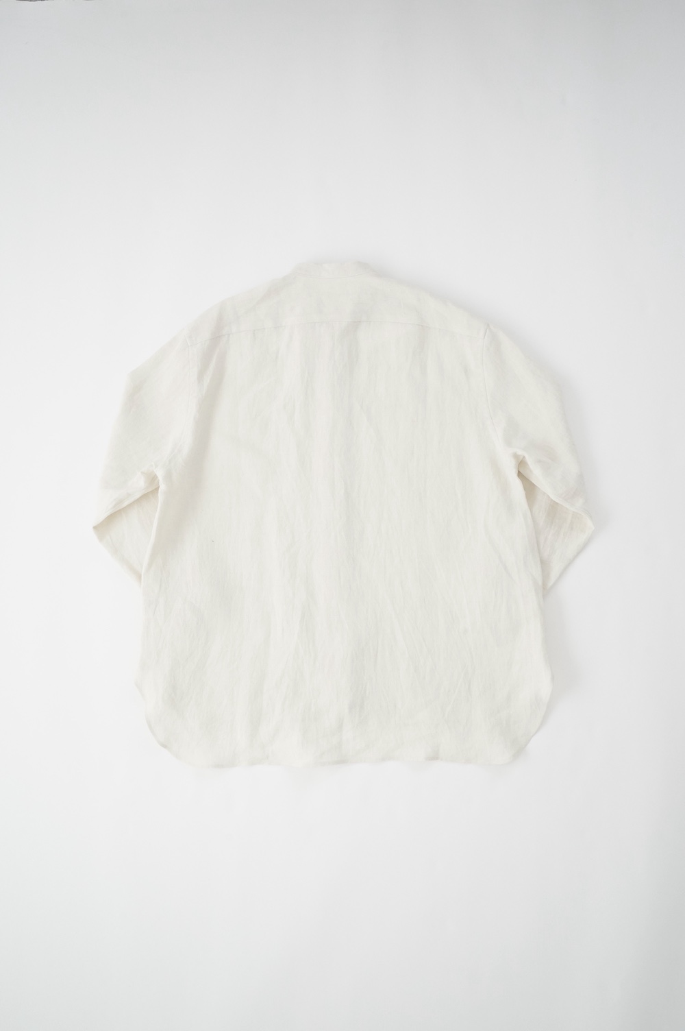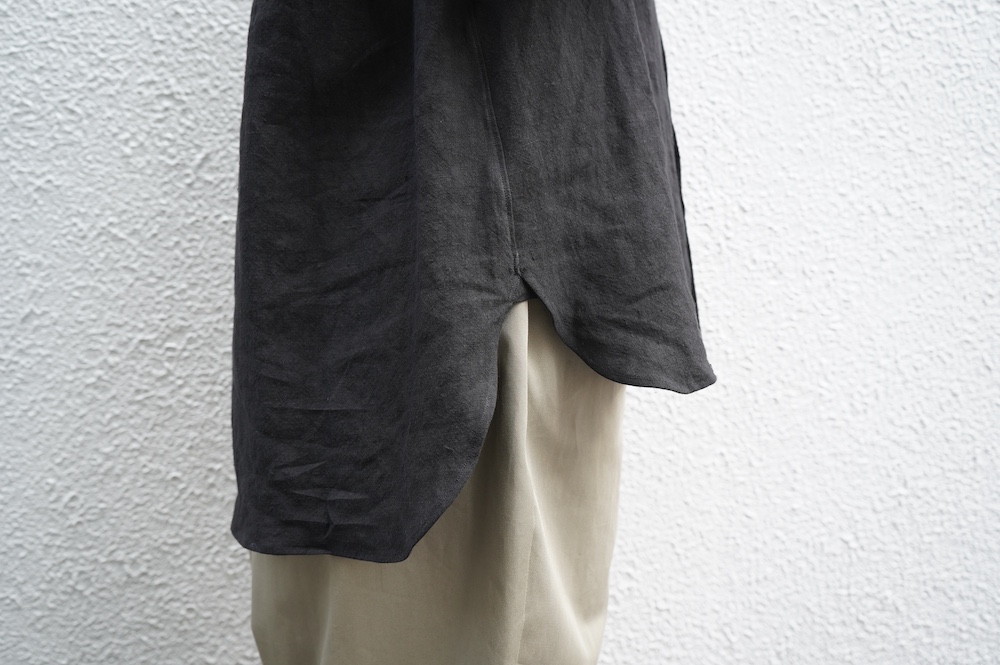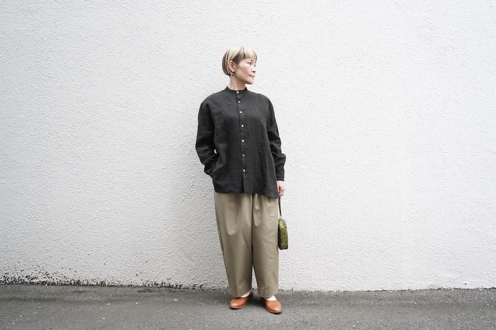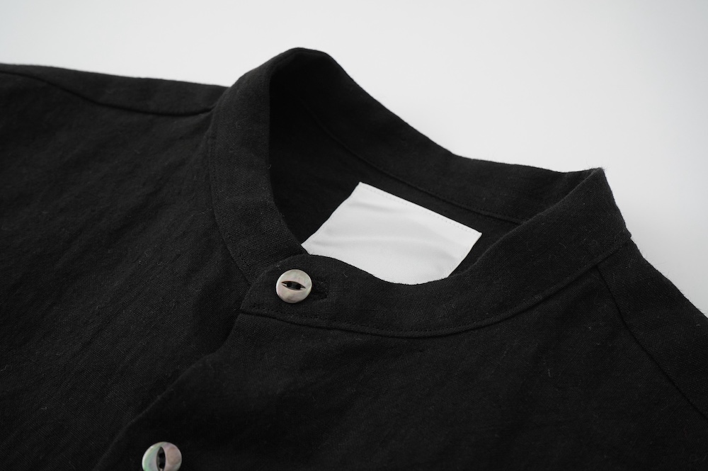 デザインはシンプルでリラックスして着れるバンドカラーシャツ。アームホールの構造をジャケットのように体に沿わせるセットインスリーブとシャツのように動きを重視した直線的なタイプを合わせたパターンになっています。そうすることで見た目はとても収まりが良いのにとても動きやすい袖になっています。美しい極狭のステッチ幅でデザイナーが自ら縫製をしています。出来るだけ細かいステッチで縫製することで、強度を強くしています。身幅にゆとりがあり、着丈も少し長めの前後差があるデザインで、フランスのグランパシャツなどをイメージしています。マニッシュな雰囲気のスタンドカラーシャツです。