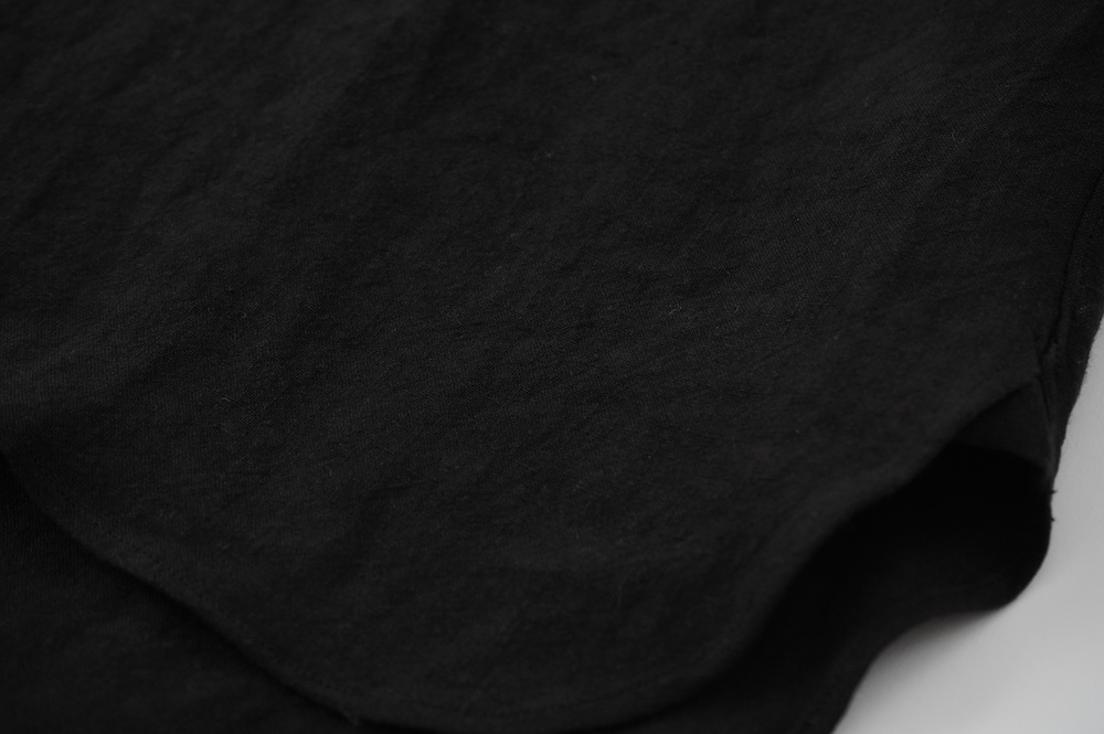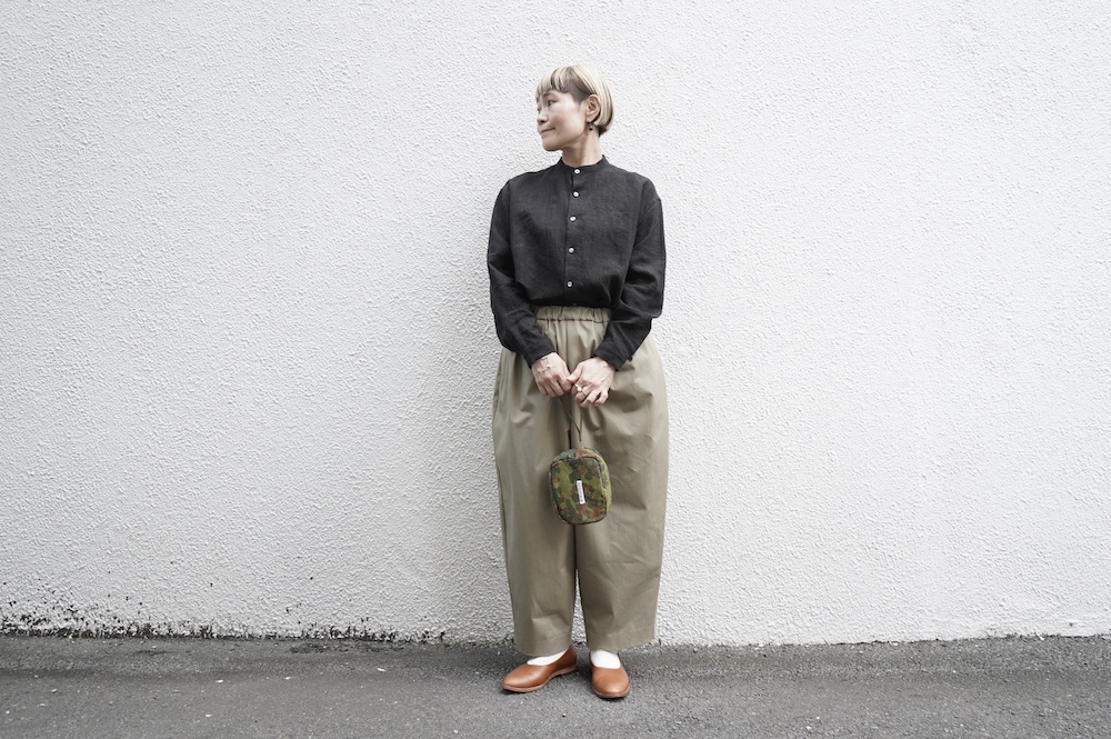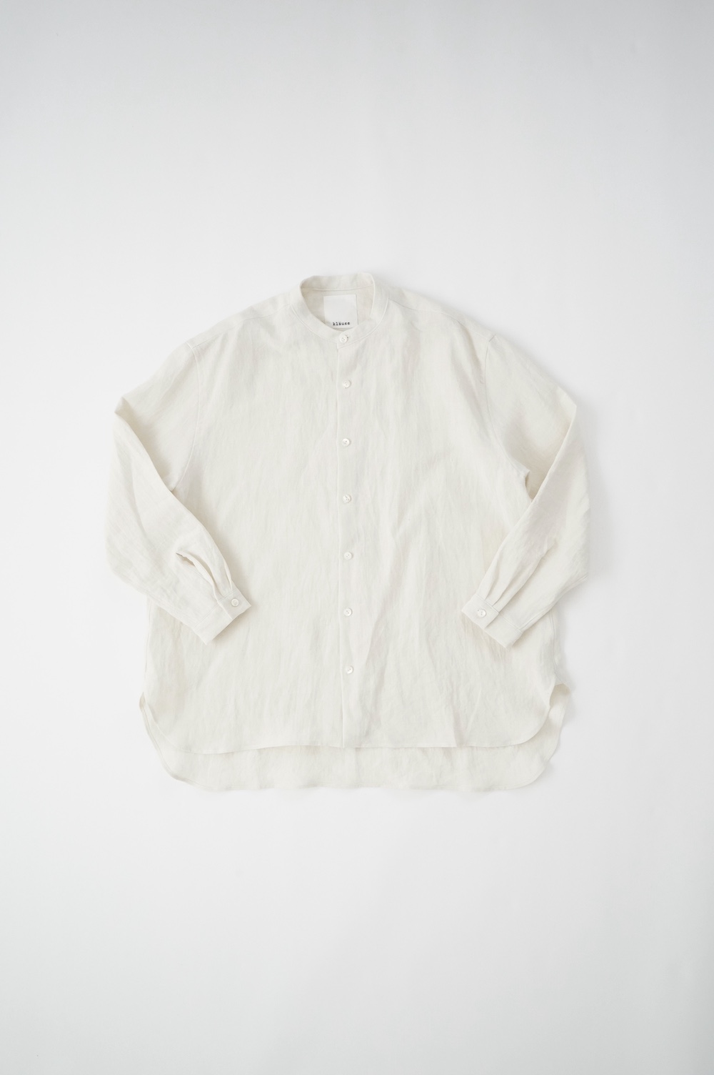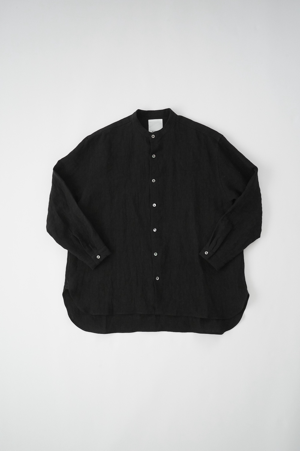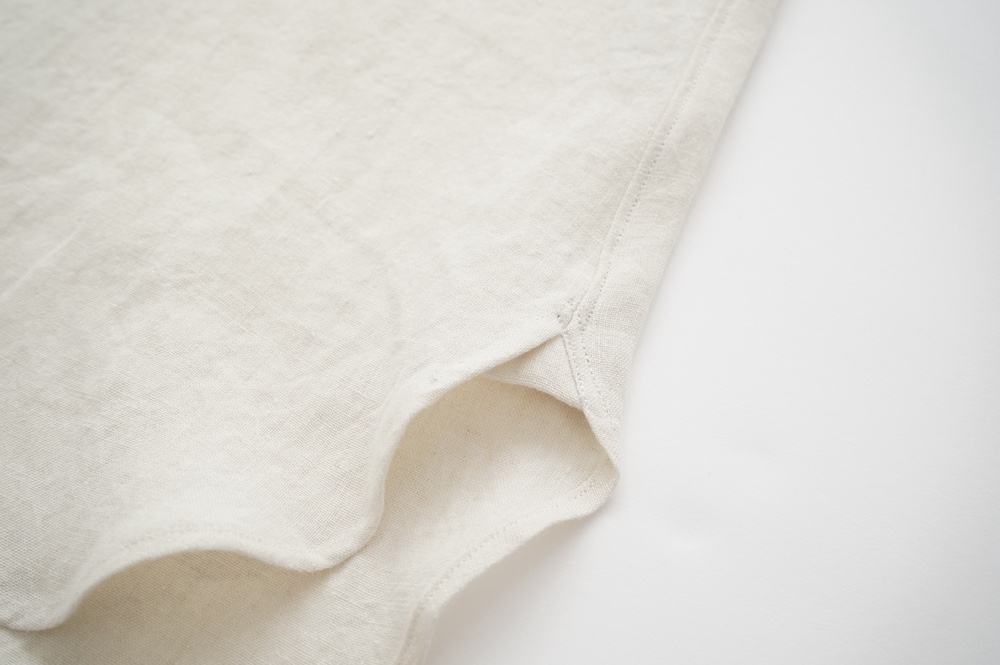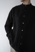 デザインはシンプルでリラックスして着れるバンドカラーシャツ。アームホールの構造をジャケットのように体に沿わせるセットインスリーブとシャツのように動きを重視した直線的なタイプを合わせたパターンになっています。そうすることで見た目はとても収まりが良いのにとても動きやすい袖になっています。美しい極狭のステッチ幅でデザイナーが自ら縫製をしています。出来るだけ細かいステッチで縫製することで、強度を強くしています。身幅にゆとりがあり、着丈も少し長めの前後差があるデザインで、フランスのグランパシャツなどをイメージしています。マニッシュな雰囲気のスタンドカラーシャツです。