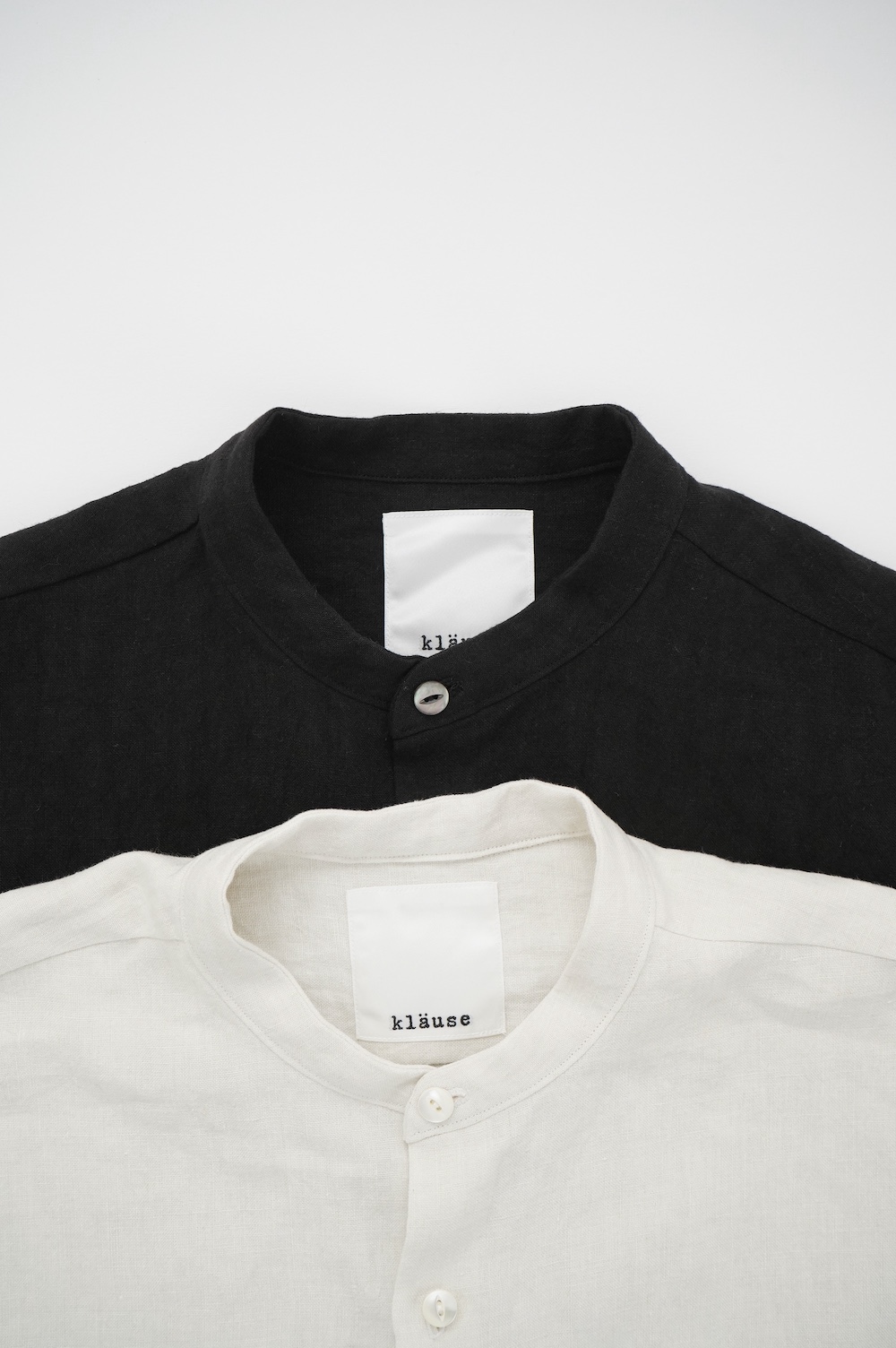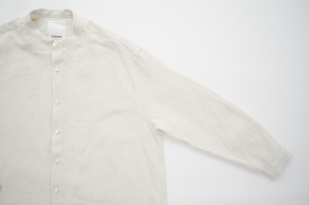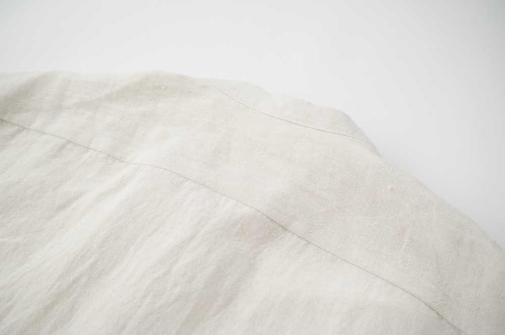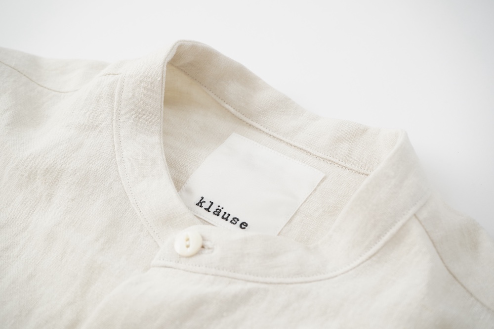 "クロイゼ"のシャツ。生地を作っていく過程で、洗い〜手作業で天日で干す過程を何度も繰り返していく天日干しリネンを使用。しっかりとハリのあるリネン生地で、使っていくほどに柔らかな風合いに育っていくのが楽しみな素材です。秋口から春先まで楽しめる、夏のリネン生地よりは少し厚みがあります。