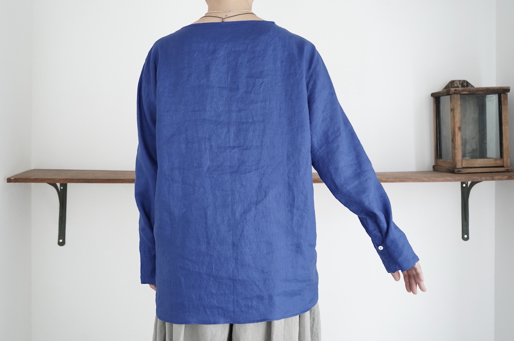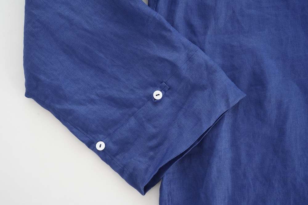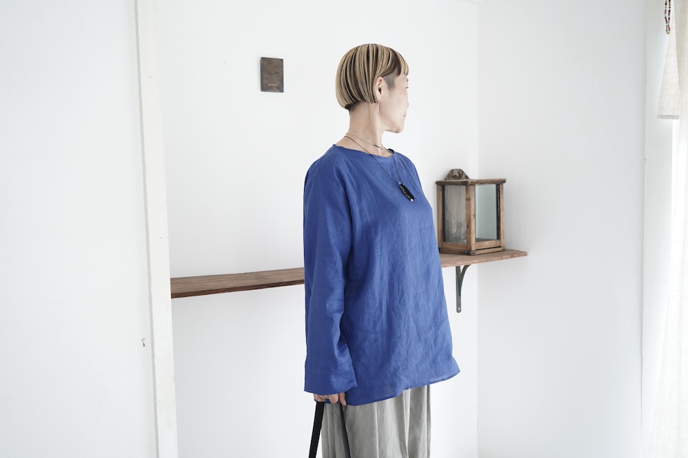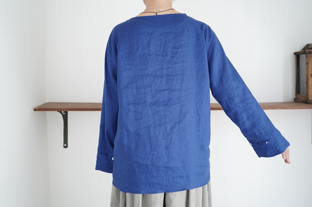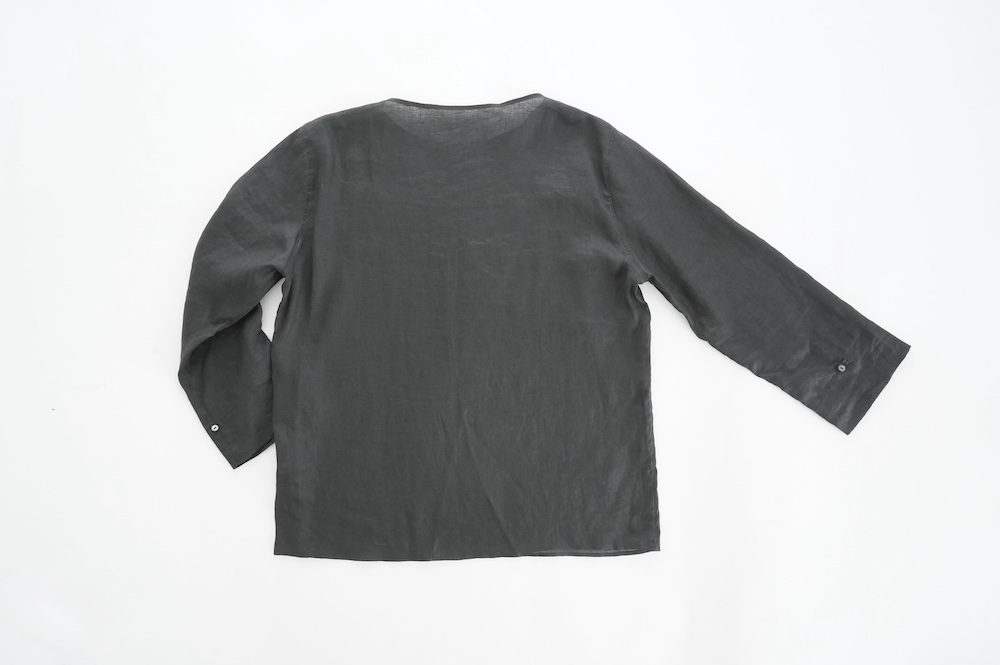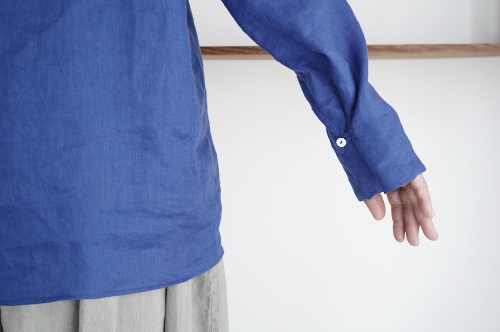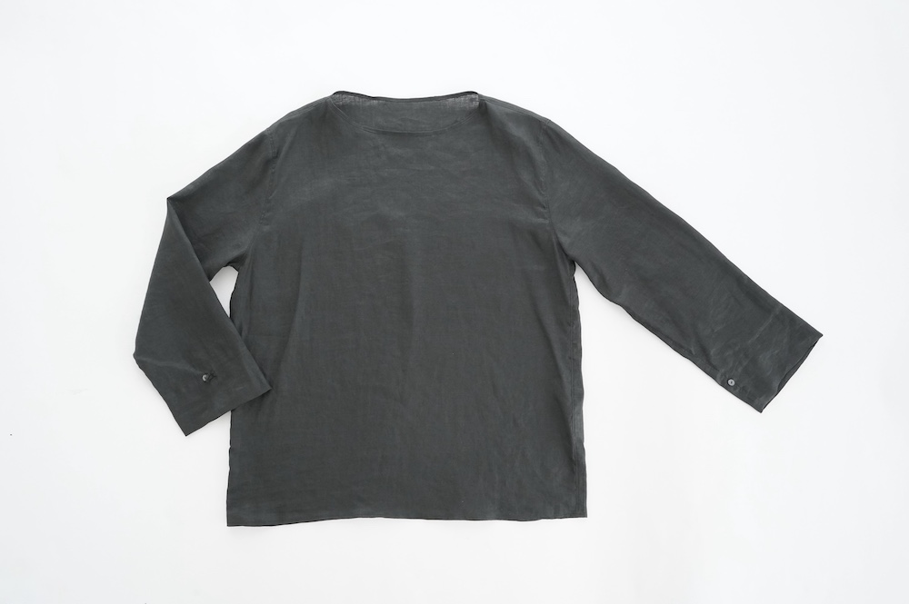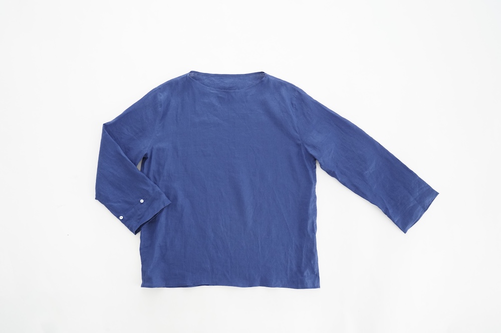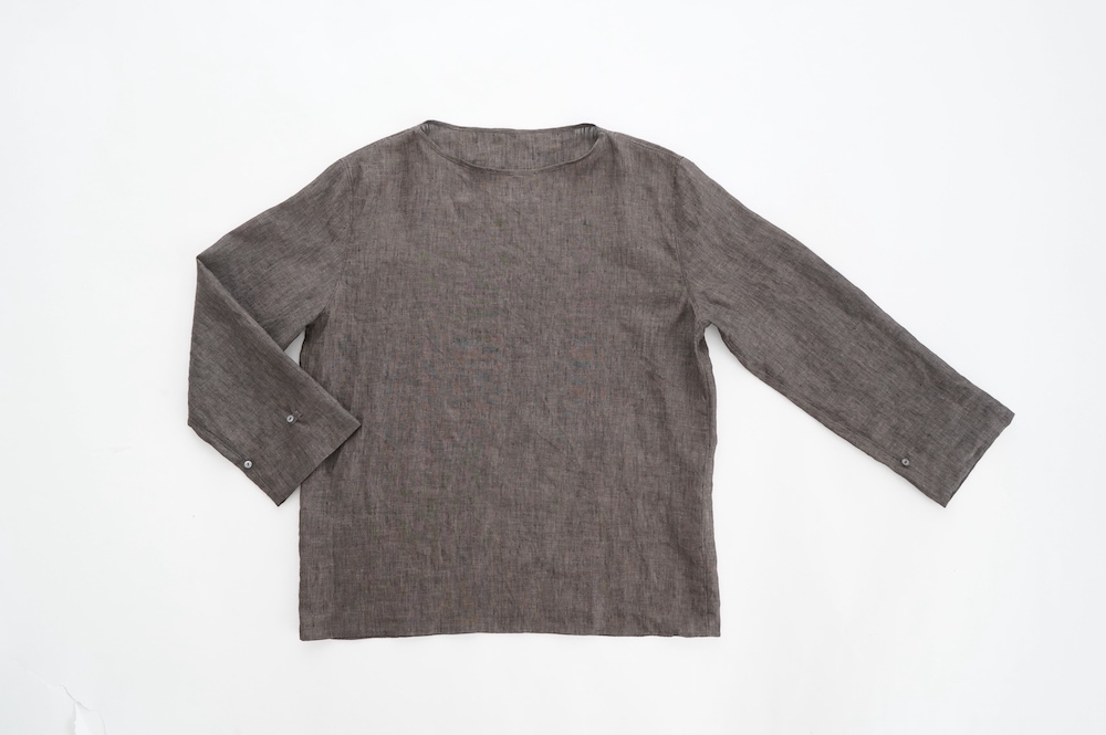 デザインは新型のボートネックタイプのプルオーバーシャツ。ネックが横に直線的な襟ぐりになっており、以前のプルオーバーシャツの襟が大きく感じていた方には特にお勧めの新作です。一見すると直線的なシャツに見えますが、ラフでイージーになり過ぎず、風が抜ける適度なゆとりはありながら綺麗なシルエットを実現しています。とても細部まで考えられた秀逸なパターンです。また今回から袖口の仕様を変更し、10cmの見返しをつけて袖口から10cm上にボタンがついています。このボタンを締めた際手首のあたりがキュッとシェイプされてシルエットを少しだけ変えることができます。もちろん袖口をロールアップしても素敵です。ステッチ、パイピングも目立たないように5mm幅。美しい極狭のステッチ幅でデザイナーが自ら縫製をしています。出来るだけ細かいステッチで縫製することで、強度を強くしています。カットソーのように一枚でも、カーディガンやベストに合わせるインナーブラウスとしても、シンプルなのできっと出番の多い一枚になりそうです。