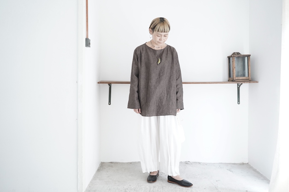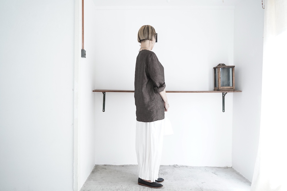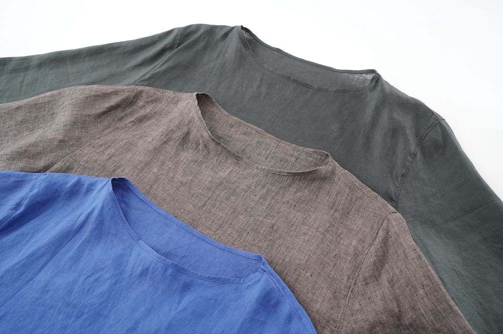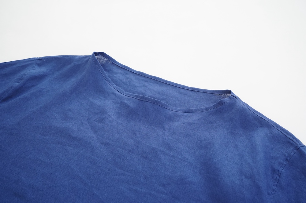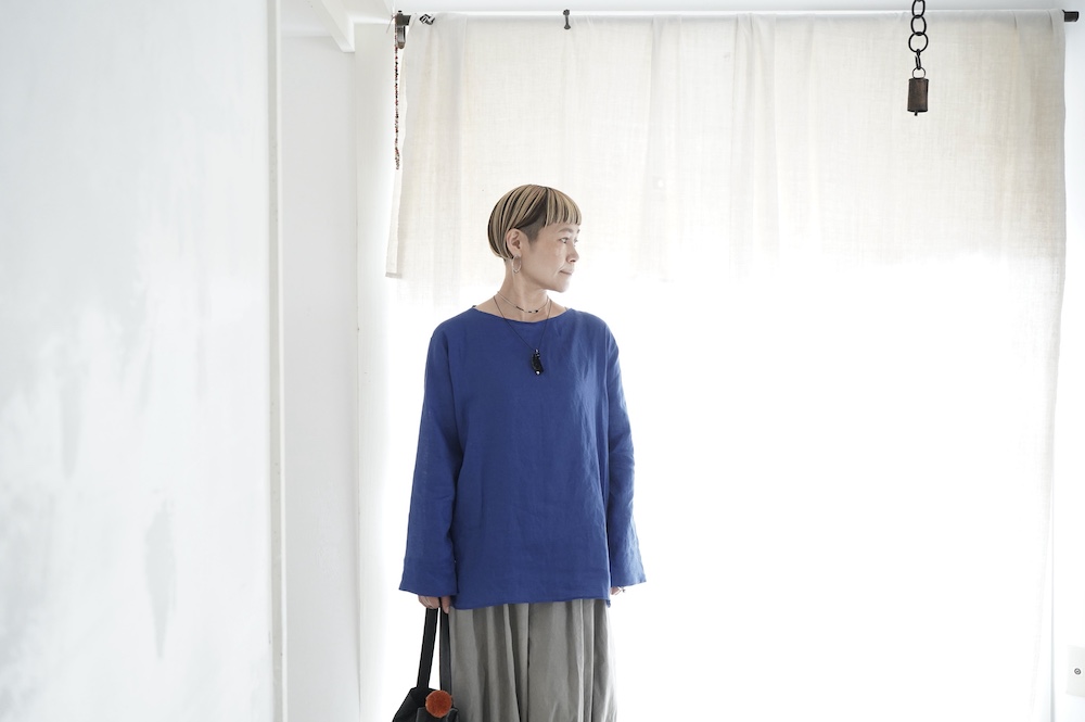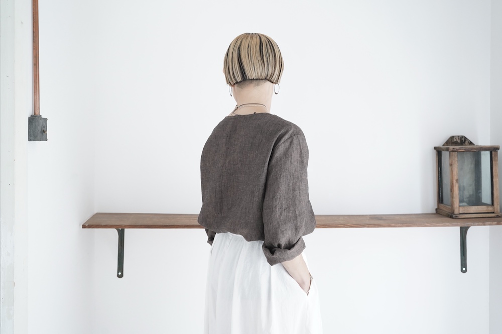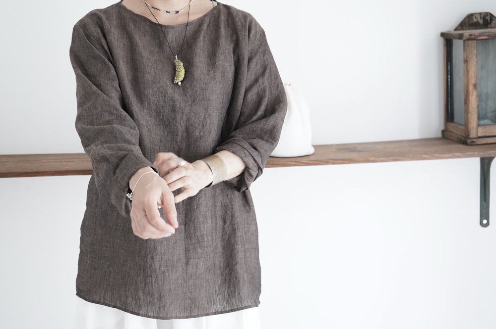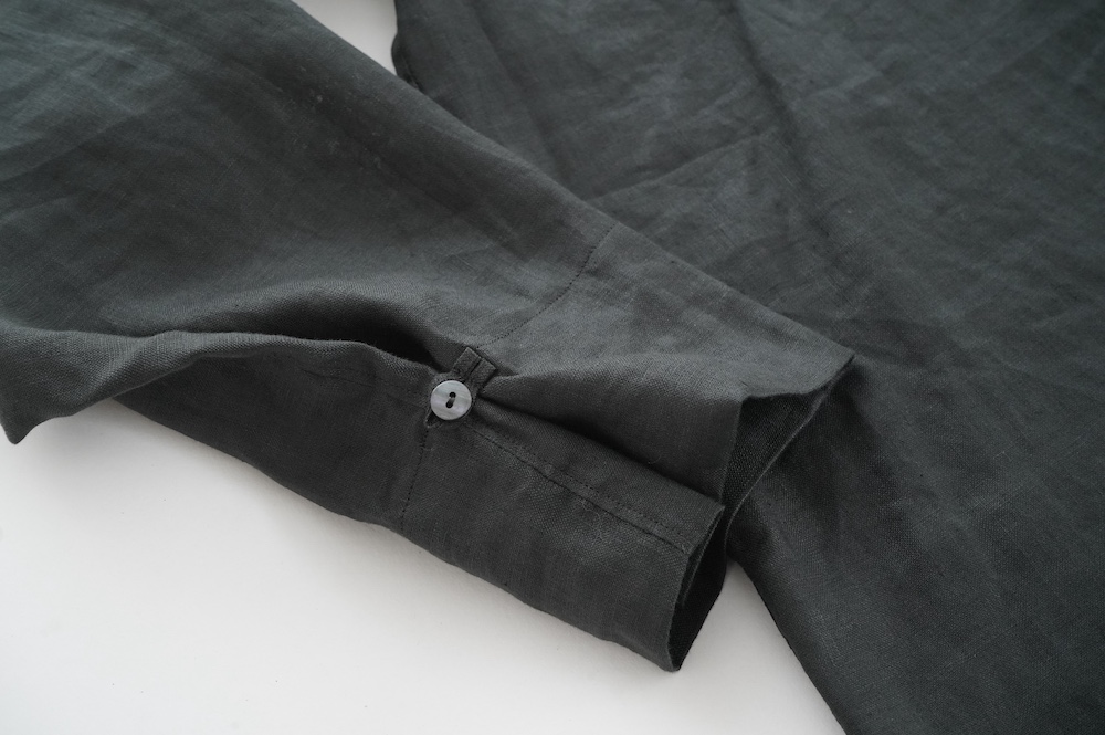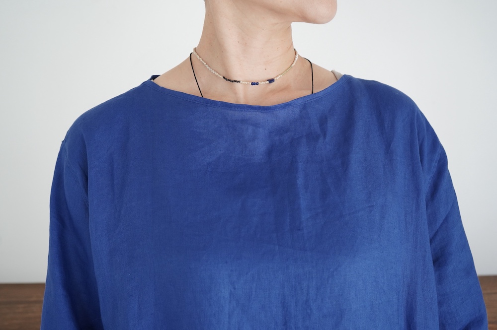 デザインは新型のボートネックタイプのプルオーバーシャツ。ネックが横に直線的な襟ぐりになっており、以前のプルオーバーシャツの襟が大きく感じていた方には特にお勧めの新作です。一見すると直線的なシャツに見えますが、ラフでイージーになり過ぎず、風が抜ける適度なゆとりはありながら綺麗なシルエットを実現しています。とても細部まで考えられた秀逸なパターンです。また今回から袖口の仕様を変更し、10cmの見返しをつけて袖口から10cm上にボタンがついています。このボタンを締めた際手首のあたりがキュッとシェイプされてシルエットを少しだけ変えることができます。もちろん袖口をロールアップしても素敵です。ステッチ、パイピングも目立たないように5mm幅。美しい極狭のステッチ幅でデザイナーが自ら縫製をしています。出来るだけ細かいステッチで縫製することで、強度を強くしています。カットソーのように一枚でも、カーディガンやベストに合わせるインナーブラウスとしても、シンプルなのできっと出番の多い一枚になりそうです。