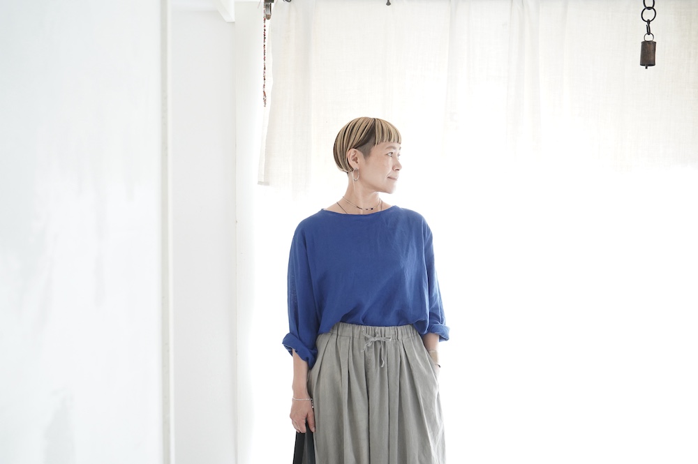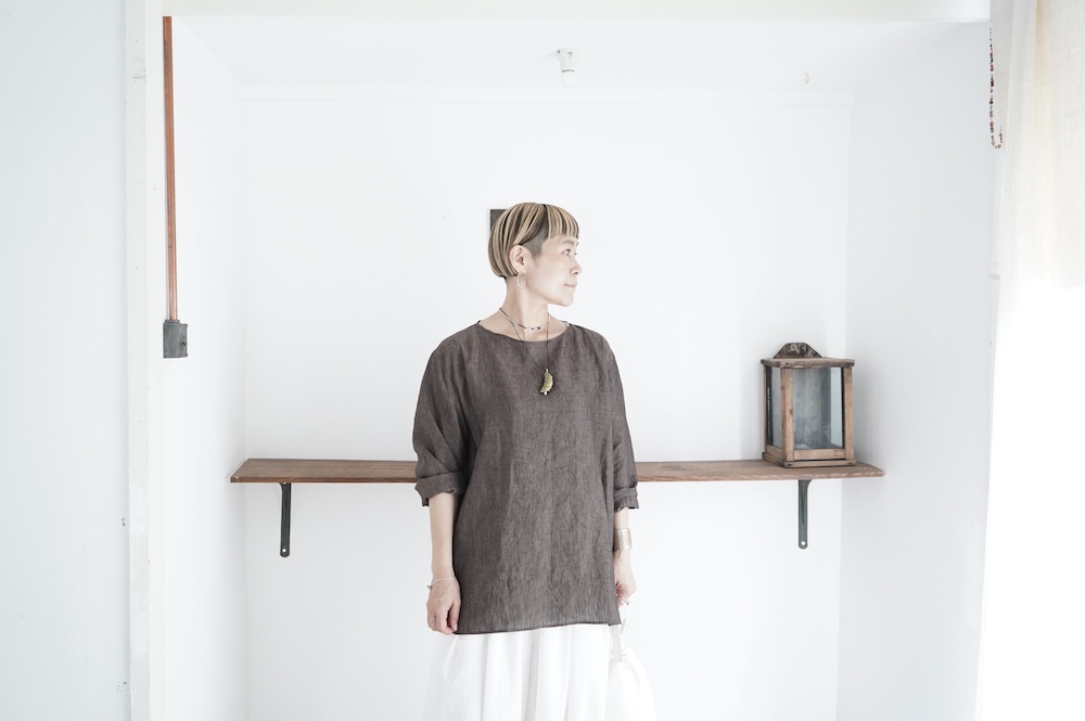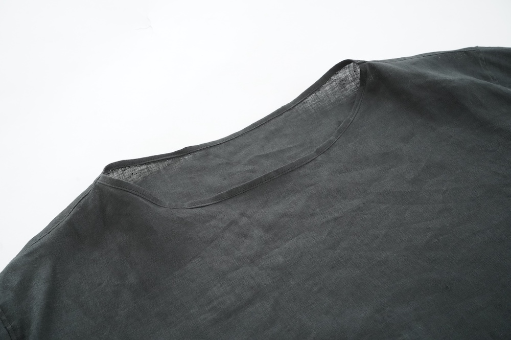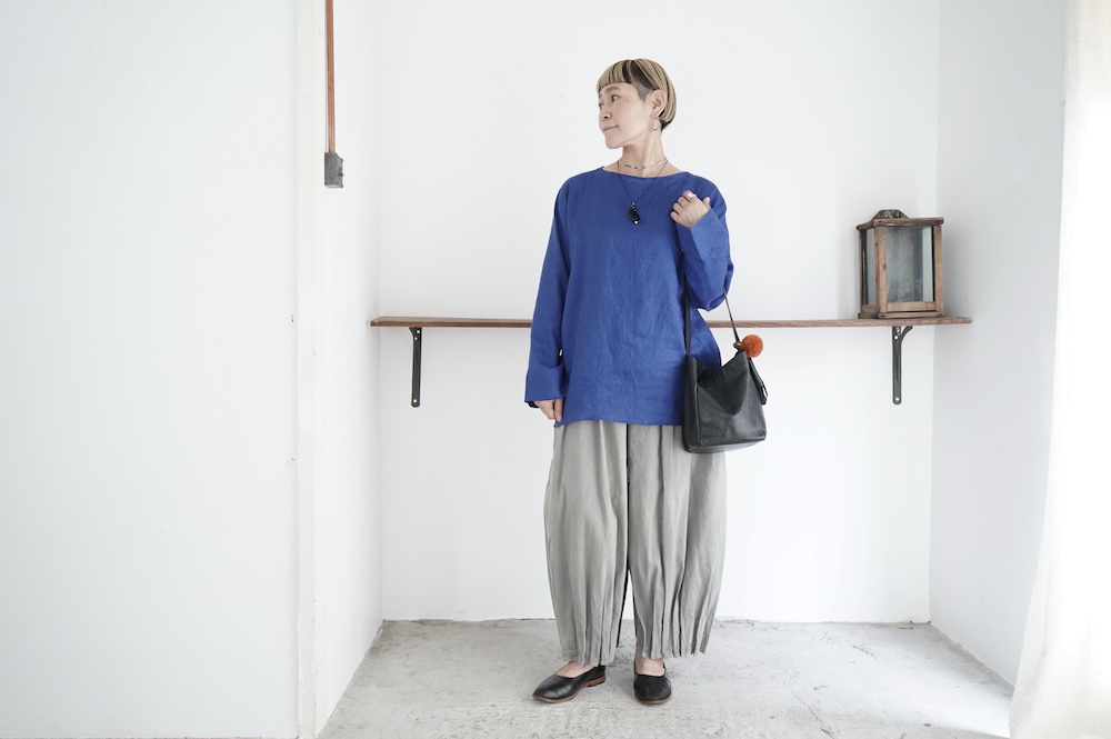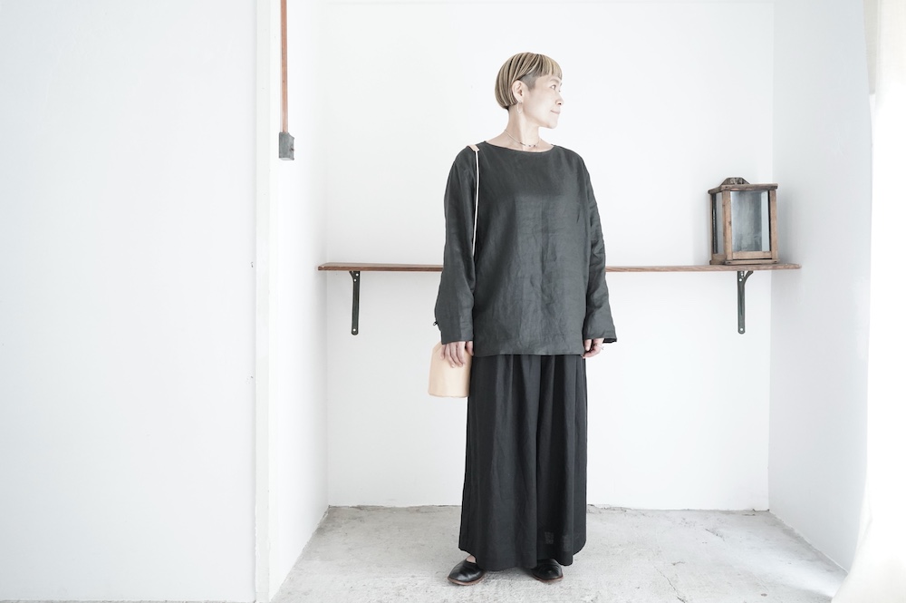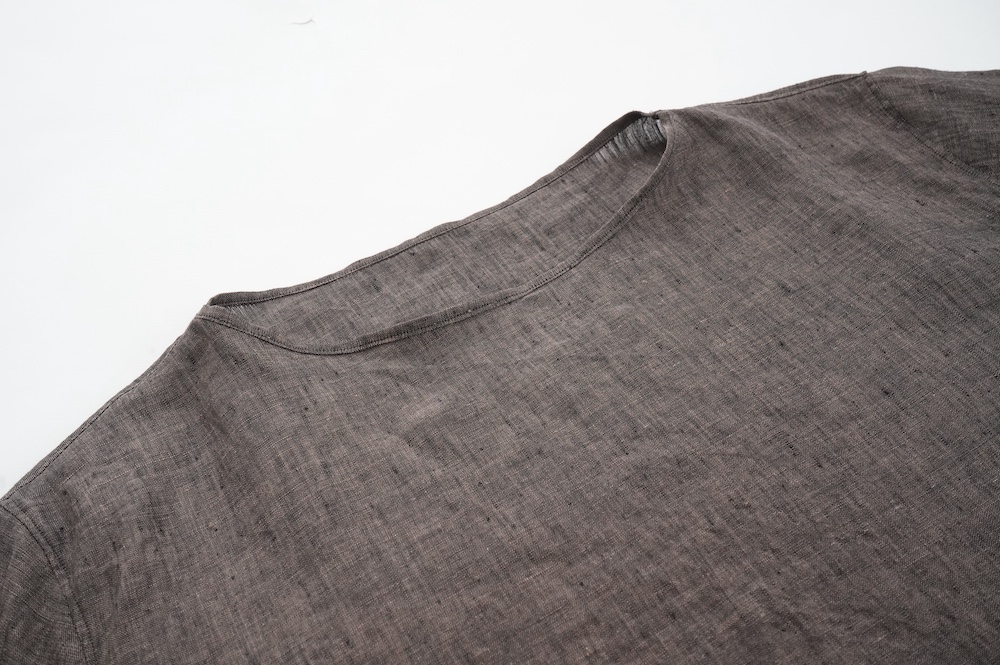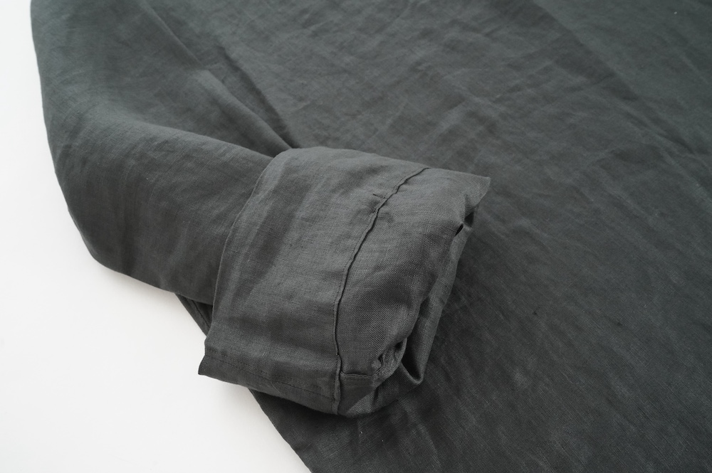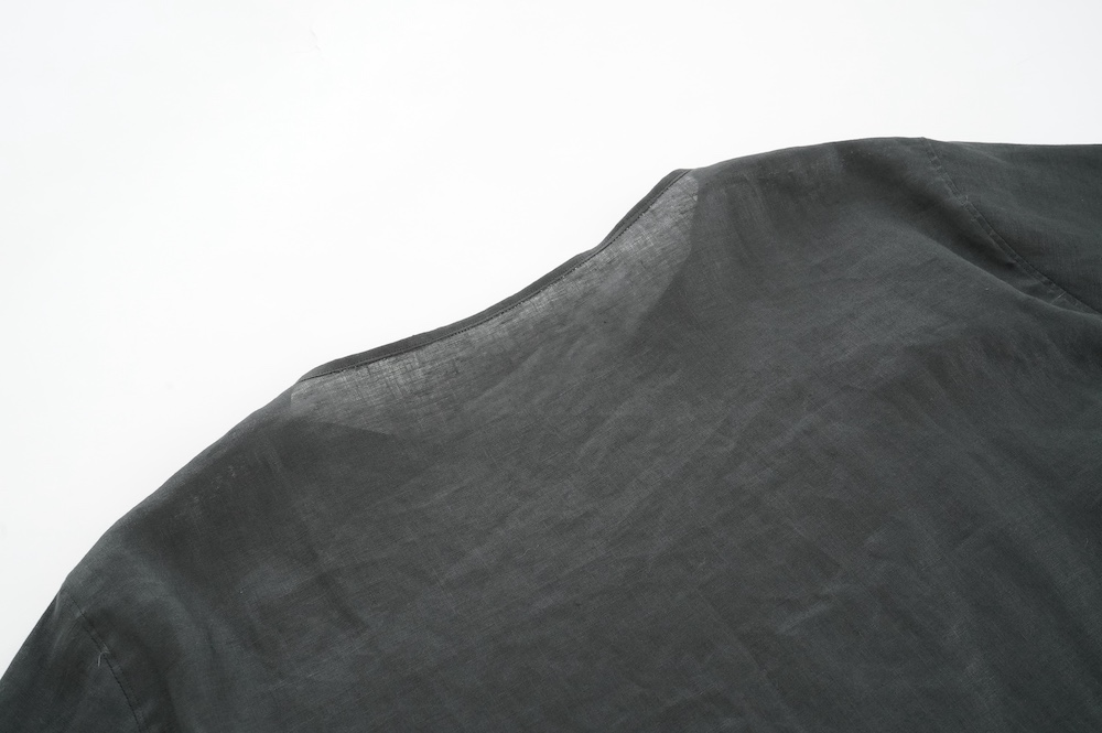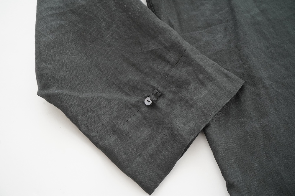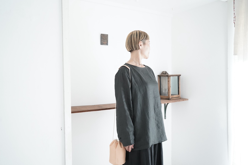デザインは新型のボートネックタイプのプルオーバーシャツ。ネックが横に直線的な襟ぐりになっており、以前のプルオーバーシャツの襟が大きく感じていた方には特にお勧めの新作です。一見すると直線的なシャツに見えますが、ラフでイージーになり過ぎず、風が抜ける適度なゆとりはありながら綺麗なシルエットを実現しています。とても細部まで考えられた秀逸なパターンです。また今回から袖口の仕様を変更し、10cmの見返しをつけて袖口から10cm上にボタンがついています。このボタンを締めた際手首のあたりがキュッとシェイプされてシルエットを少しだけ変えることができます。もちろん袖口をロールアップしても素敵です。ステッチ、パイピングも目立たないように5mm幅。美しい極狭のステッチ幅でデザイナーが自ら縫製をしています。出来るだけ細かいステッチで縫製することで、強度を強くしています。カットソーのように一枚でも、カーディガンやベストに合わせるインナーブラウスとしても、シンプルなのできっと出番の多い一枚になりそうです。