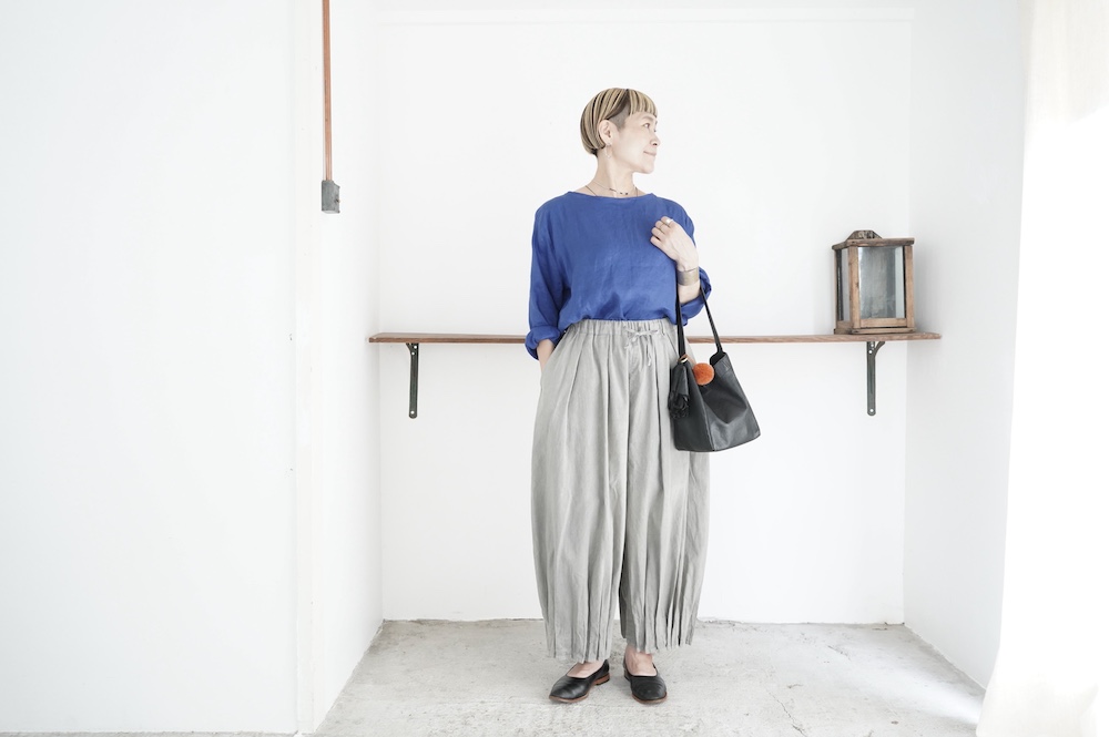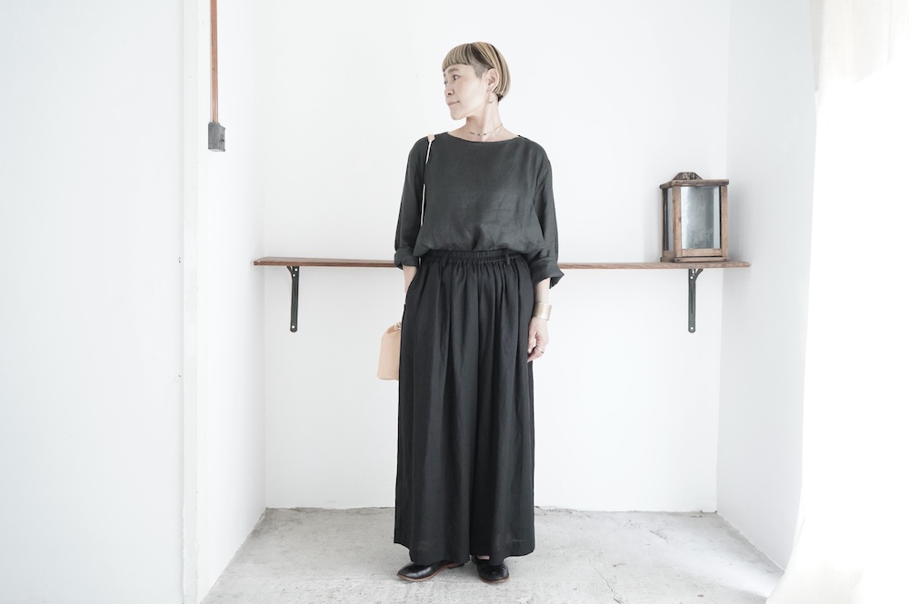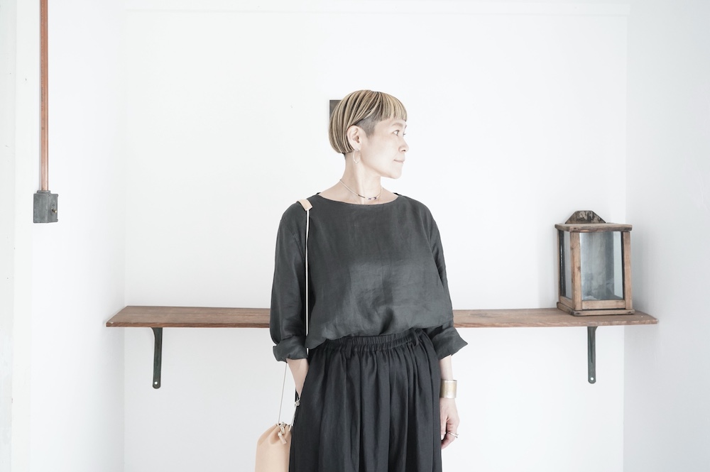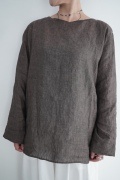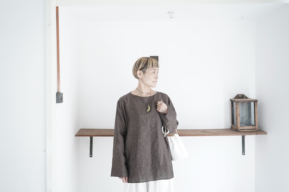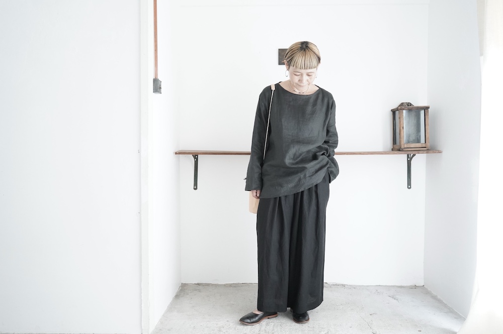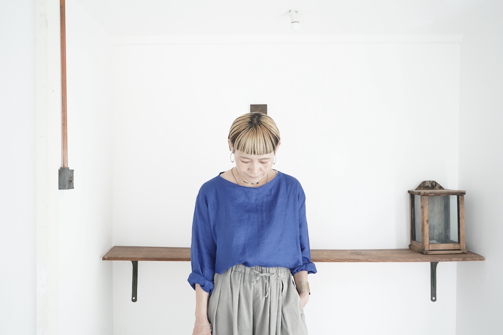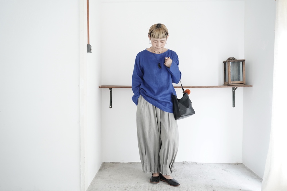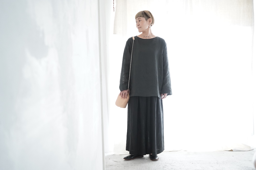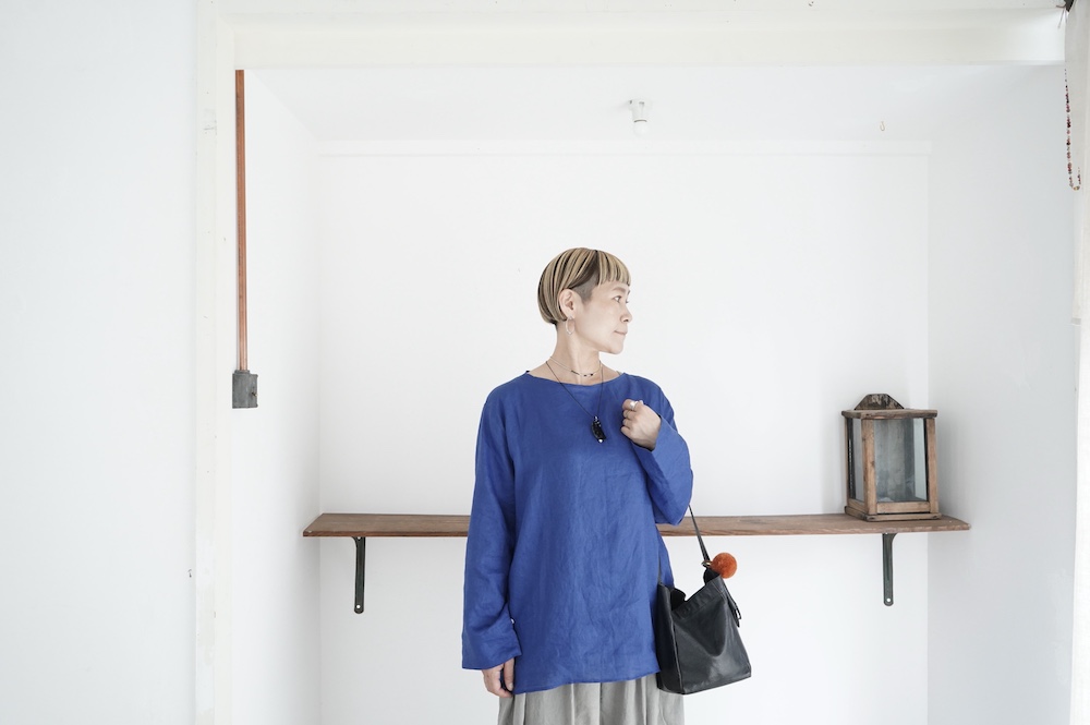 デザインは新型のボートネックタイプのプルオーバーシャツ。ネックが横に直線的な襟ぐりになっており、以前のプルオーバーシャツの襟が大きく感じていた方には特にお勧めの新作です。一見すると直線的なシャツに見えますが、ラフでイージーになり過ぎず、風が抜ける適度なゆとりはありながら綺麗なシルエットを実現しています。とても細部まで考えられた秀逸なパターンです。また今回から袖口の仕様を変更し、10cmの見返しをつけて袖口から10cm上にボタンがついています。このボタンを締めた際手首のあたりがキュッとシェイプされてシルエットを少しだけ変えることができます。もちろん袖口をロールアップしても素敵です。ステッチ、パイピングも目立たないように5mm幅。美しい極狭のステッチ幅でデザイナーが自ら縫製をしています。出来るだけ細かいステッチで縫製することで、強度を強くしています。カットソーのように一枚でも、カーディガンやベストに合わせるインナーブラウスとしても、シンプルなのできっと出番の多い一枚になりそうです。