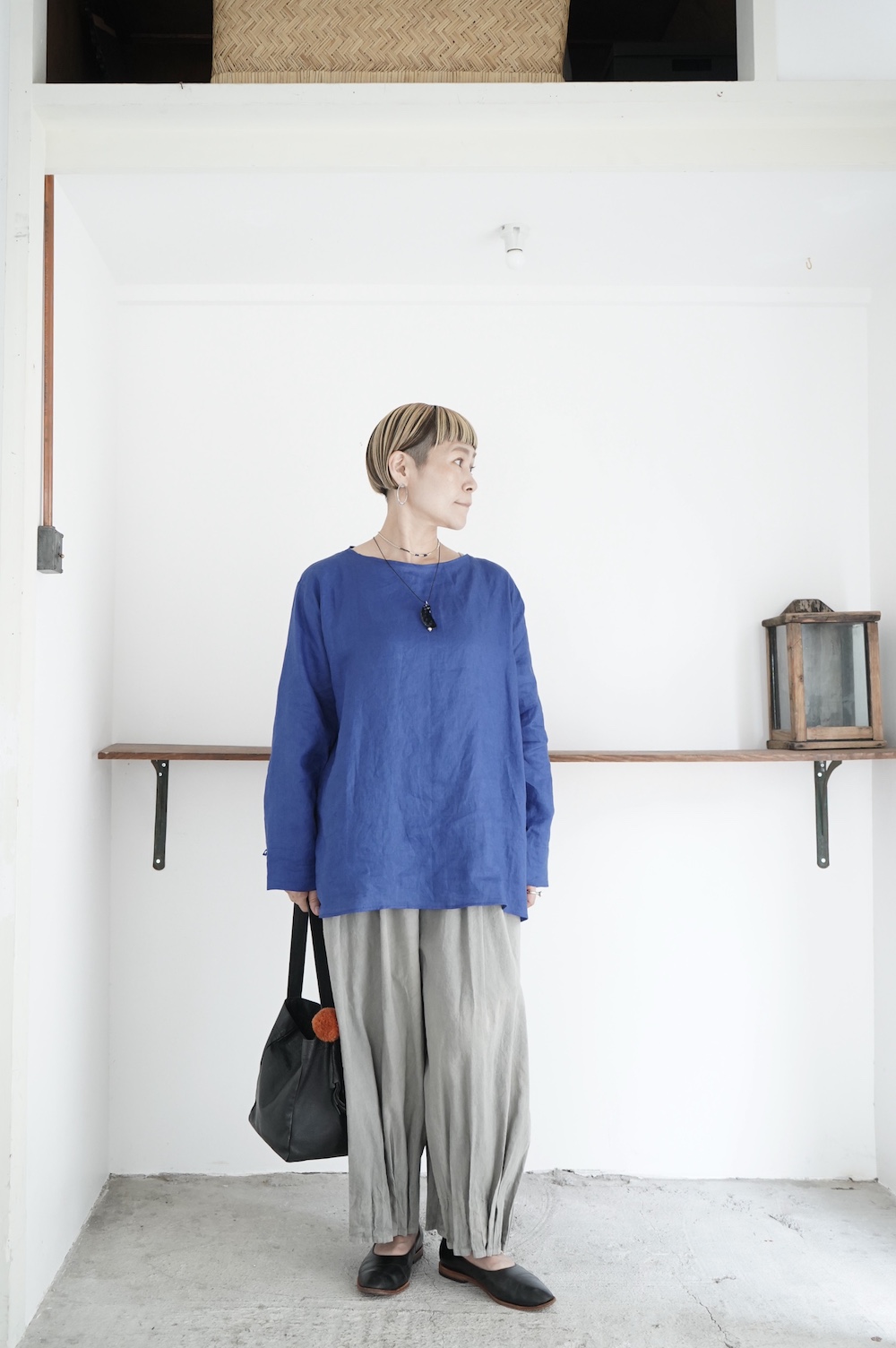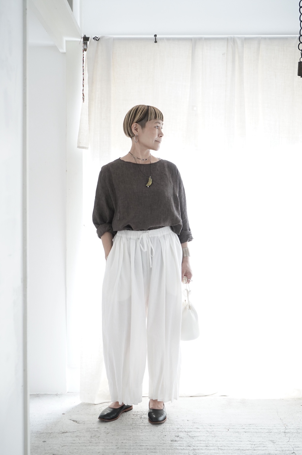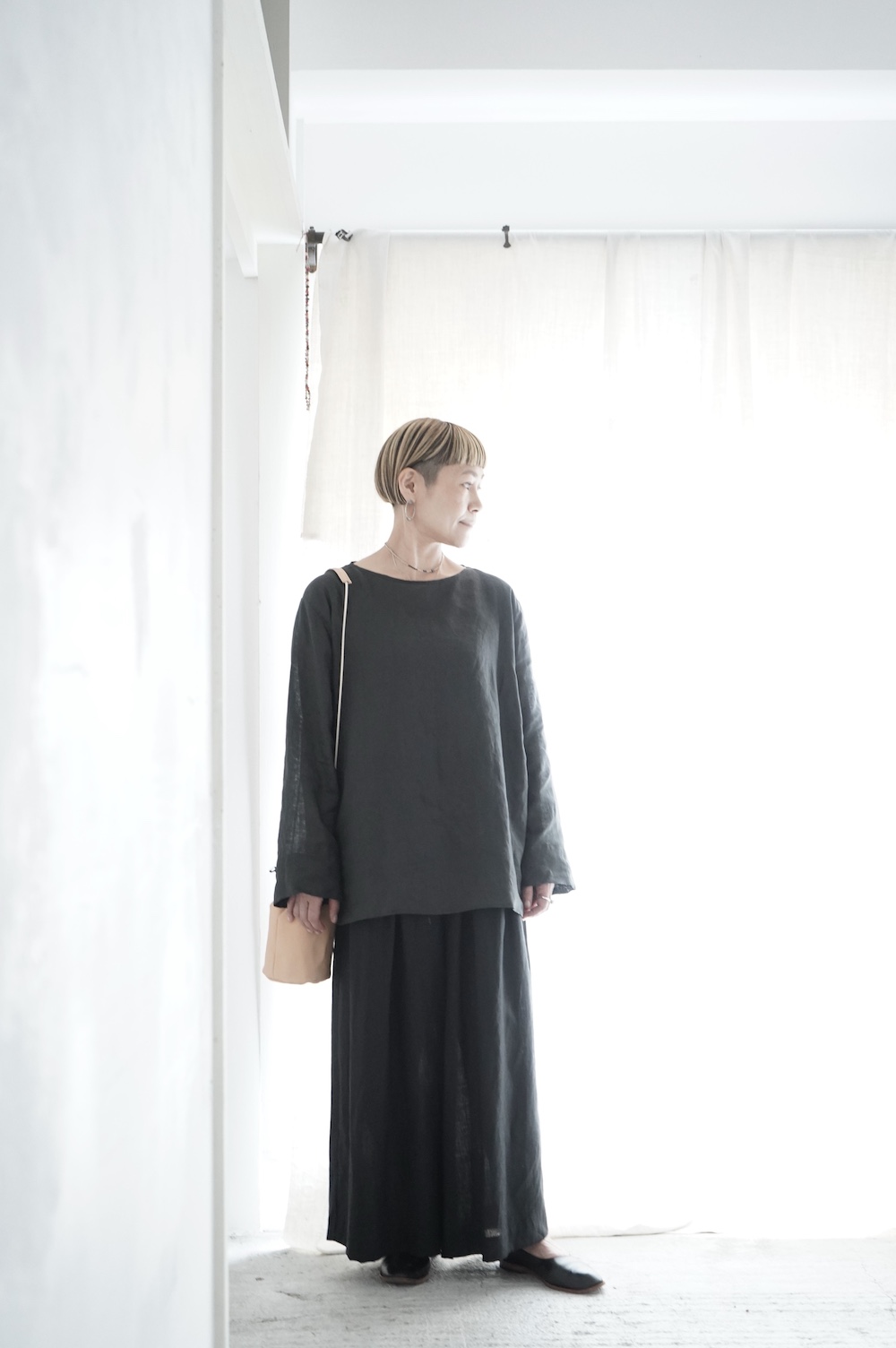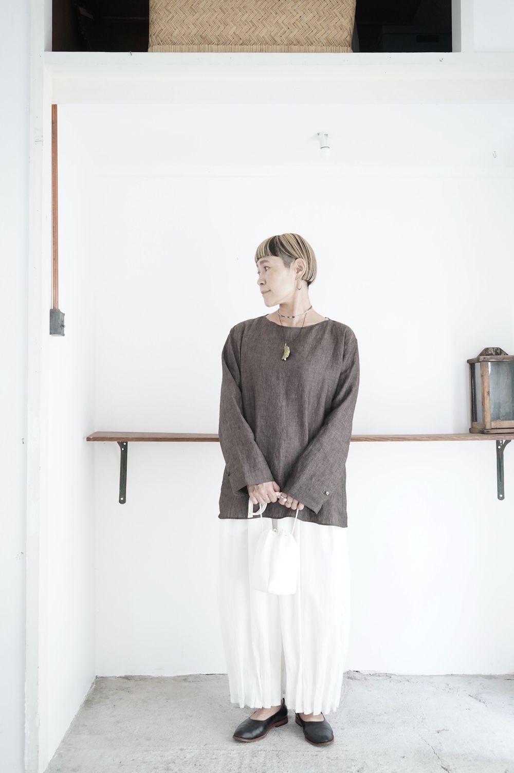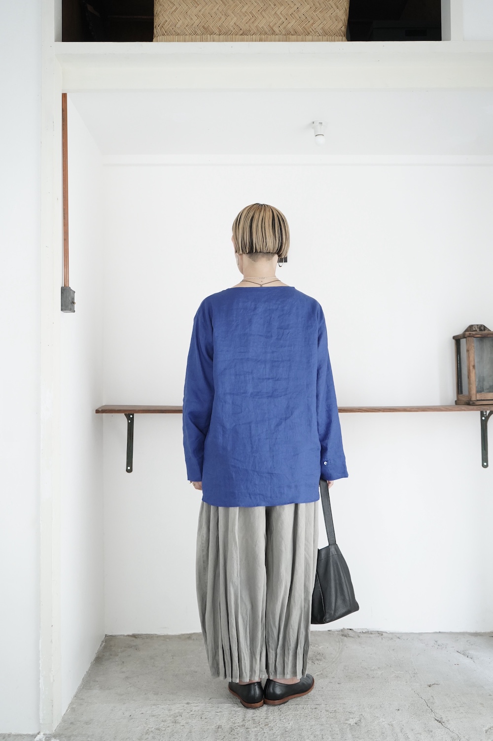 デザインは新型のボートネックタイプのプルオーバーシャツ。ネックが横に直線的な襟ぐりになっており、以前のプルオーバーシャツの襟が大きく感じていた方には特にお勧めの新作です。一見すると直線的なシャツに見えますが、ラフでイージーになり過ぎず、風が抜ける適度なゆとりはありながら綺麗なシルエットを実現しています。とても細部まで考えられた秀逸なパターンです。また今回から袖口の仕様を変更し、10cmの見返しをつけて袖口から10cm上にボタンがついています。このボタンを締めた際手首のあたりがキュッとシェイプされてシルエットを少しだけ変えることができます。もちろん袖口をロールアップしても素敵です。ステッチ、パイピングも目立たないように5mm幅。美しい極狭のステッチ幅でデザイナーが自ら縫製をしています。出来るだけ細かいステッチで縫製することで、強度を強くしています。カットソーのように一枚でも、カーディガンやベストに合わせるインナーブラウスとしても、シンプルなのできっと出番の多い一枚になりそうです。