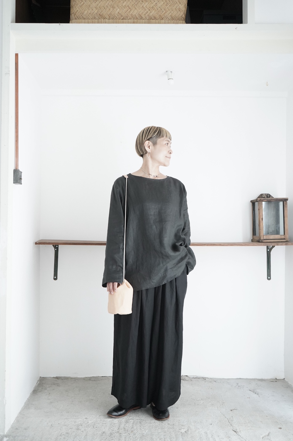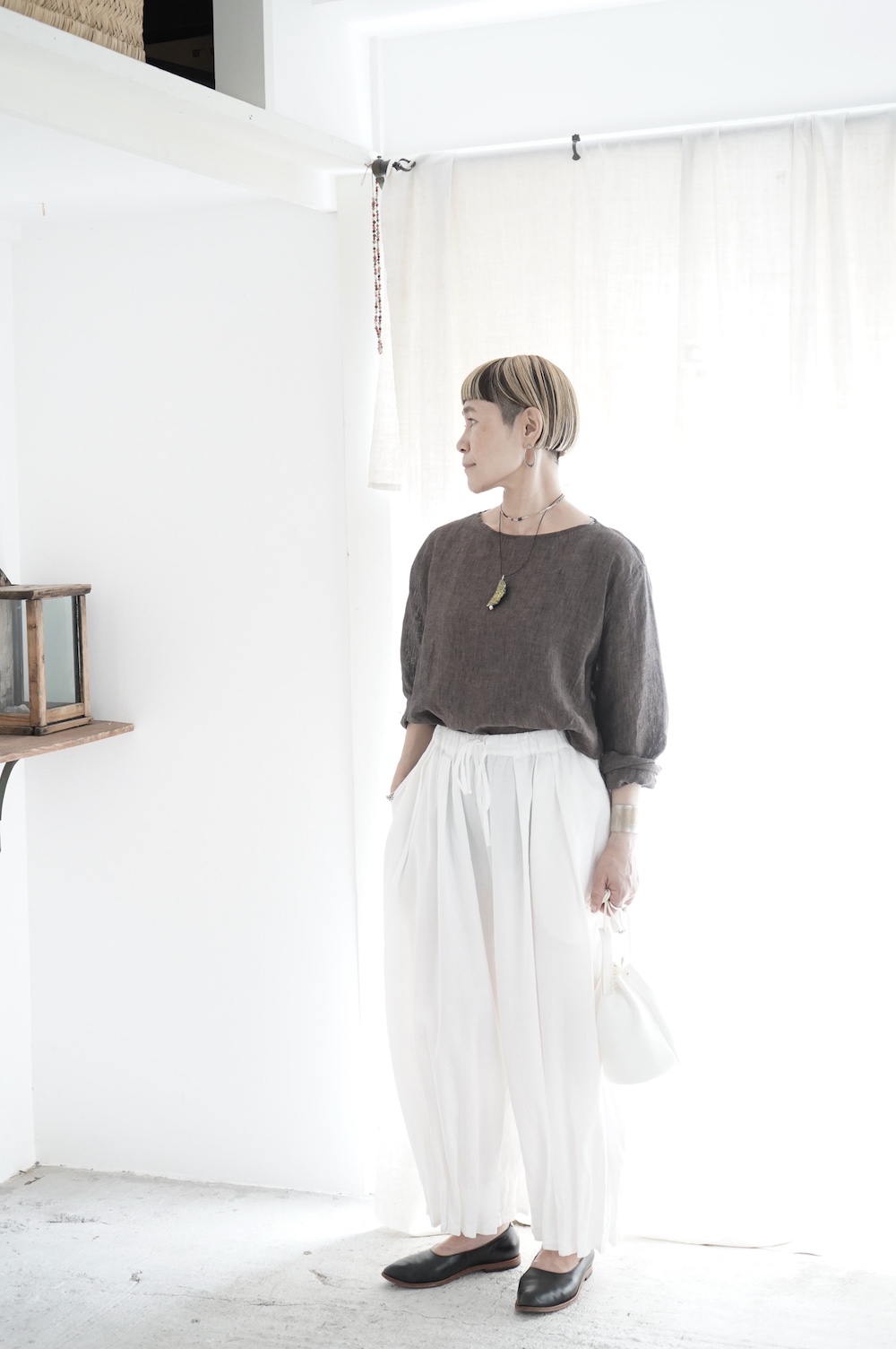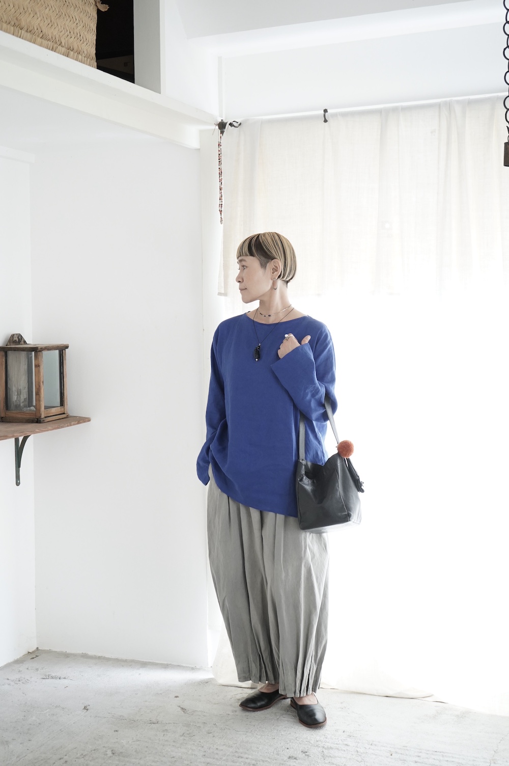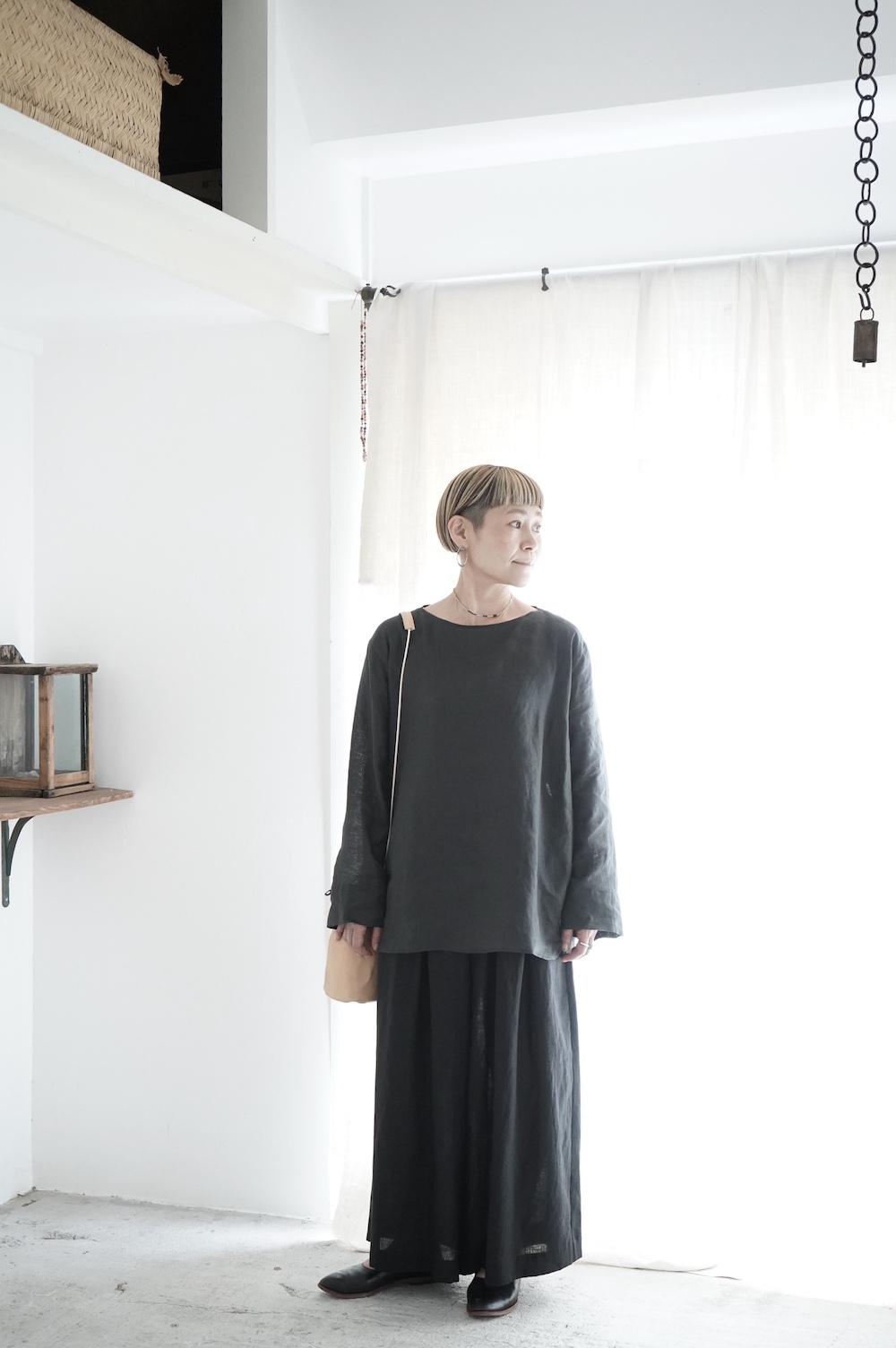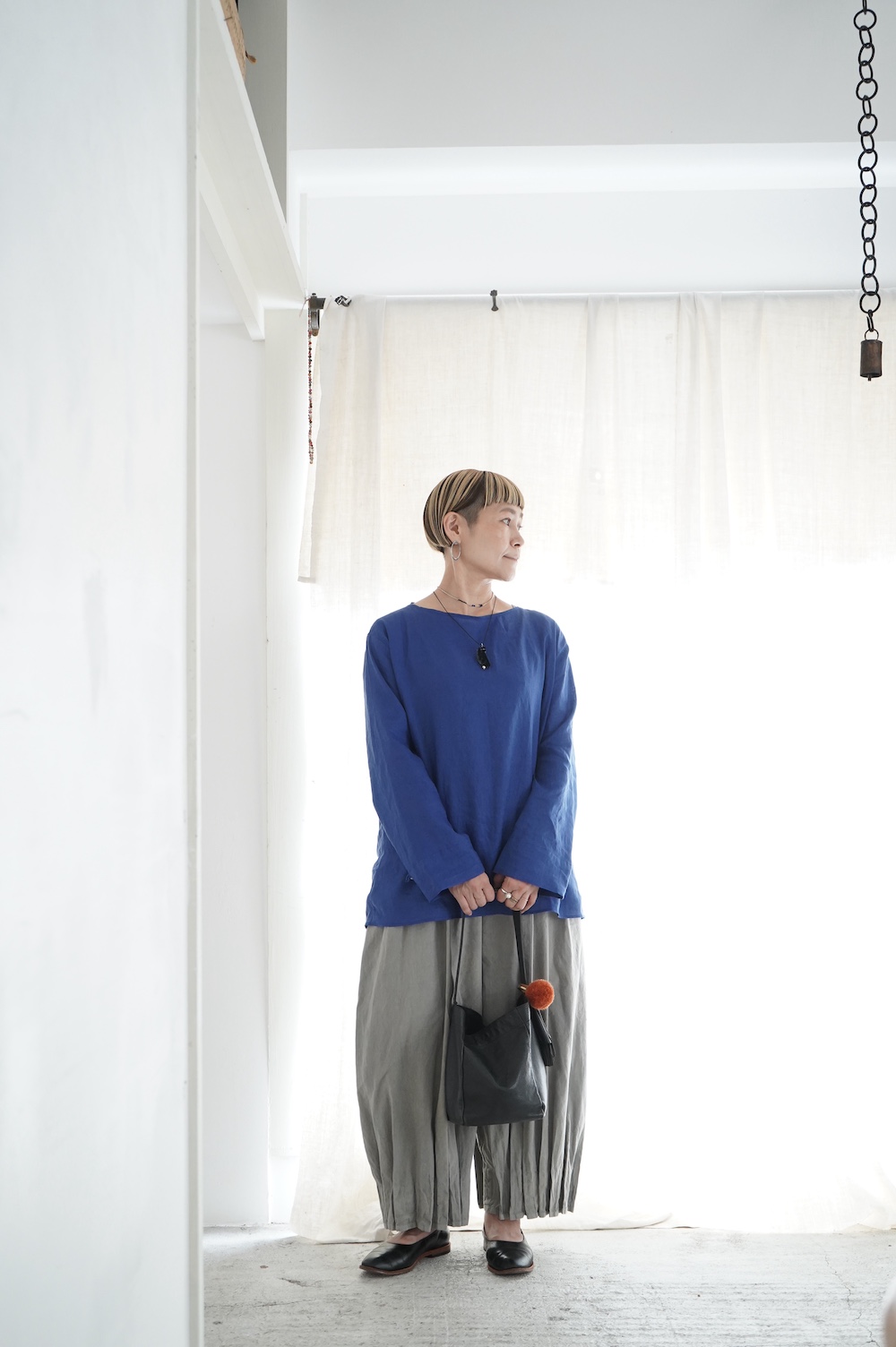デザインは新型のボートネックタイプのプルオーバーシャツ。ネックが横に直線的な襟ぐりになっており、以前のプルオーバーシャツの襟が大きく感じていた方には特にお勧めの新作です。一見すると直線的なシャツに見えますが、ラフでイージーになり過ぎず、風が抜ける適度なゆとりはありながら綺麗なシルエットを実現しています。とても細部まで考えられた秀逸なパターンです。また今回から袖口の仕様を変更し、10cmの見返しをつけて袖口から10cm上にボタンがついています。このボタンを締めた際手首のあたりがキュッとシェイプされてシルエットを少しだけ変えることができます。もちろん袖口をロールアップしても素敵です。ステッチ、パイピングも目立たないように5mm幅。美しい極狭のステッチ幅でデザイナーが自ら縫製をしています。出来るだけ細かいステッチで縫製することで、強度を強くしています。カットソーのように一枚でも、カーディガンやベストに合わせるインナーブラウスとしても、シンプルなのできっと出番の多い一枚になりそうです。
