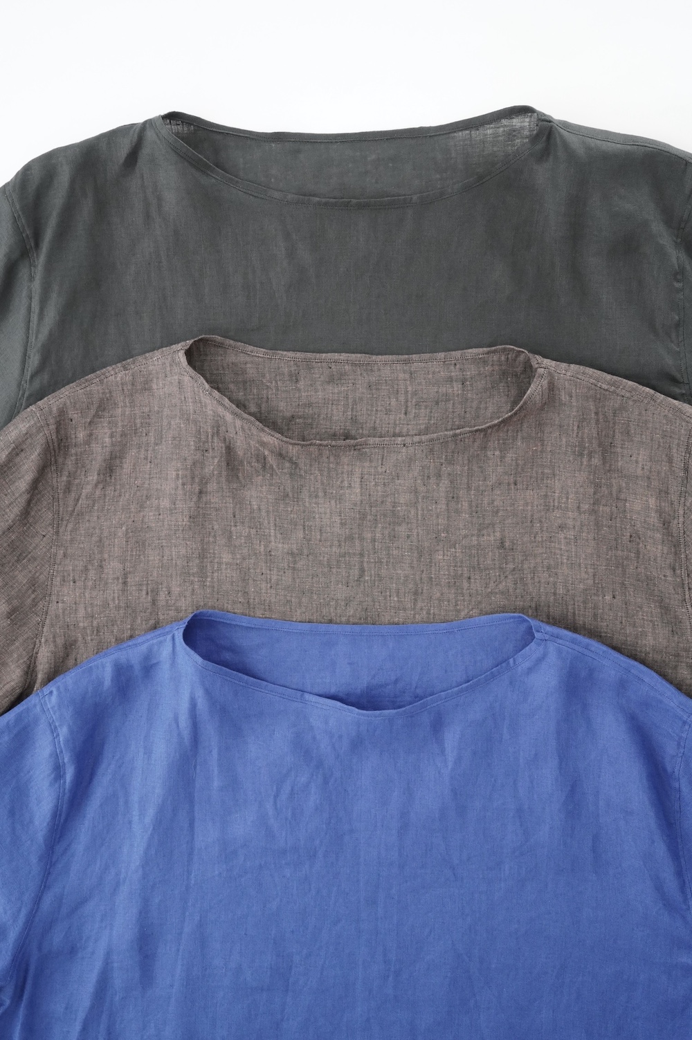 "クロイゼ"のシャツ。細番手のリネン糸を使用した、光沢感のあるリネン生地を使用。薄手で風が抜けるような清涼感のある素材です。また色によっても若干風合いが異なり、ブルーとチャコールは上品な光沢感が増した滑らかな手触り。ブロンズは経糸緯糸で色を変えており、ネップ感が強く色みに奥行きのあるカラーです。