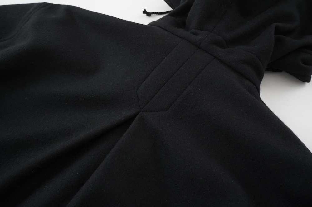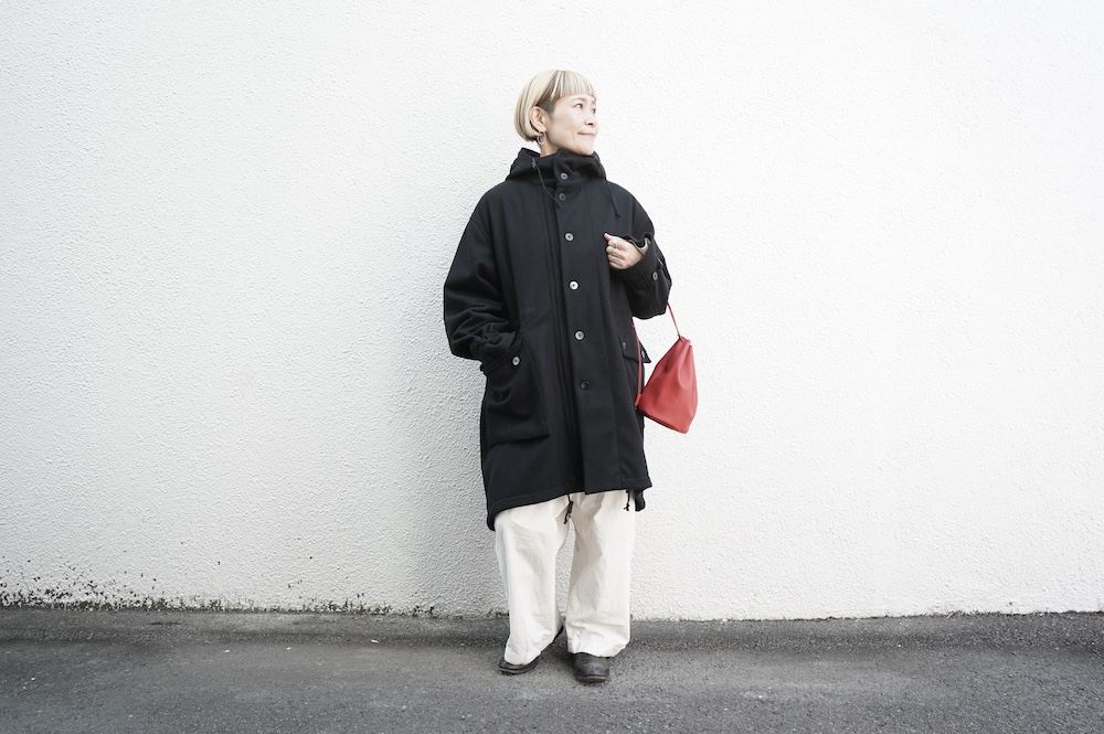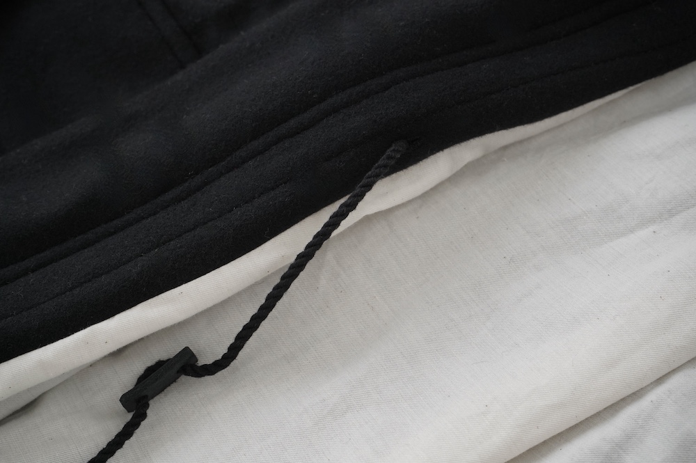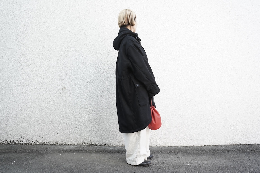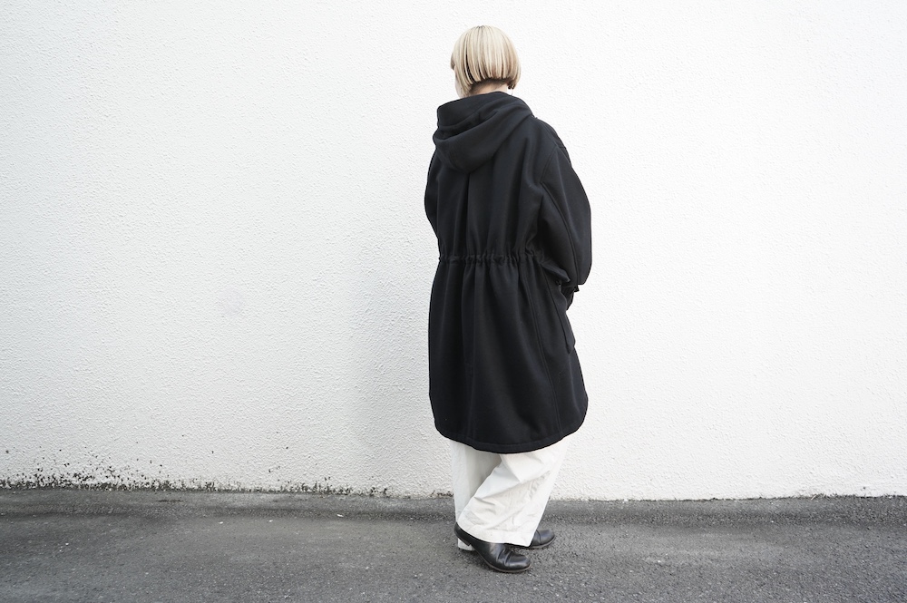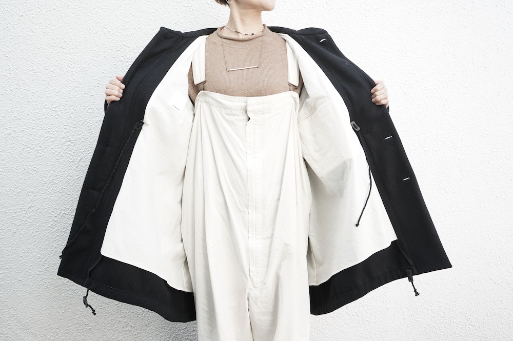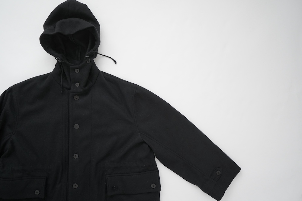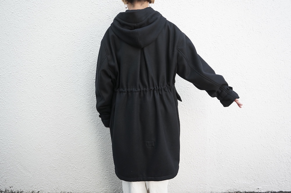 デザインは、ミリタリーコートをデザインベースに作られたフード付きコート。大きなフラップ付きのポケットがポイントで、フード部分、ウエスト部分、裾にもともとは防寒、防風のために付いていたドローコードをデザイン的に残しており、ギャザーを寄せてシルエットを変えることが可能です。また、袖口にはベルトがついており、ボタン位置を変えてキュッと袖口を絞ることができます。その他にも、裾には風による煽り防止の当時のディテールを残したり、フロントの比翼布にボタンホールを開けることで打ち合わせを変化させ、前見頃からの寒風を防ぐ当時のミリタリーディテールも採用しています。身幅や袖幅など全体的にオーバーサイズなので、ドローコードや袖口のベルトでシルエットを変えながら、様々なスタイルでお楽しみいただけると素敵かと思います。
