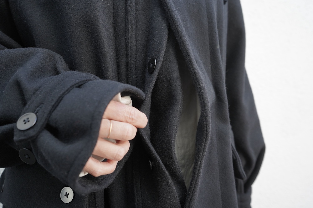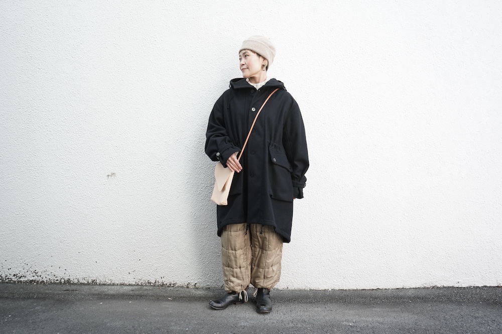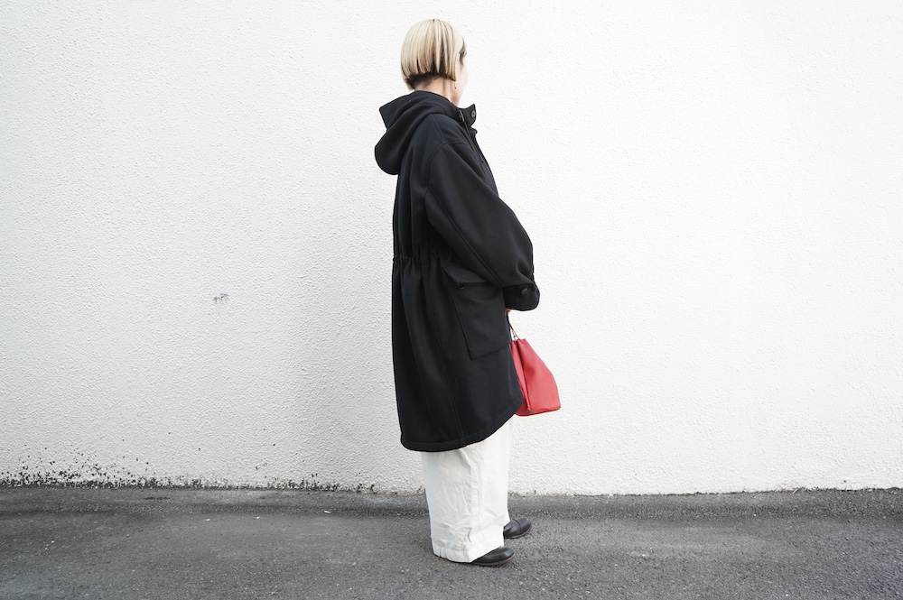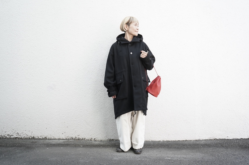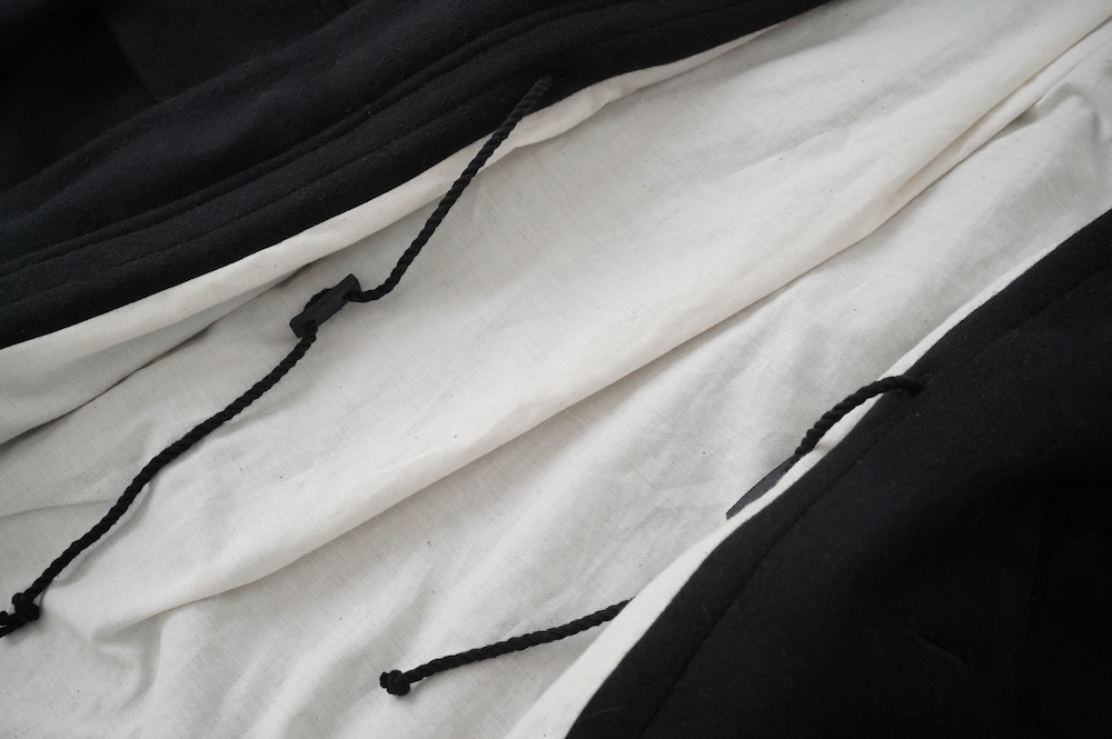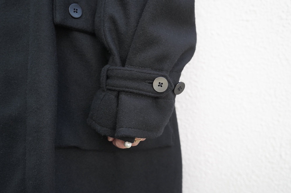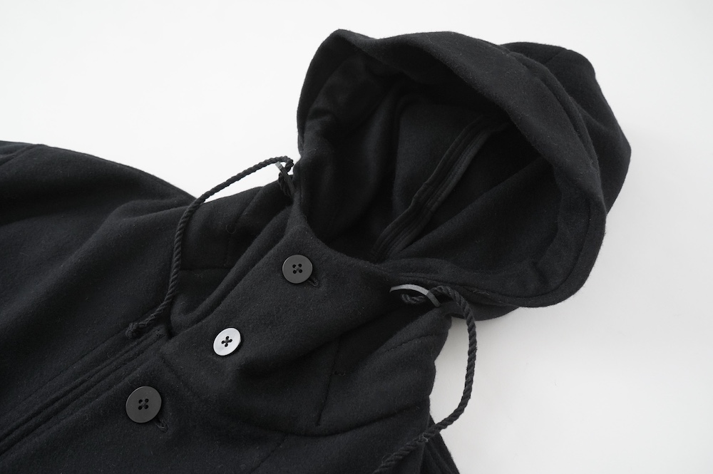 デザインは、ミリタリーコートをデザインベースに作られたフード付きコート。大きなフラップ付きのポケットがポイントで、フード部分、ウエスト部分、裾にもともとは防寒、防風のために付いていたドローコードをデザイン的に残しており、ギャザーを寄せてシルエットを変えることが可能です。また、袖口にはベルトがついており、ボタン位置を変えてキュッと袖口を絞ることができます。その他にも、裾には風による煽り防止の当時のディテールを残したり、フロントの比翼布にボタンホールを開けることで打ち合わせを変化させ、前見頃からの寒風を防ぐ当時のミリタリーディテールも採用しています。身幅や袖幅など全体的にオーバーサイズなので、ドローコードや袖口のベルトでシルエットを変えながら、様々なスタイルでお楽しみいただけると素敵かと思います。
