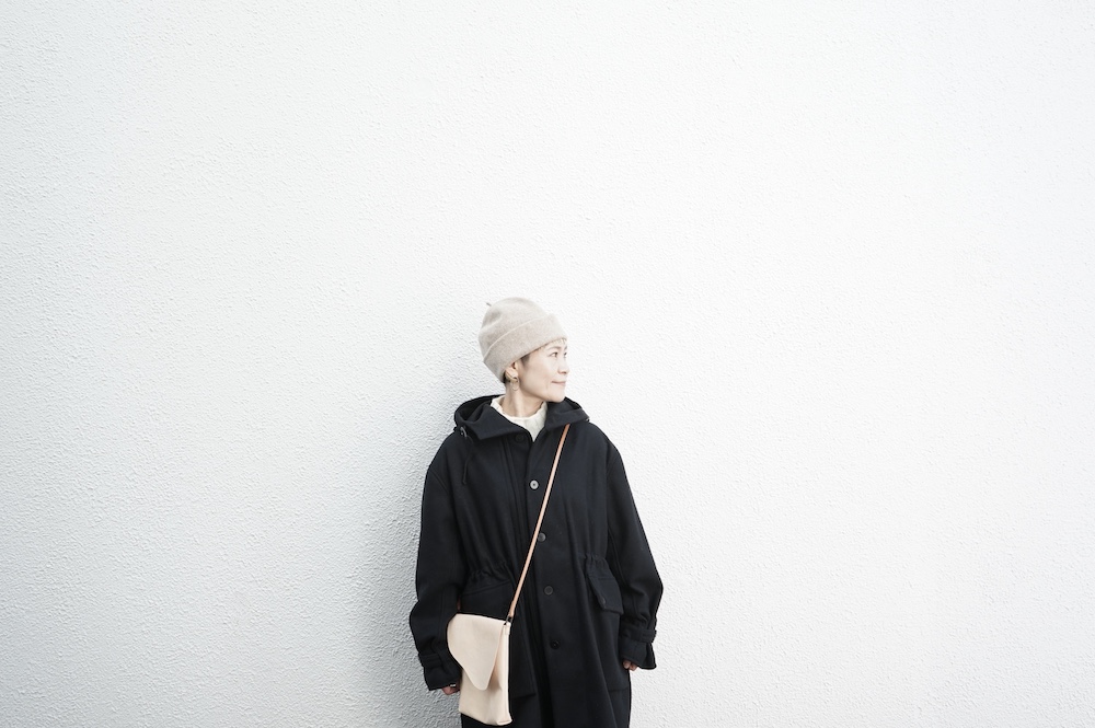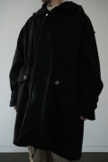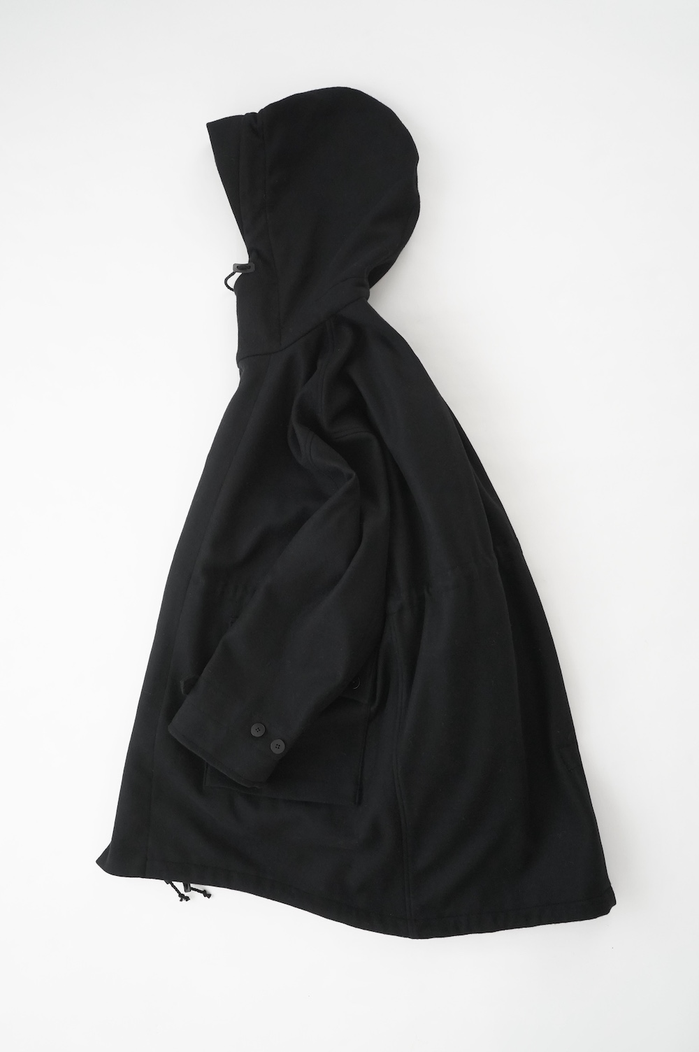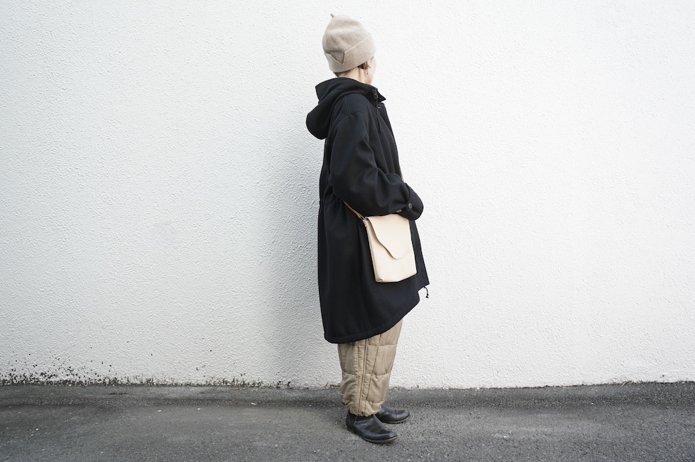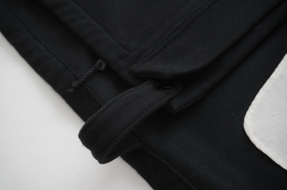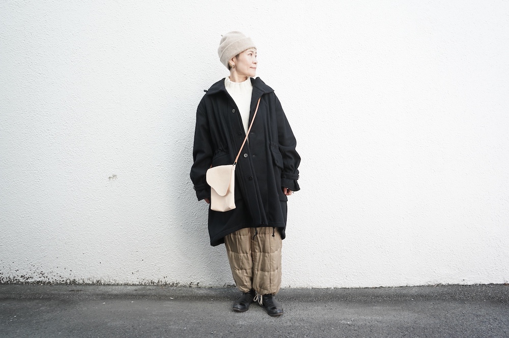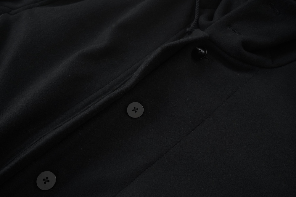 デザインは、ミリタリーコートをデザインベースに作られたフード付きコート。大きなフラップ付きのポケットがポイントで、フード部分、ウエスト部分、裾にもともとは防寒、防風のために付いていたドローコードをデザイン的に残しており、ギャザーを寄せてシルエットを変えることが可能です。また、袖口にはベルトがついており、ボタン位置を変えてキュッと袖口を絞ることができます。その他にも、裾には風による煽り防止の当時のディテールを残したり、フロントの比翼布にボタンホールを開けることで打ち合わせを変化させ、前見頃からの寒風を防ぐ当時のミリタリーディテールも採用しています。身幅や袖幅など全体的にオーバーサイズなので、ドローコードや袖口のベルトでシルエットを変えながら、様々なスタイルでお楽しみいただけると素敵かと思います。