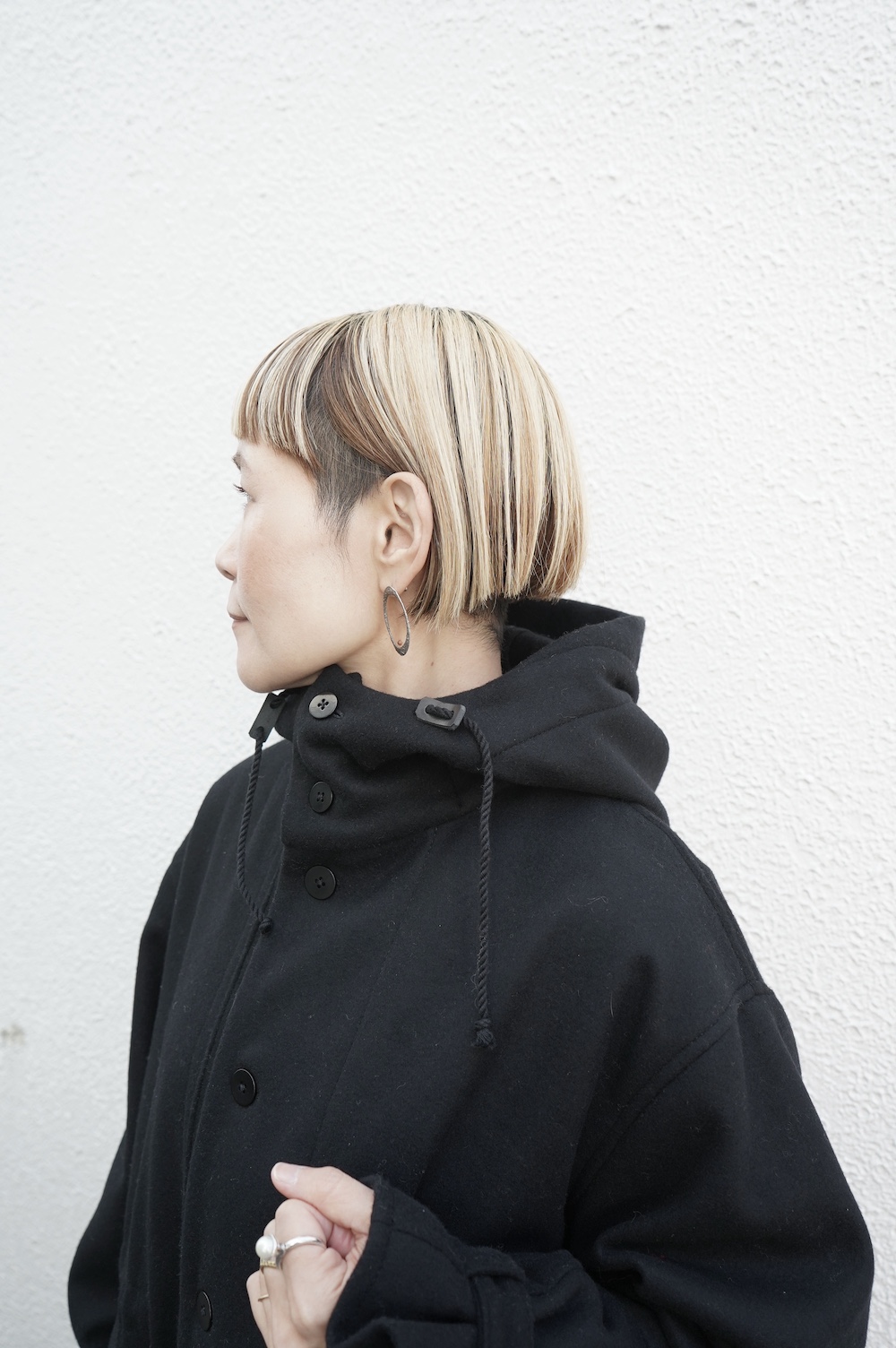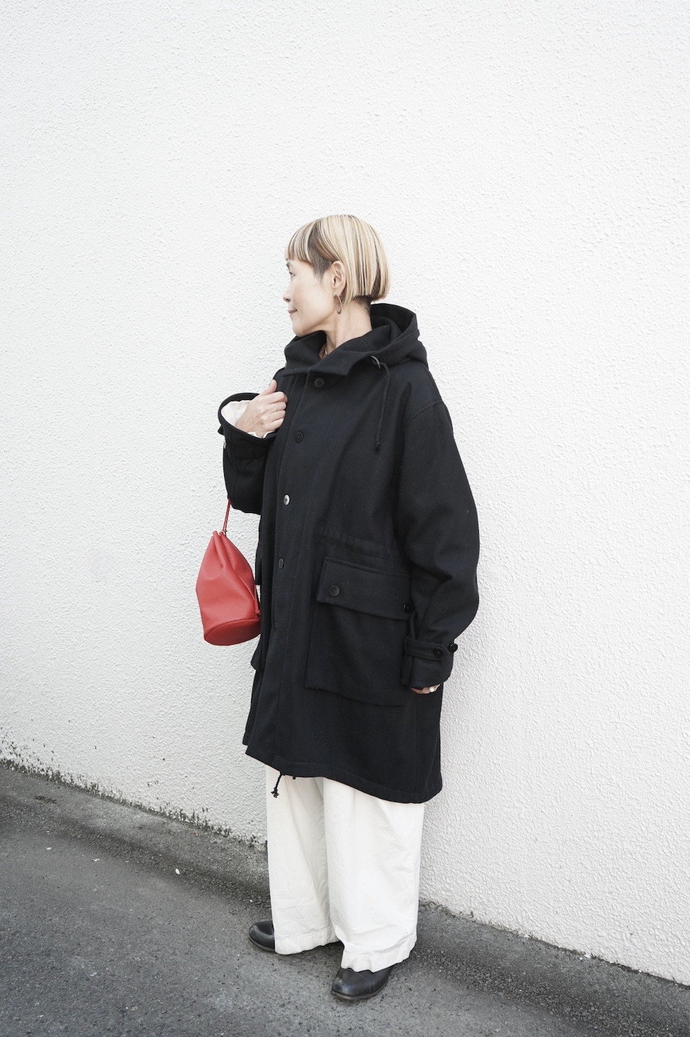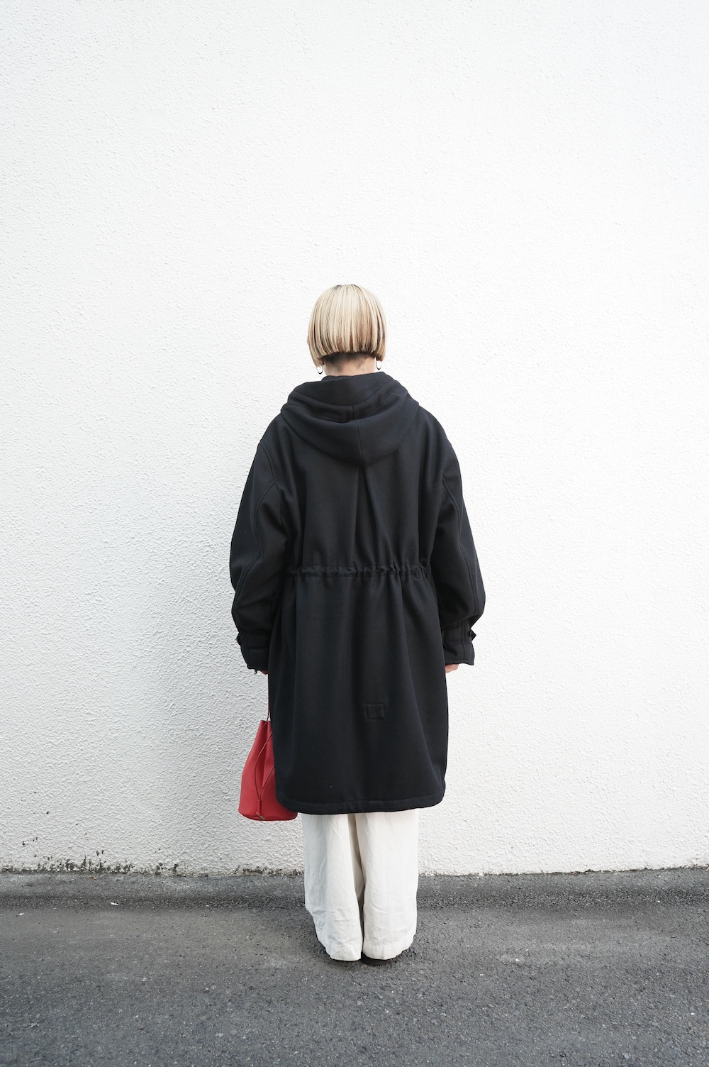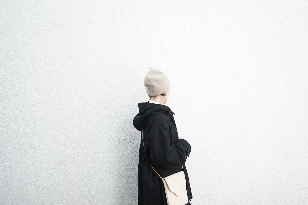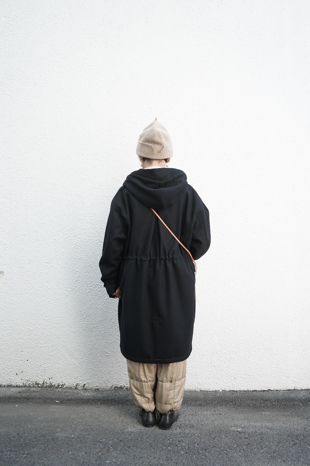 デザインは、ミリタリーコートをデザインベースに作られたフード付きコート。大きなフラップ付きのポケットがポイントで、フード部分、ウエスト部分、裾にもともとは防寒、防風のために付いていたドローコードをデザイン的に残しており、ギャザーを寄せてシルエットを変えることが可能です。また、袖口にはベルトがついており、ボタン位置を変えてキュッと袖口を絞ることができます。その他にも、裾には風による煽り防止の当時のディテールを残したり、フロントの比翼布にボタンホールを開けることで打ち合わせを変化させ、前見頃からの寒風を防ぐ当時のミリタリーディテールも採用しています。身幅や袖幅など全体的にオーバーサイズなので、ドローコードや袖口のベルトでシルエットを変えながら、様々なスタイルでお楽しみいただけると素敵かと思います。