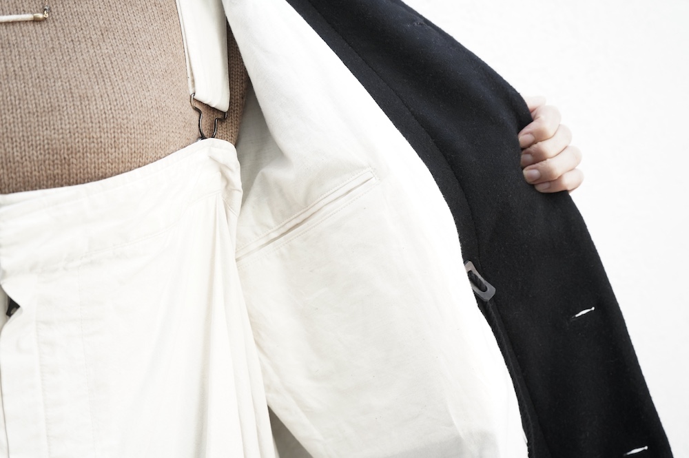 1900年〜1920年台のクラシックなもの作りに共感しながら、自身のフィルターを通すことで引き算を繰り返し、クラシックを程よく残した現代服に仕立てています。