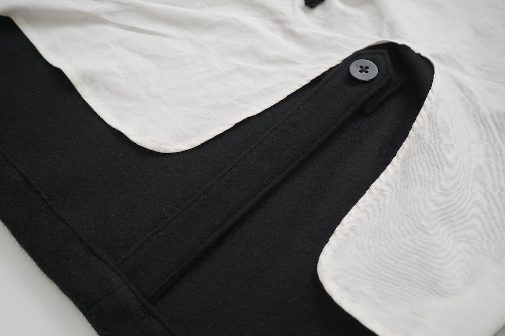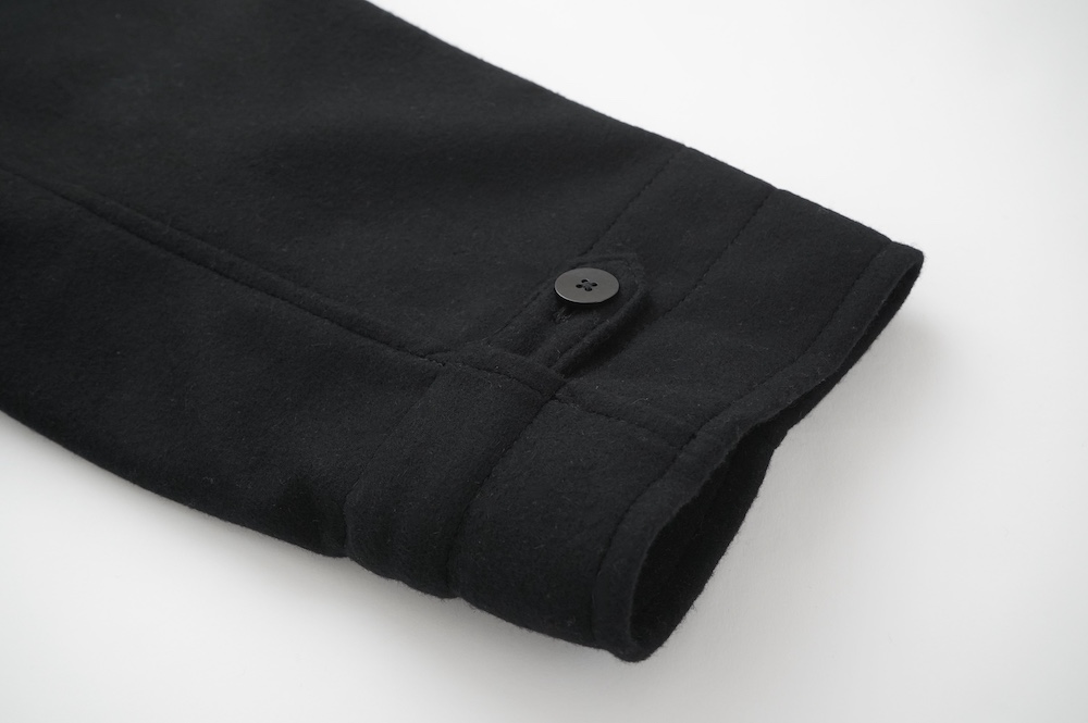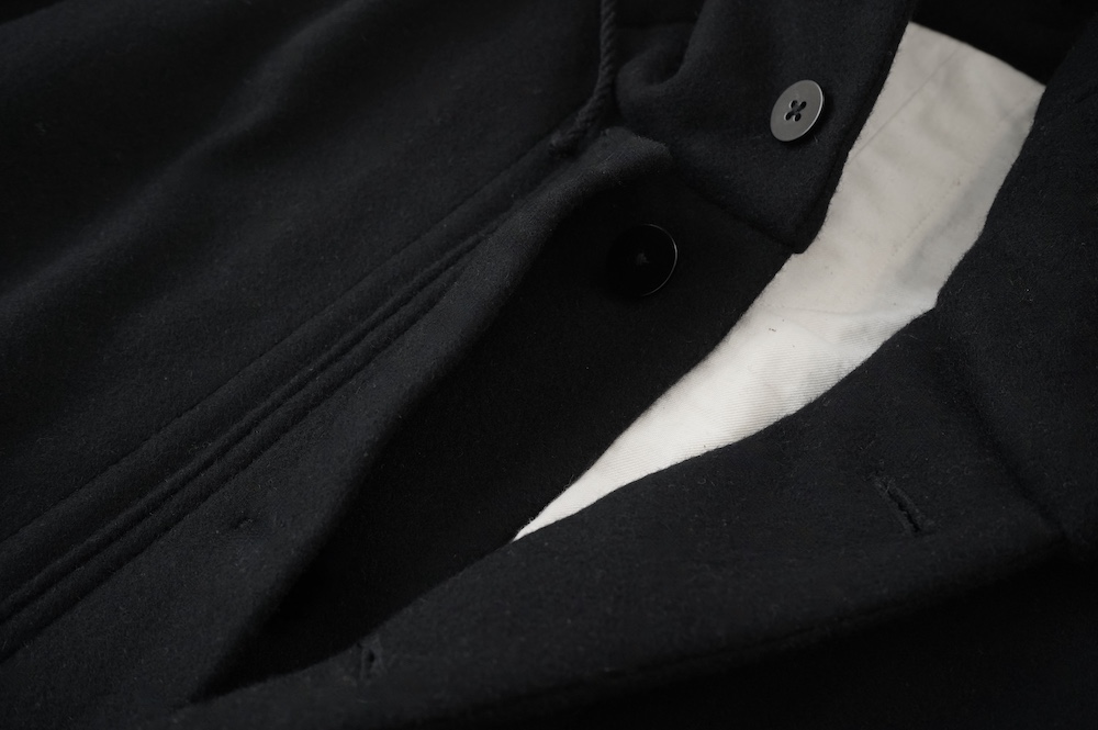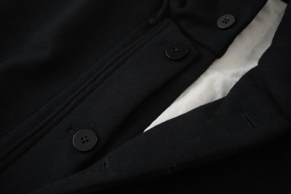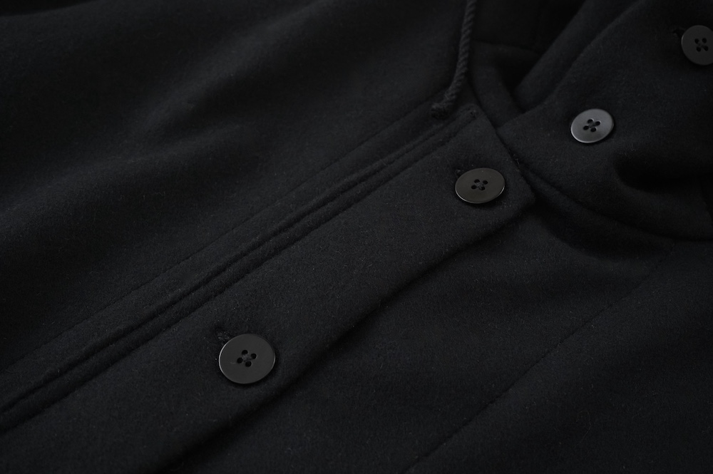 フロントの比翼布にボタンホールを開ける当時の英国ミリタリーの仕様は、左前身頃の前端を一番上に合わせたり、寒さが厳しい状況では比翼布の下に合わせ、比翼布を上から被せることで防寒を高めることができる機能性のあるデザインとなっている。
