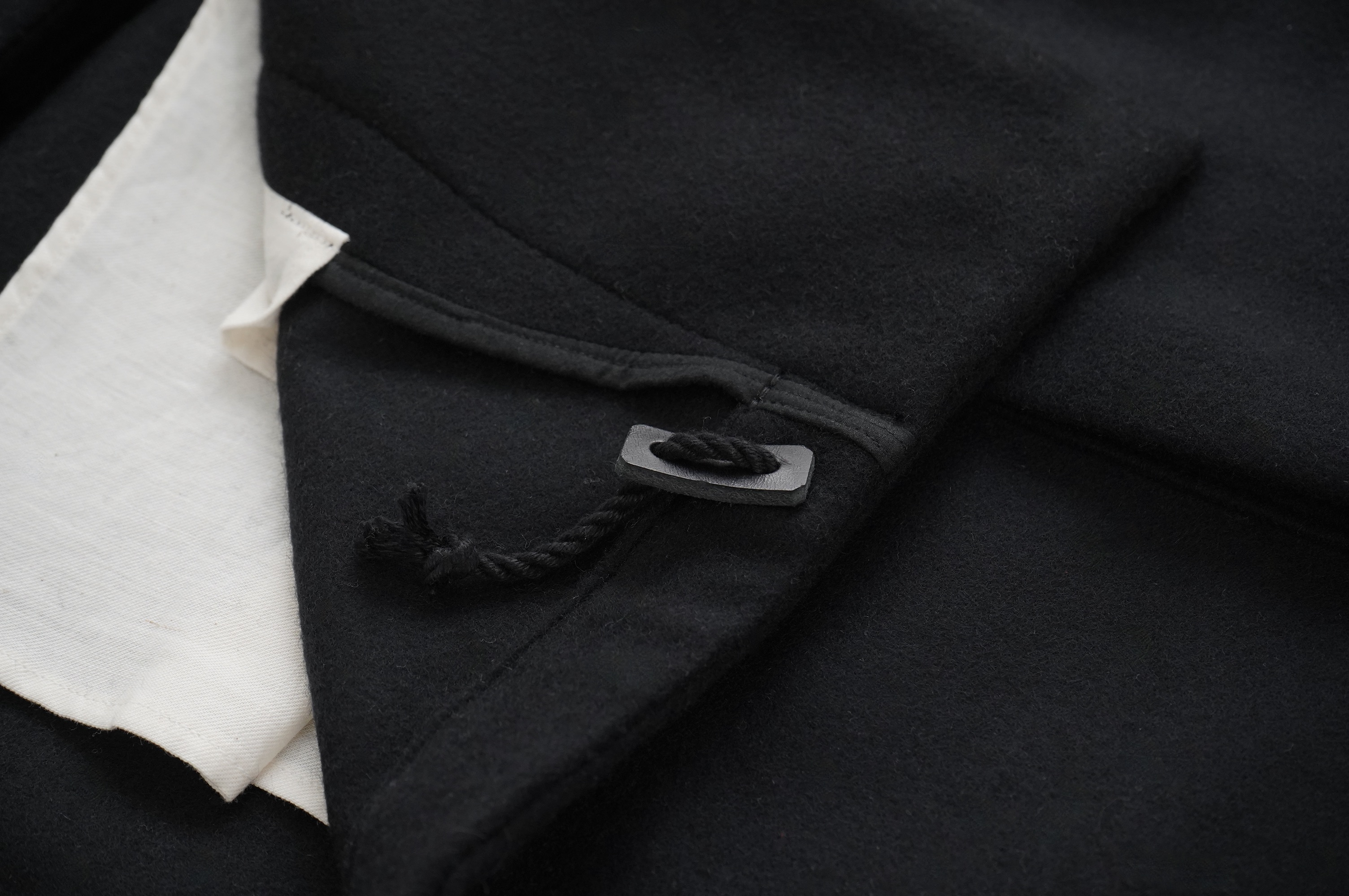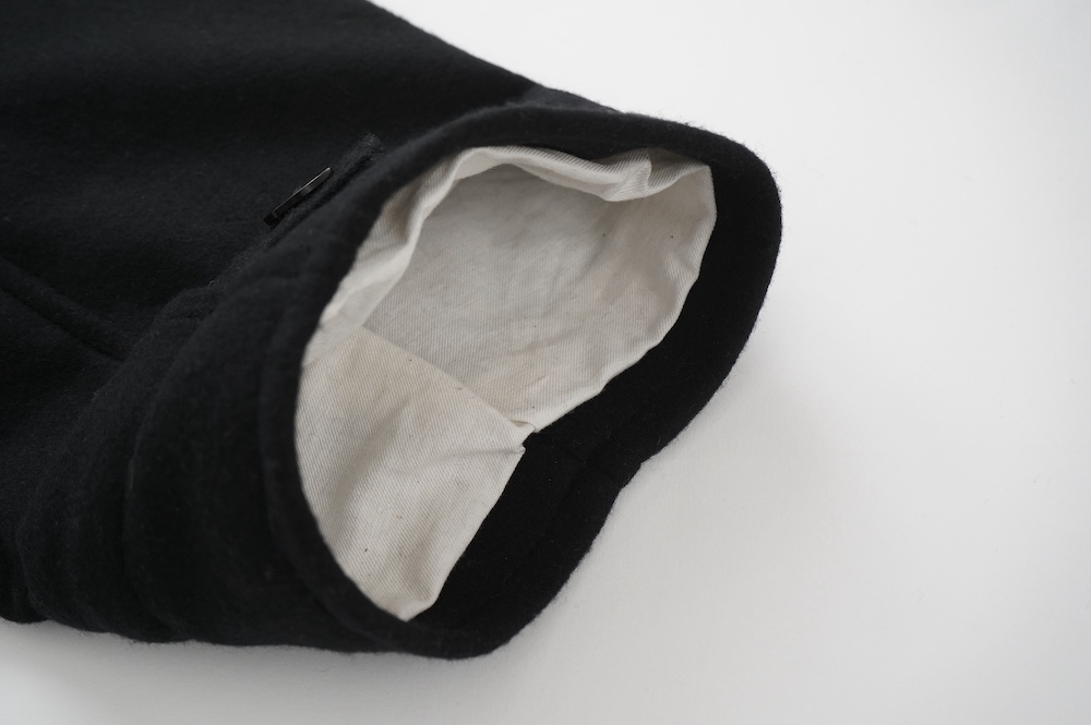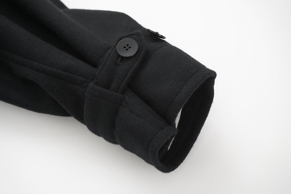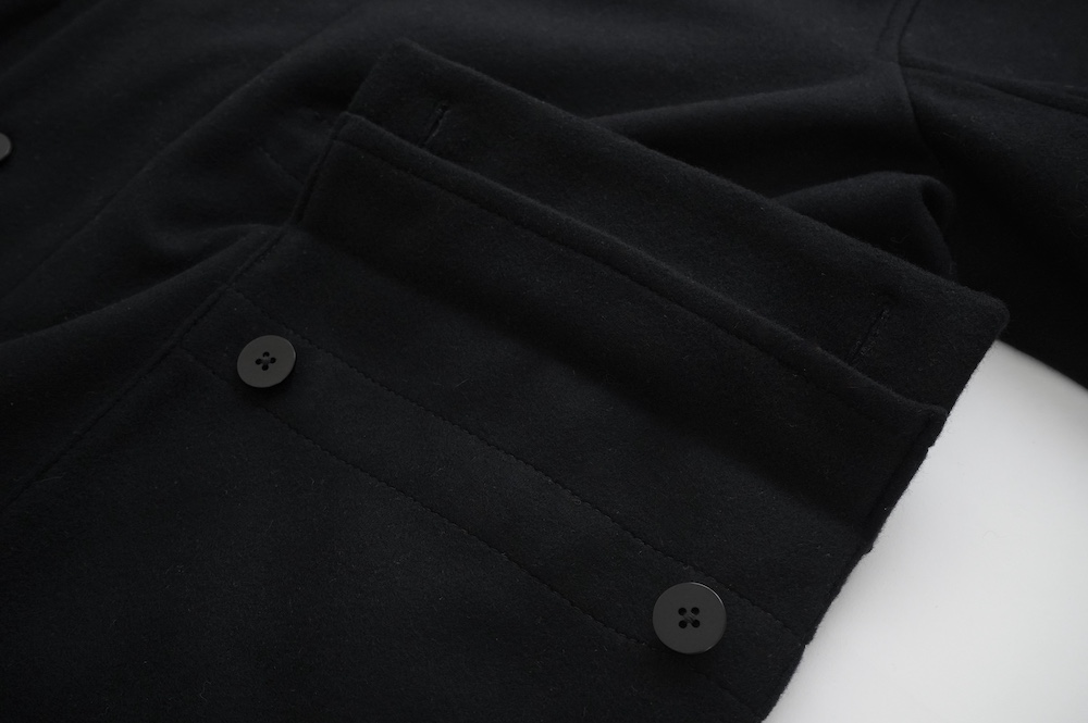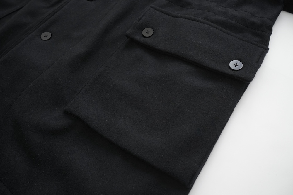 フロントの比翼布にボタンホールを開ける当時の英国ミリタリーの仕様は、左前身頃の前端を一番上に合わせたり、寒さが厳しい状況では比翼布の下に合わせ、比翼布を上から被せることで防寒を高めることができる機能性のあるデザインとなっている。