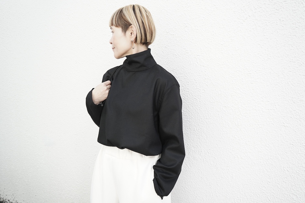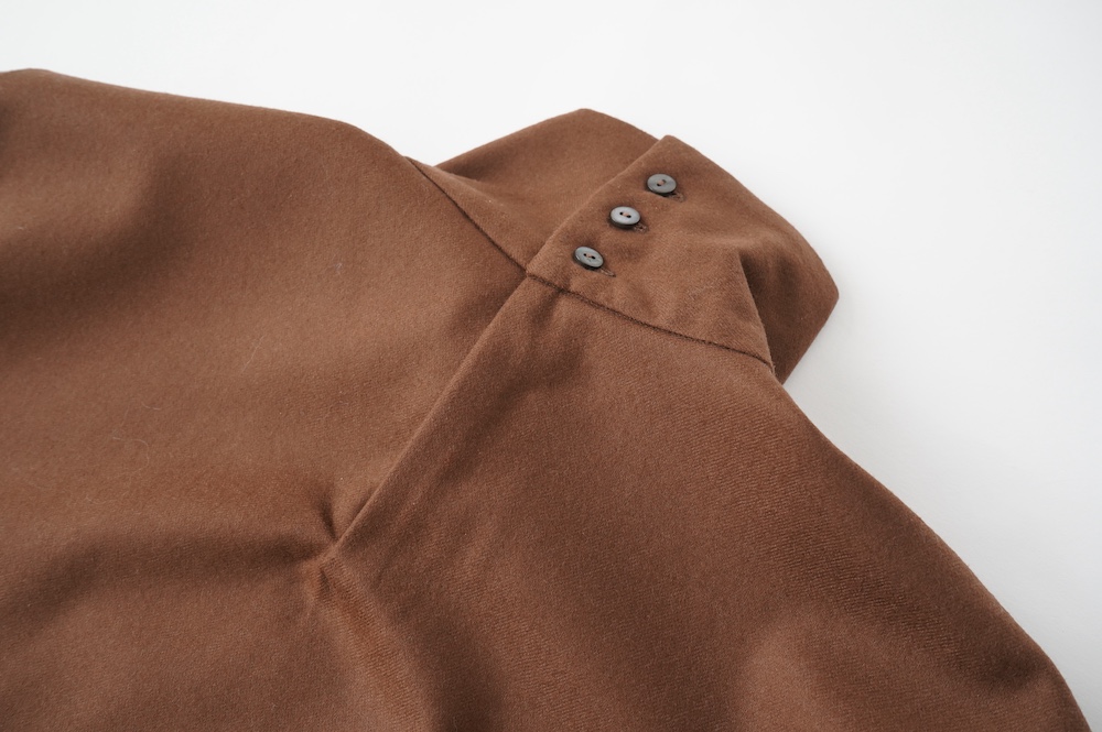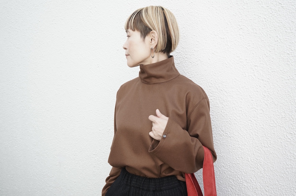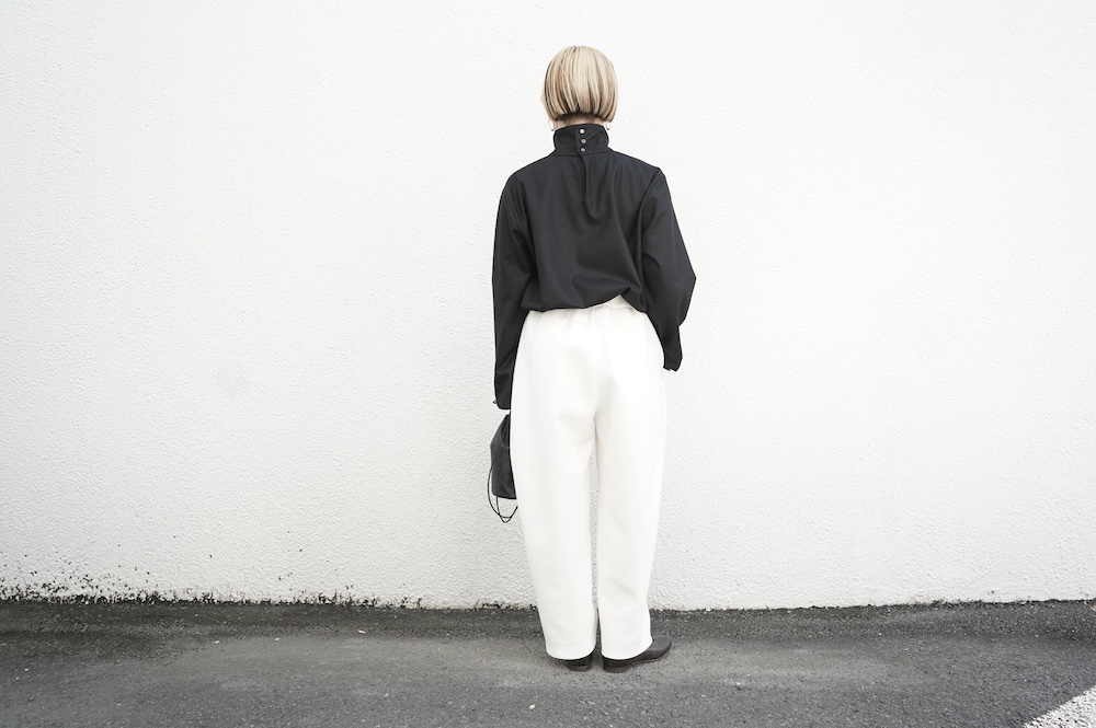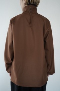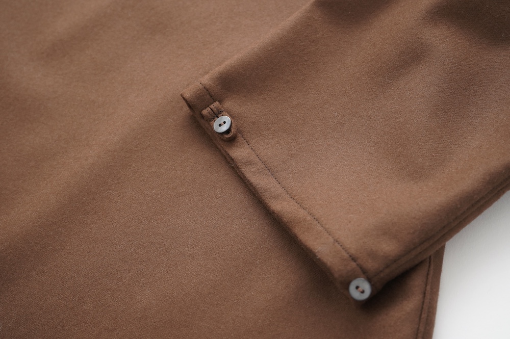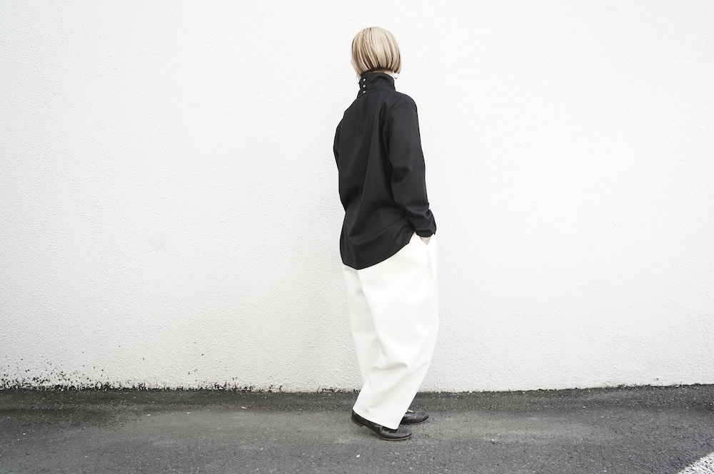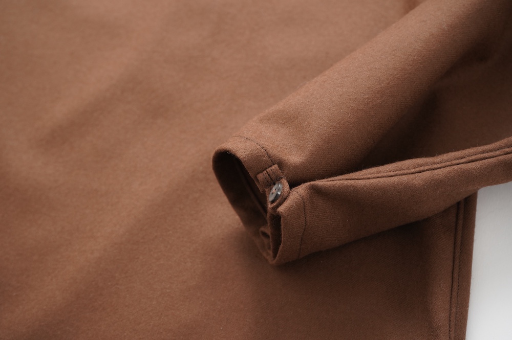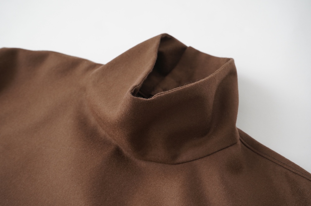 デザインはバンドカラーシャツのネックを高くした、ハイネック仕様のシャツ。そのまま襟を伸ばしたままでも、また1回折り返しても素敵です。後ろのネックのボタンを外すことで脱ぎ着をします。オーバーサイズで適度なゆとりがありながら、綺麗なシルエットで着ていただける、とても細部まで考えられた秀逸なパターンです。筒袖にはアジャストボタンとループが付いており、キュッと留めると袖のふんわりしたシルエットが生まれます。袖をロールアップさせて着るとシャツ自体のバランスが良く見えるので暖かくなったらオススメの着方です。ステッチ、パイピングも目立たないように5mm幅の極狭ステッチをデザイナー自ら縫製しています。出来るだけ細かいステッチで縫製することで、強度を強くしていたとされるヴィンテージのシャツ仕様を踏襲した縫製仕様です。ウール100%なので一枚でも暖かく着ていただけます。カーディガンやジャケット、またベストなどを合わせて暖かくスタイリングをお楽しみください。