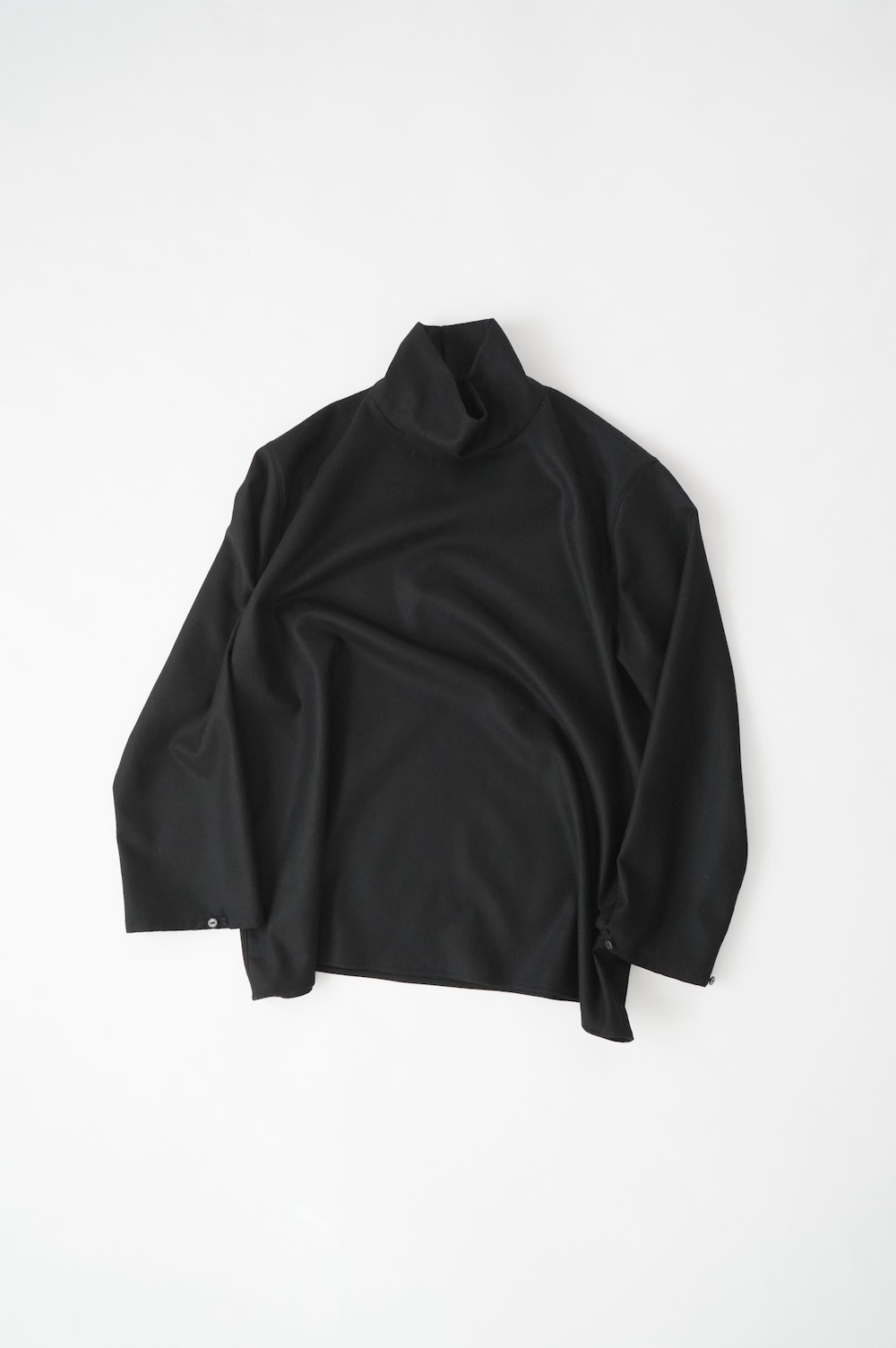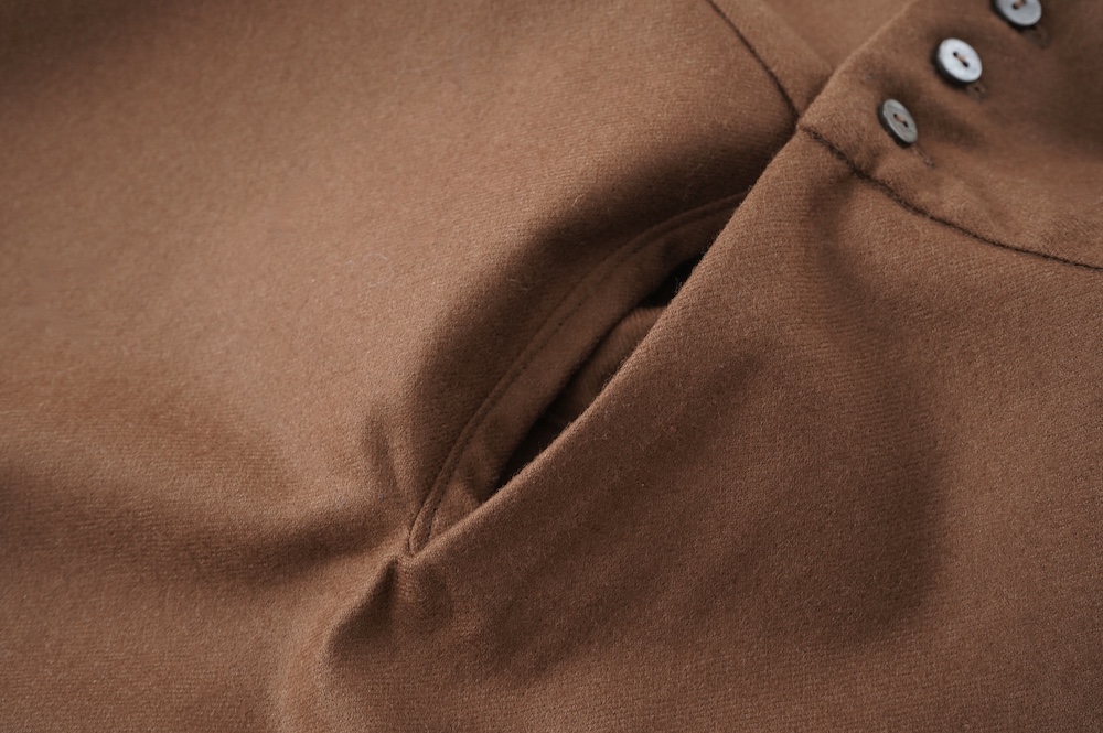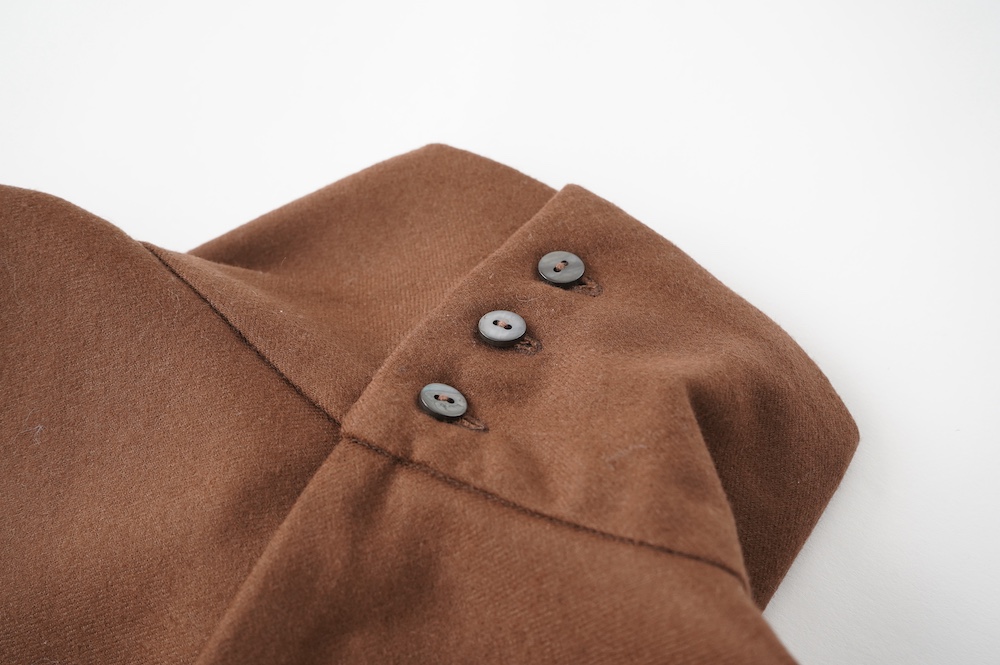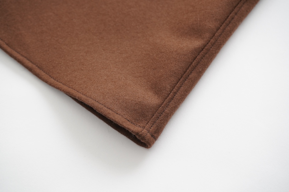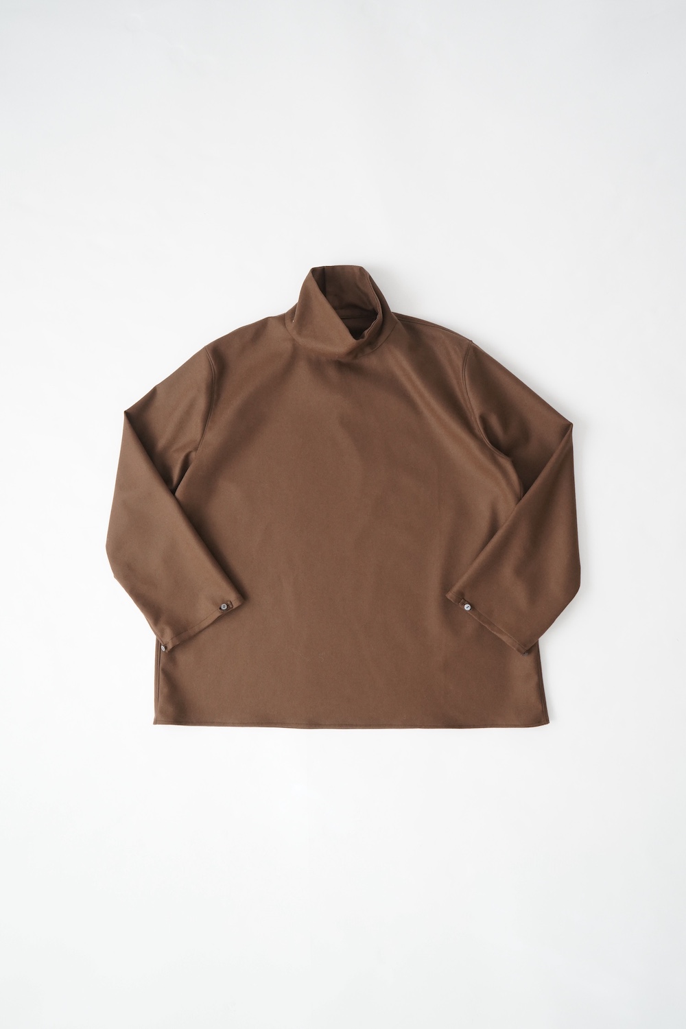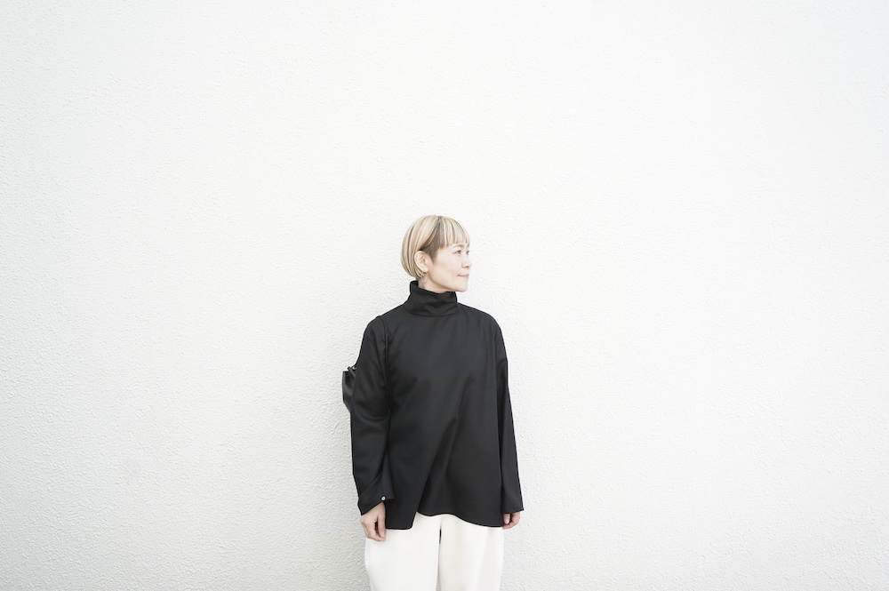 デザインはバンドカラーシャツのネックを高くした、ハイネック仕様のシャツ。そのまま襟を伸ばしたままでも、また1回折り返しても素敵です。後ろのネックのボタンを外すことで脱ぎ着をします。オーバーサイズで適度なゆとりがありながら、綺麗なシルエットで着ていただける、とても細部まで考えられた秀逸なパターンです。筒袖にはアジャストボタンとループが付いており、キュッと留めると袖のふんわりしたシルエットが生まれます。袖をロールアップさせて着るとシャツ自体のバランスが良く見えるので暖かくなったらオススメの着方です。ステッチ、パイピングも目立たないように5mm幅の極狭ステッチをデザイナー自ら縫製しています。出来るだけ細かいステッチで縫製することで、強度を強くしていたとされるヴィンテージのシャツ仕様を踏襲した縫製仕様です。ウール100%なので一枚でも暖かく着ていただけます。カーディガンやジャケット、またベストなどを合わせて暖かくスタイリングをお楽しみください。