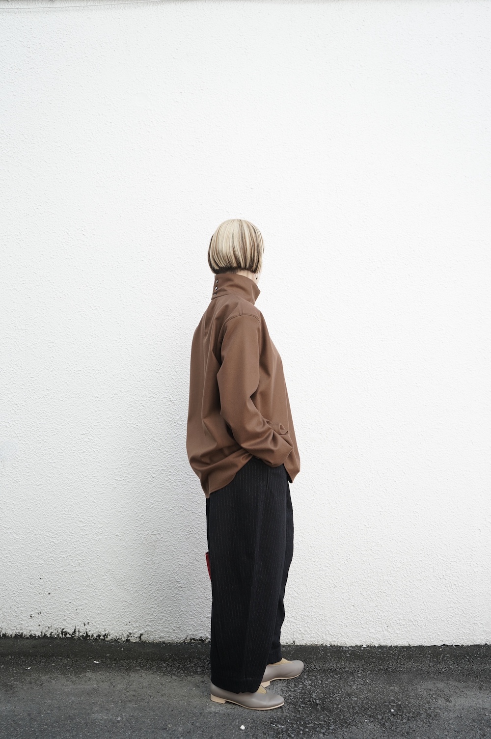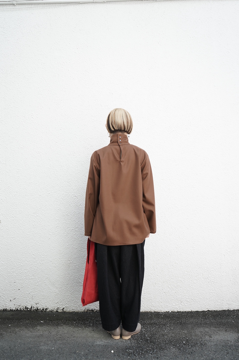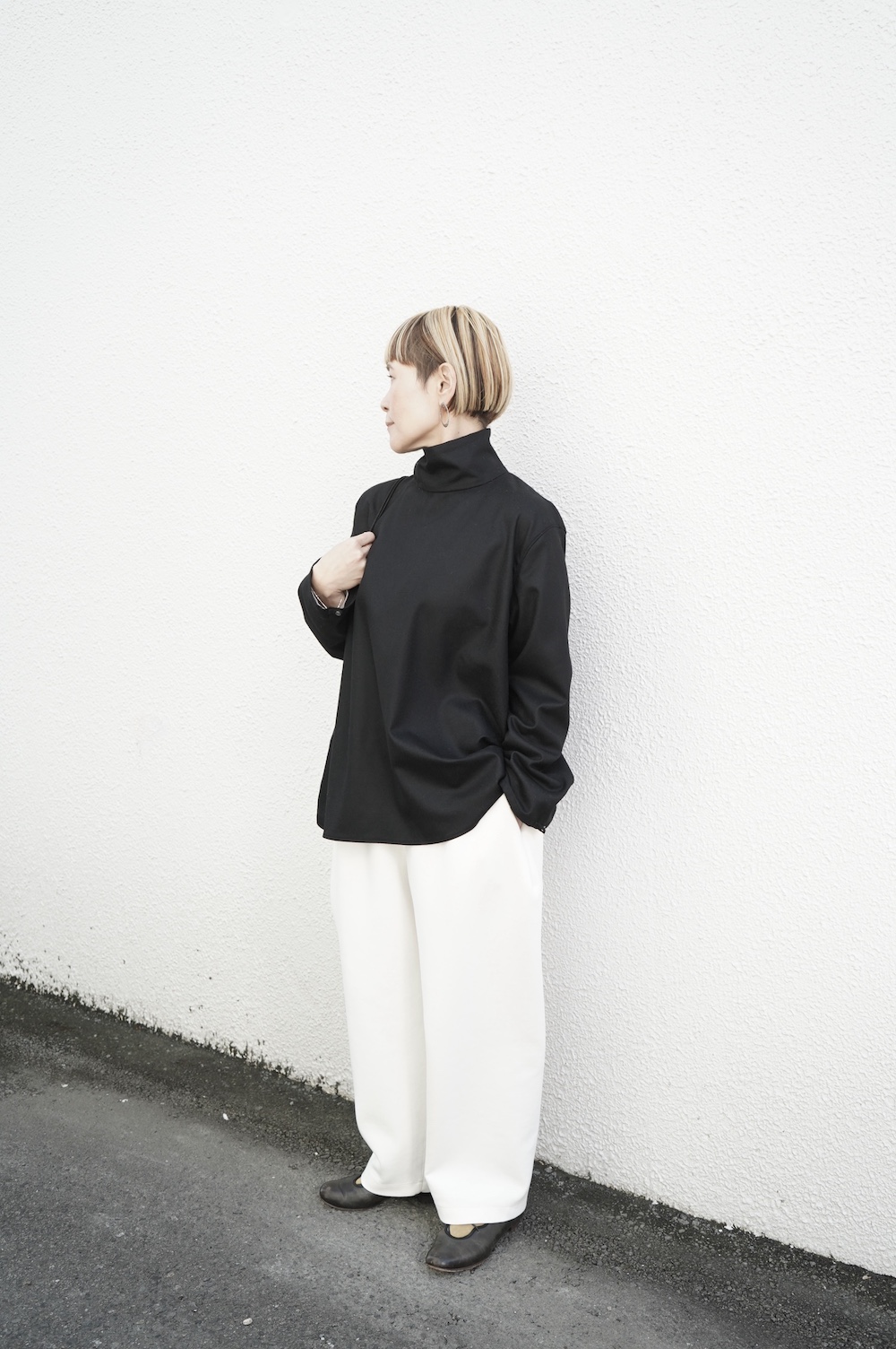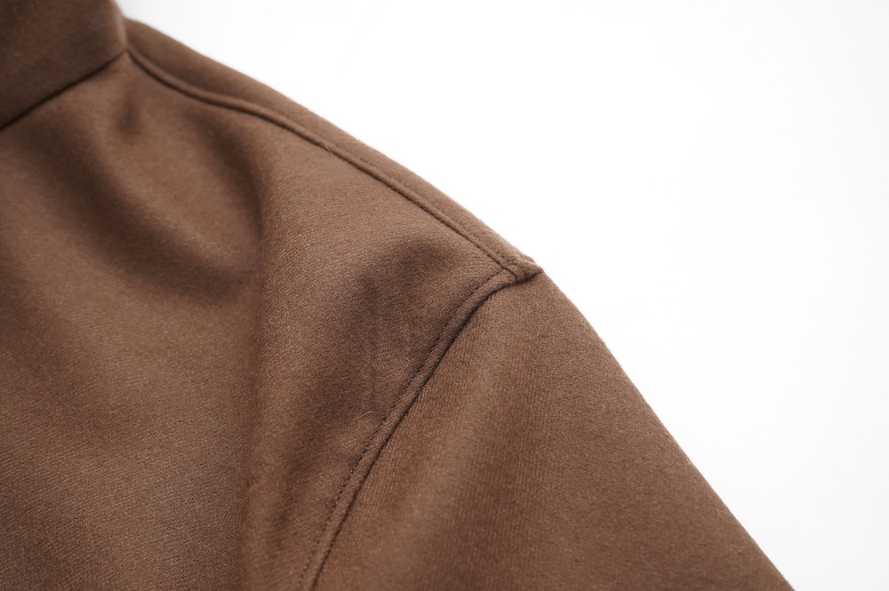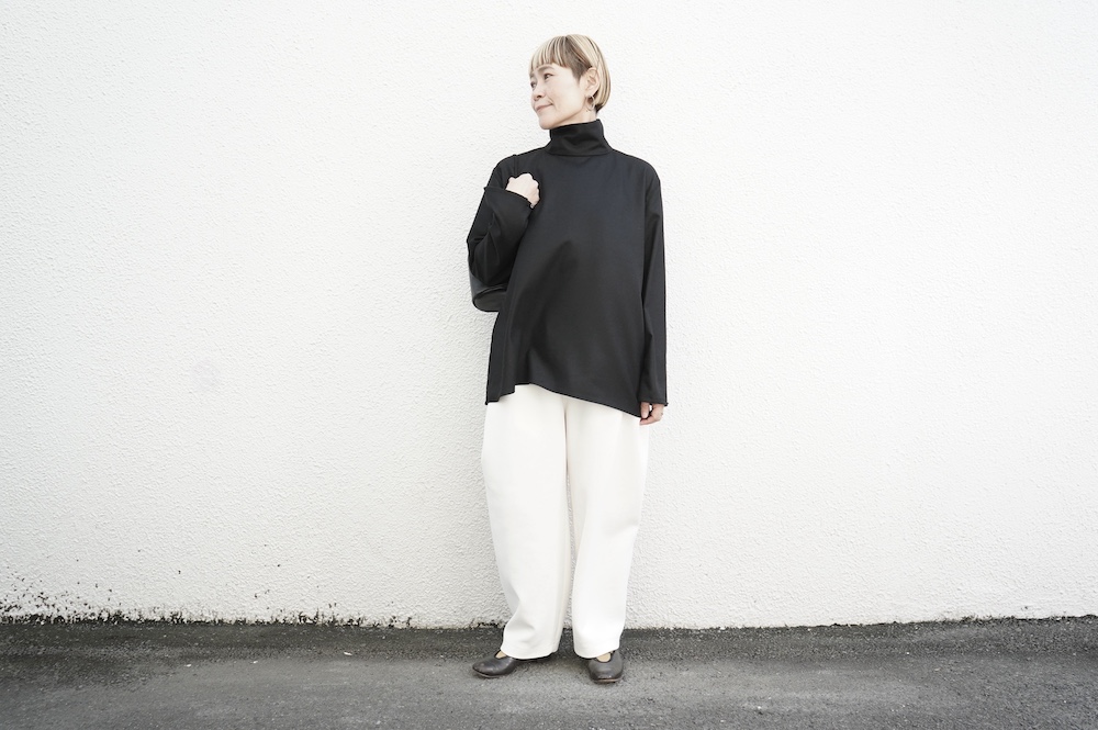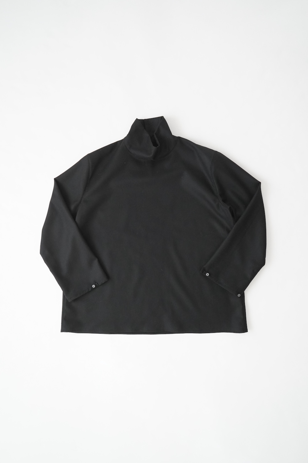 デザインはバンドカラーシャツのネックを高くした、ハイネック仕様のシャツ。そのまま襟を伸ばしたままでも、また1回折り返しても素敵です。後ろのネックのボタンを外すことで脱ぎ着をします。オーバーサイズで適度なゆとりがありながら、綺麗なシルエットで着ていただける、とても細部まで考えられた秀逸なパターンです。筒袖にはアジャストボタンとループが付いており、キュッと留めると袖のふんわりしたシルエットが生まれます。袖をロールアップさせて着るとシャツ自体のバランスが良く見えるので暖かくなったらオススメの着方です。ステッチ、パイピングも目立たないように5mm幅の極狭ステッチをデザイナー自ら縫製しています。出来るだけ細かいステッチで縫製することで、強度を強くしていたとされるヴィンテージのシャツ仕様を踏襲した縫製仕様です。ウール100%なので一枚でも暖かく着ていただけます。カーディガンやジャケット、またベストなどを合わせて暖かくスタイリングをお楽しみください。