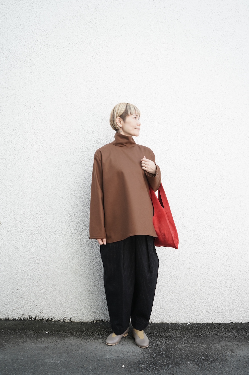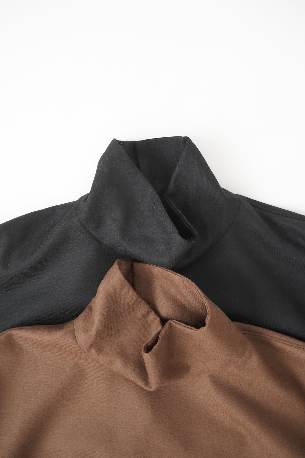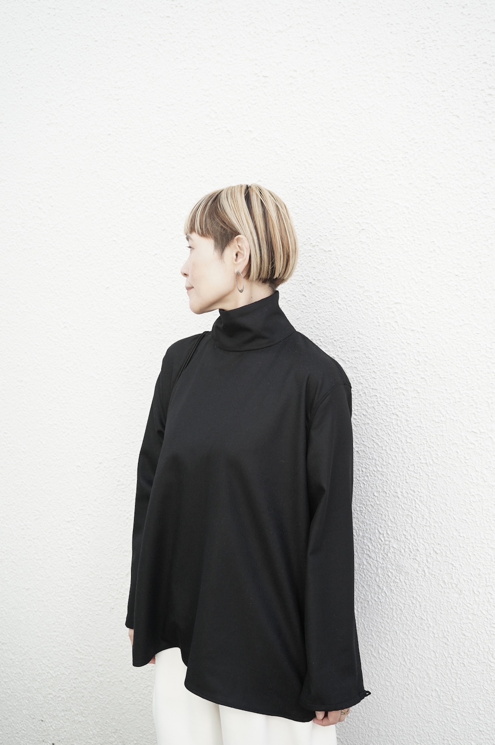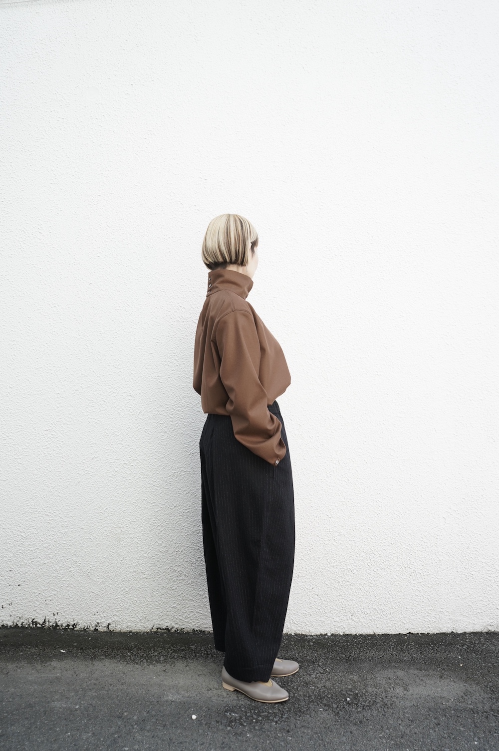 デザインはバンドカラーシャツのネックを高くした、ハイネック仕様のシャツ。そのまま襟を伸ばしたままでも、また1回折り返しても素敵です。後ろのネックのボタンを外すことで脱ぎ着をします。オーバーサイズで適度なゆとりがありながら、綺麗なシルエットで着ていただける、とても細部まで考えられた秀逸なパターンです。筒袖にはアジャストボタンとループが付いており、キュッと留めると袖のふんわりしたシルエットが生まれます。袖をロールアップさせて着るとシャツ自体のバランスが良く見えるので暖かくなったらオススメの着方です。ステッチ、パイピングも目立たないように5mm幅の極狭ステッチをデザイナー自ら縫製しています。出来るだけ細かいステッチで縫製することで、強度を強くしていたとされるヴィンテージのシャツ仕様を踏襲した縫製仕様です。ウール100%なので一枚でも暖かく着ていただけます。カーディガンやジャケット、またベストなどを合わせて暖かくスタイリングをお楽しみください。