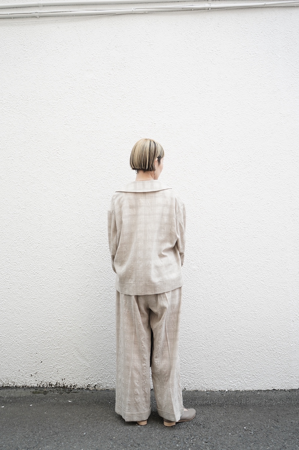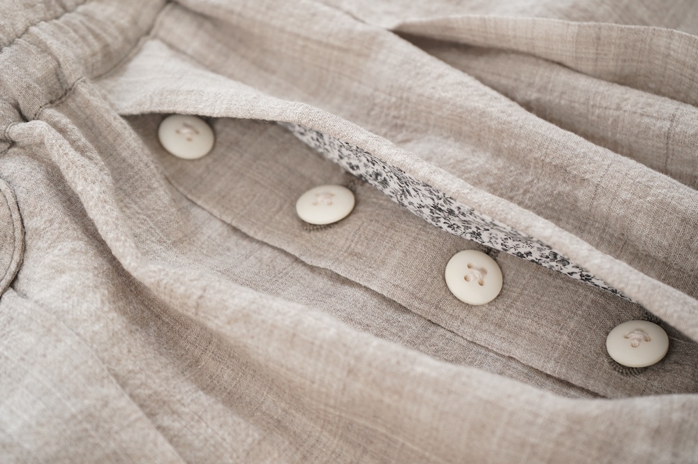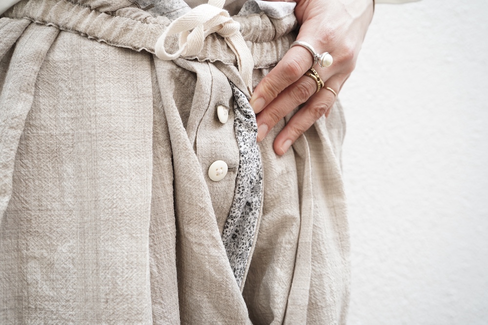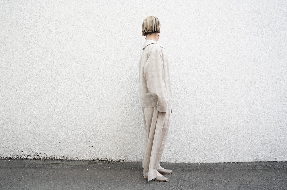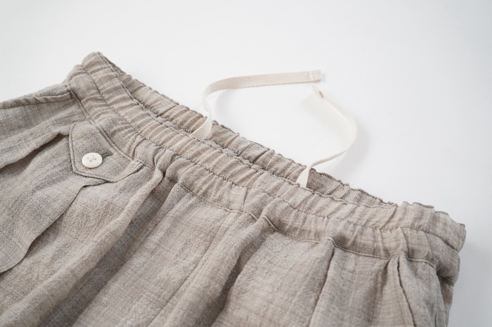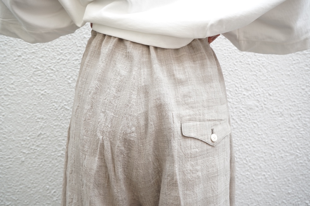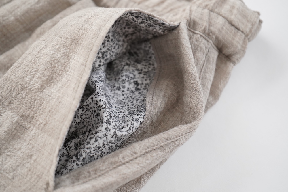 デザインは極太シルエットのワイドパンツ。ヴィンテージのクリケットの競技用トラウザーをベースにデザインに落とし込んでいます。クラシカルな2タックのダブル仕立てでありながら、シルエットはゆったりとしておりリラックスして履いていただけます。ウエストはゴムとヒモです。裏地はついていませんが、ポケットの袋布やパイピングに小花柄の生地を使用しているのが可愛らしい。同素材のジャケットと合わせてセットアップも素敵です。夏もサンダルなどと合わせて軽やかに履いていただきたいパンツです。