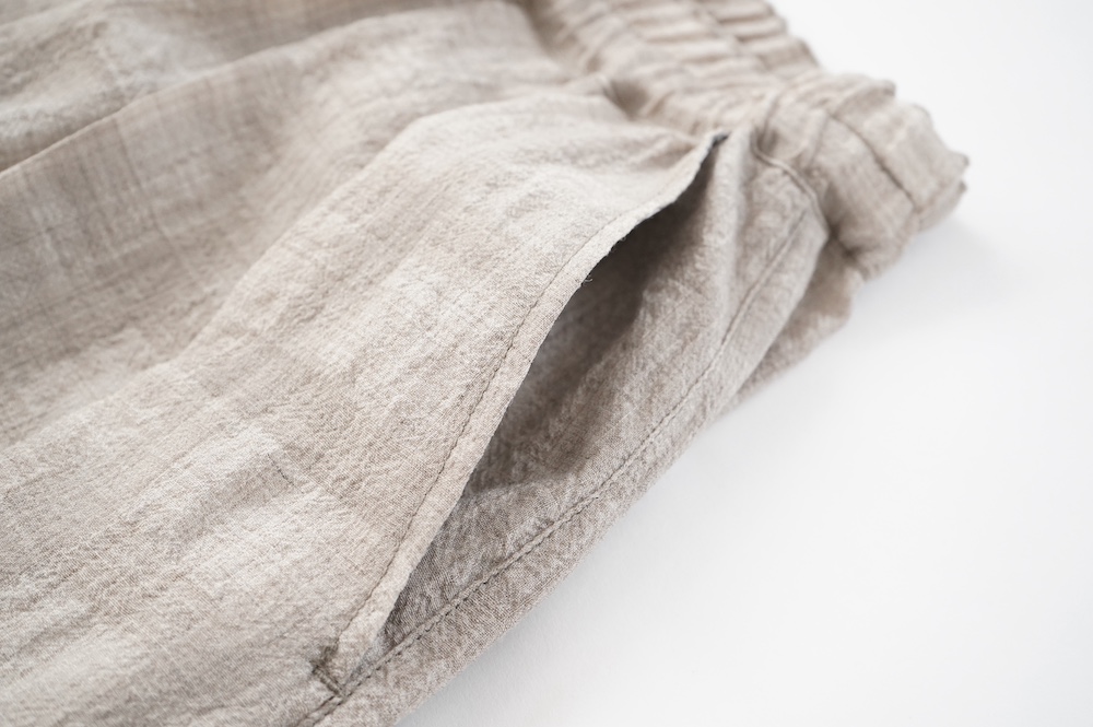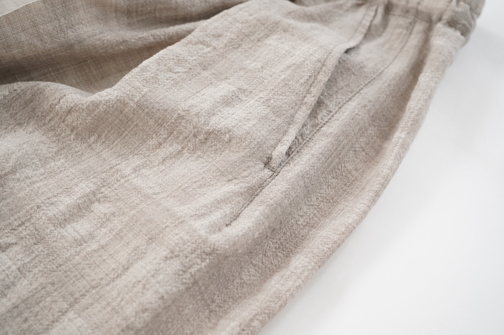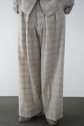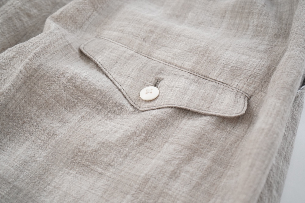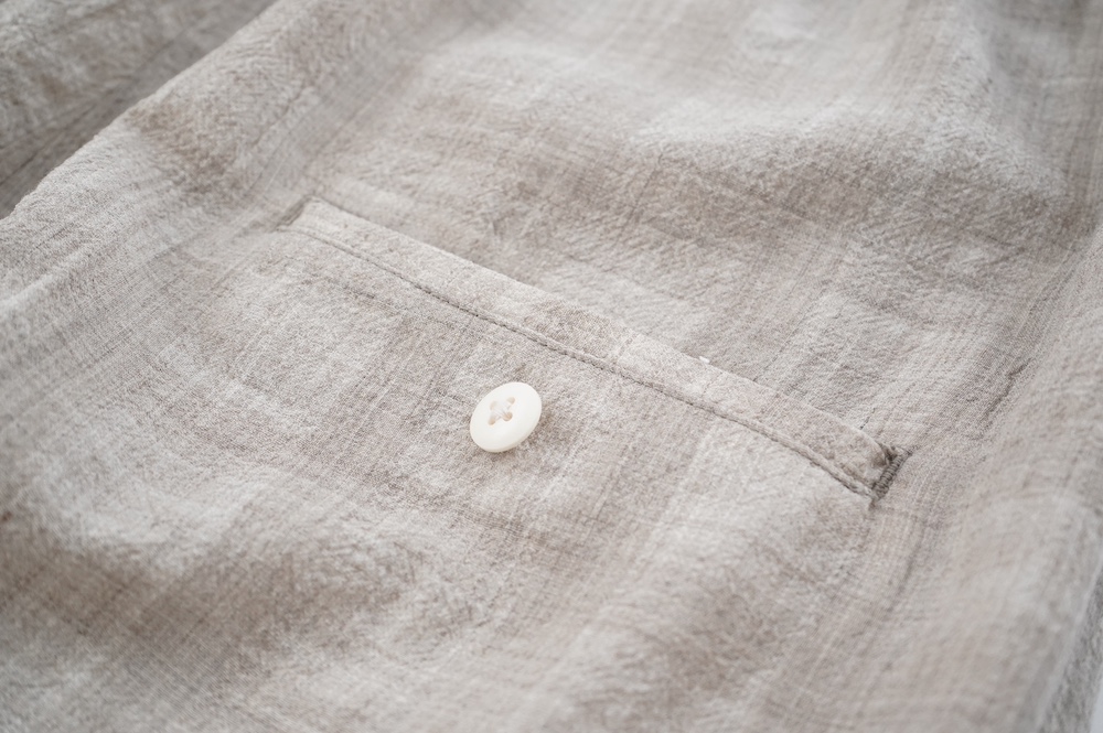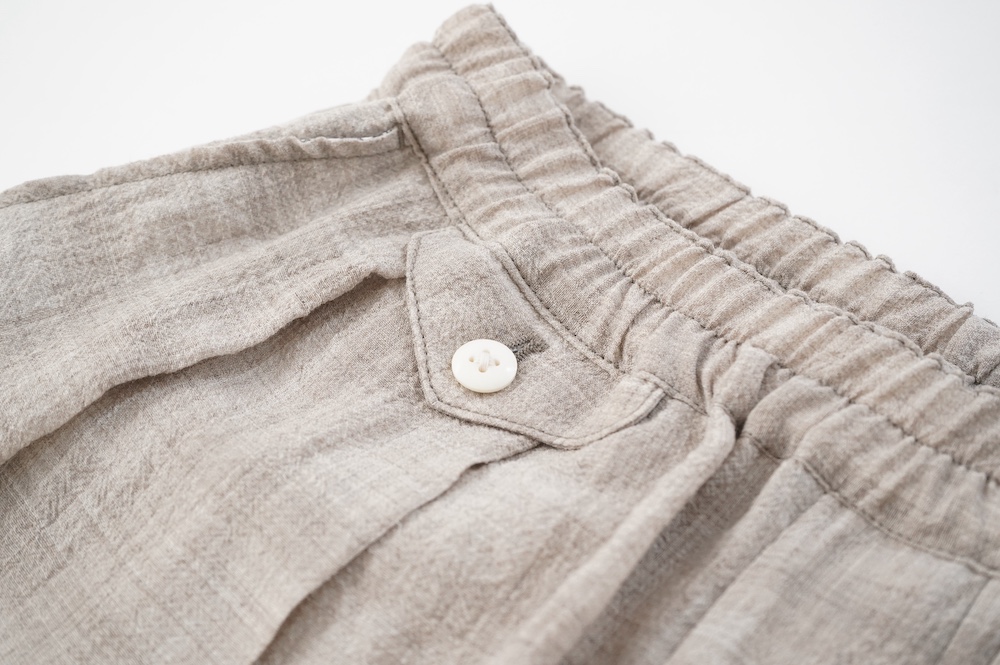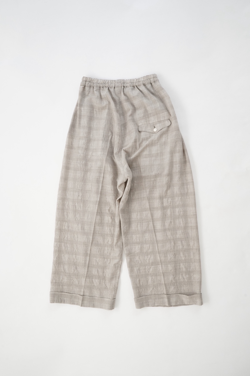キタンのパンツ。毛織物の産地である尾州で、無染色のメリノウール梳毛糸を使用したトロピカルウール生地をオリジナルで製作。同色の単糸と双糸を使用して、糸の縮率差だけを利用して織り上げたシアサッカー生地になります。同色のチェックがさりげなく、ほんのり透け感と凹凸があり清涼感漂う素材です。