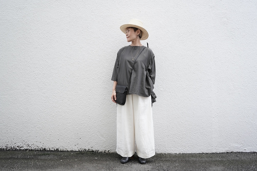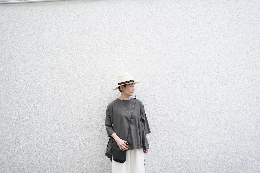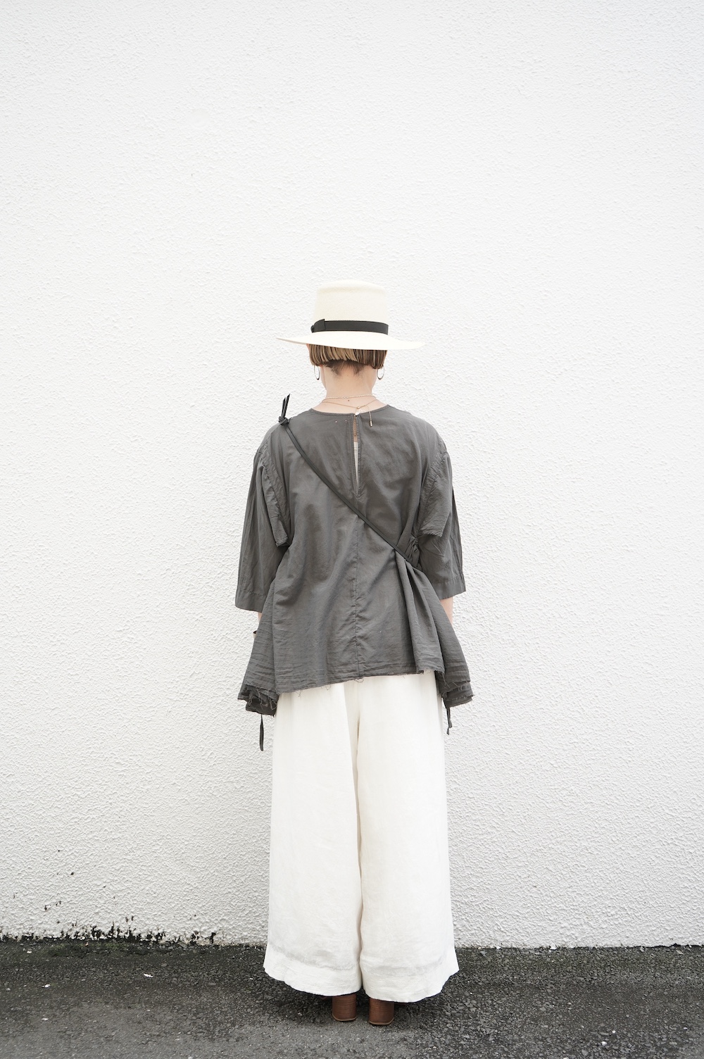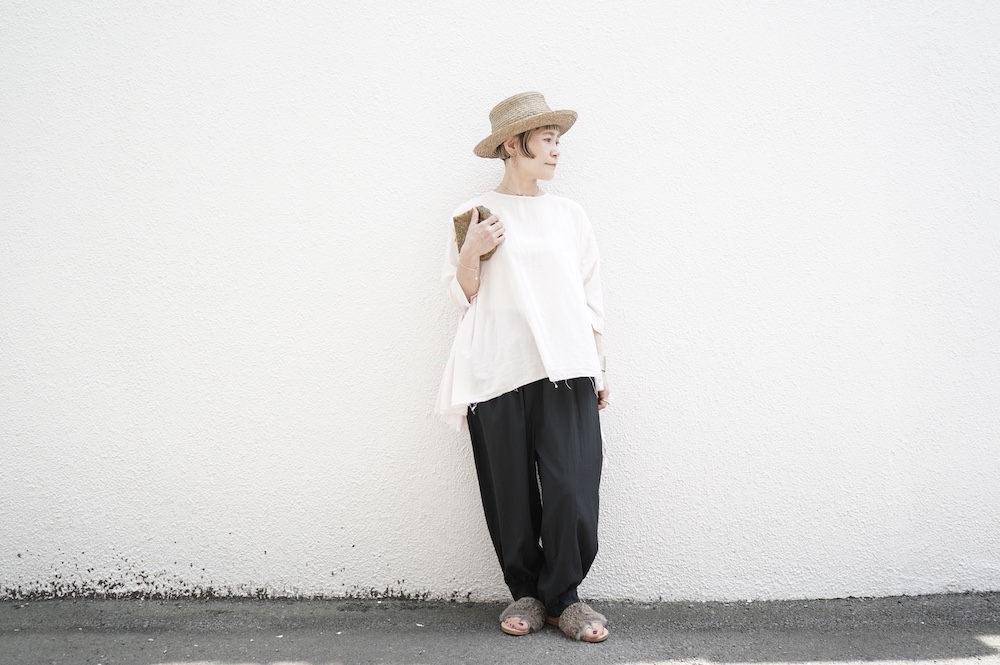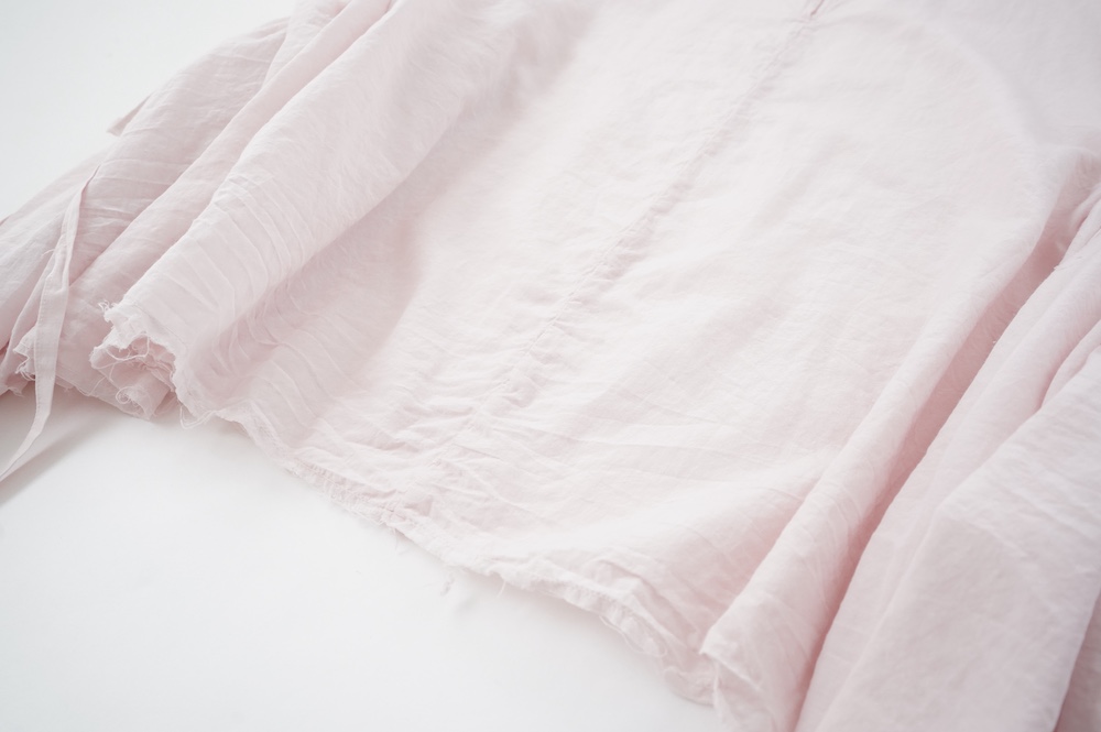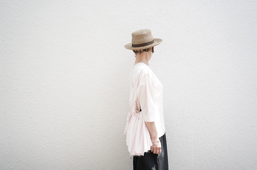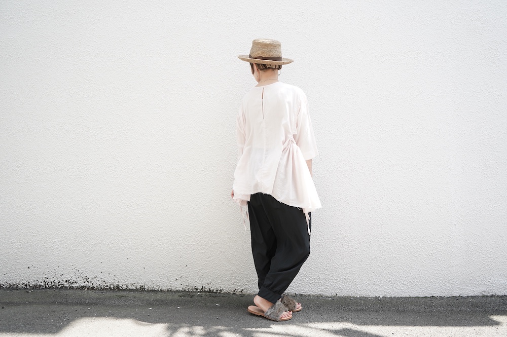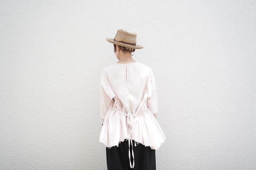 デザインは、ダネティ・ジャト族の少女が着用していたドレスに着想し作られたブラウス。ダネティ・ジャト族の人々はラクダや馬に乗るため裾幅の広い衣服を着ているそうです。サイドの紐でギャザーの分量を調節することができるギャザーブラウスは、ぎゅっと絞ると細かいギャザーが寄り、流れるようなシルエットになります。絞り具合でシルエットを変化させることができます。程よい開きのシンプルなネックと背中は一つボタン。ギャザーの構造上、脇下からウエスト・腰あたりにかけて開いているのでインナーとのレイヤーもお楽しみいただけます。