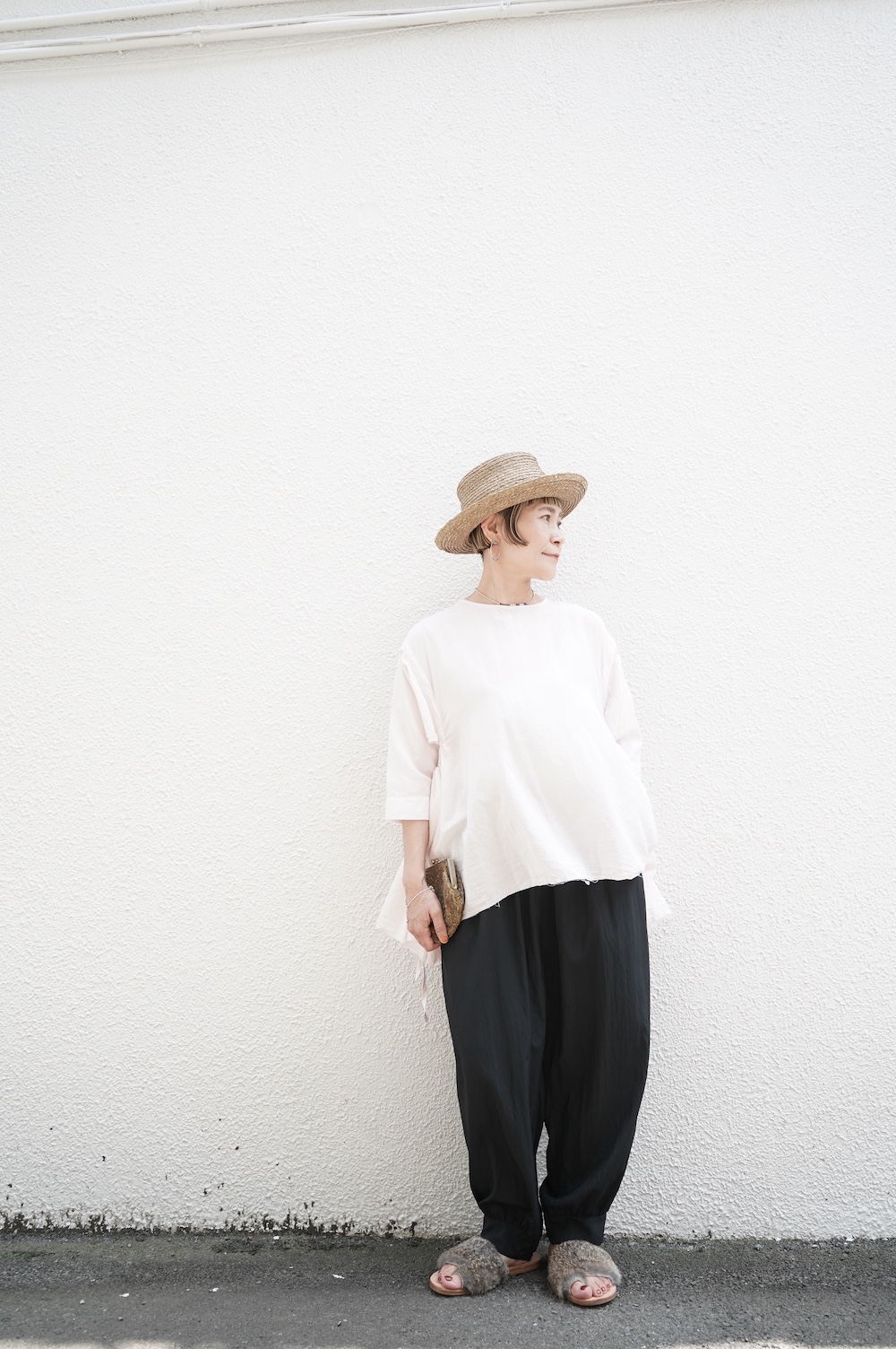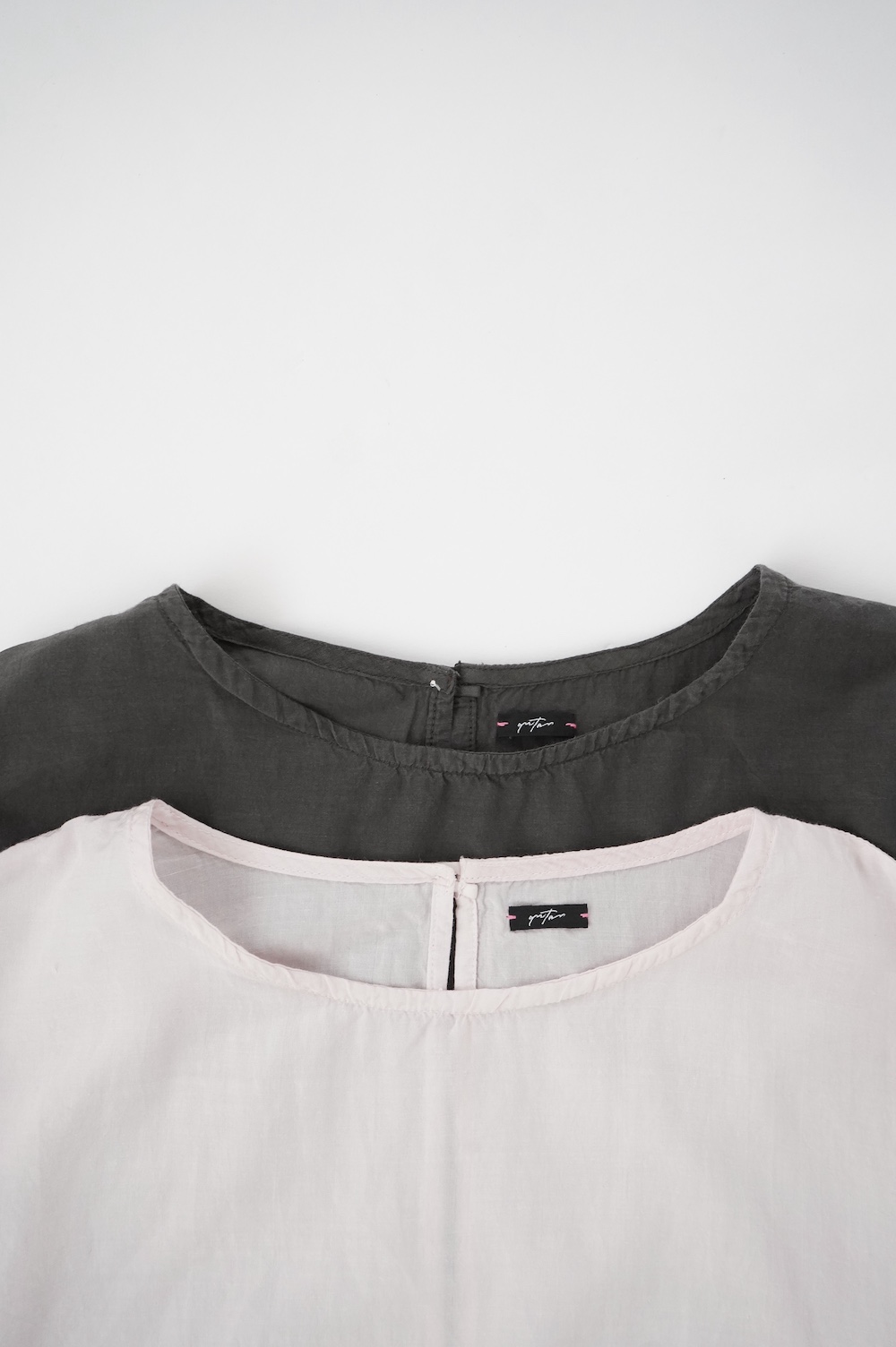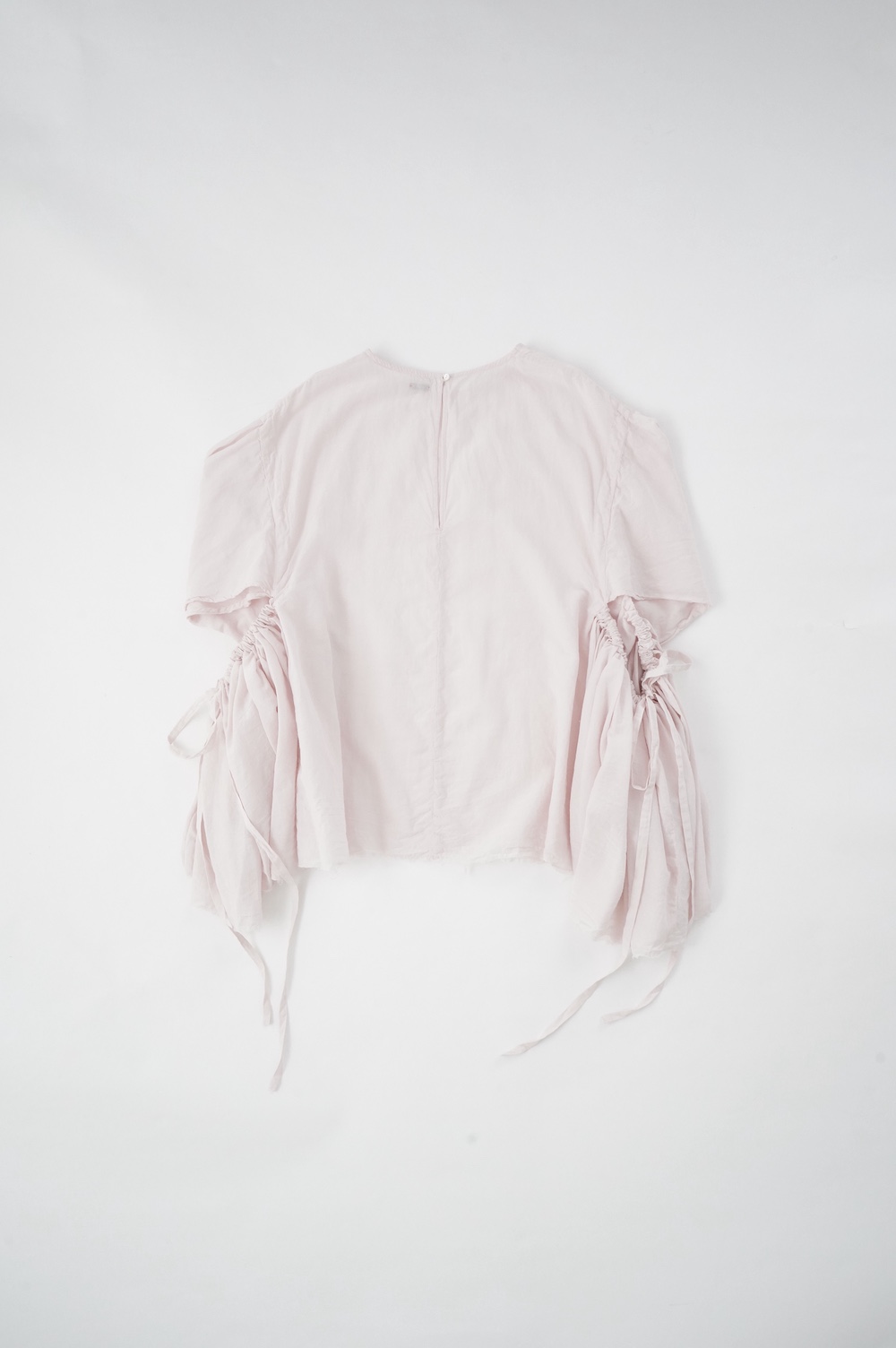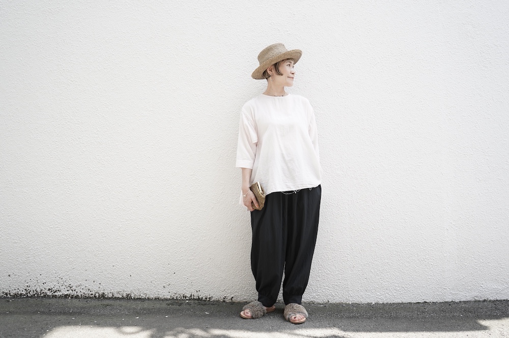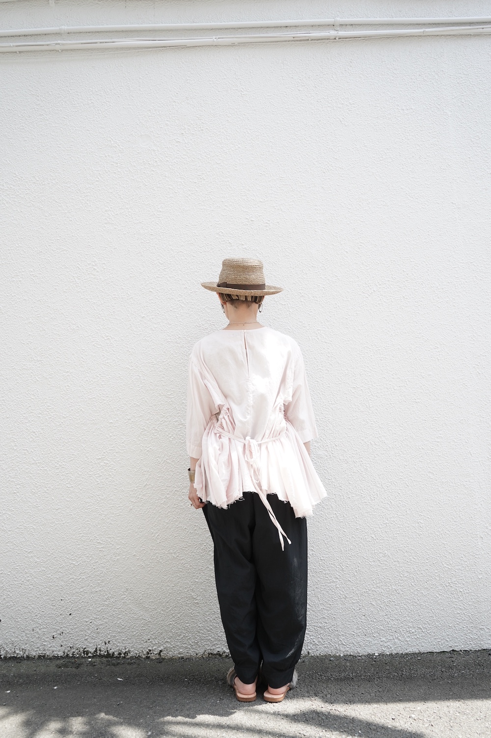 デザインは、ダネティ・ジャト族の少女が着用していたドレスに着想し作られたブラウス。ダネティ・ジャト族の人々はラクダや馬に乗るため裾幅の広い衣服を着ているそうです。サイドの紐でギャザーの分量を調節することができるギャザーブラウスは、ぎゅっと絞ると細かいギャザーが寄り、流れるようなシルエットになります。絞り具合でシルエットを変化させることができます。程よい開きのシンプルなネックと背中は一つボタン。ギャザーの構造上、脇下からウエスト・腰あたりにかけて開いているのでインナーとのレイヤーもお楽しみいただけます。