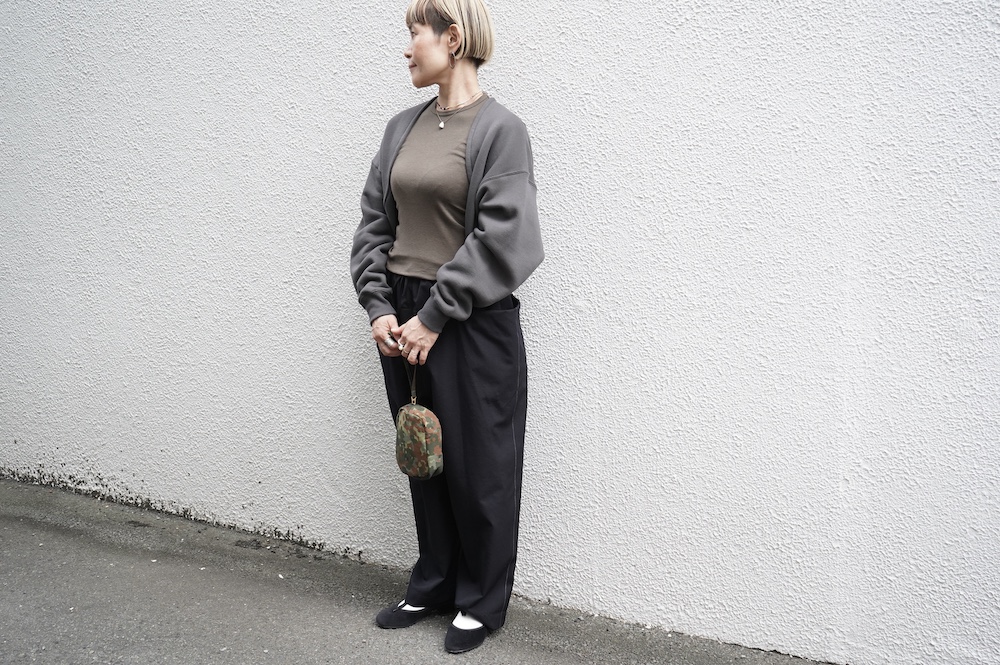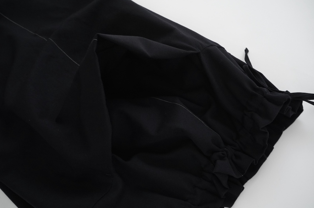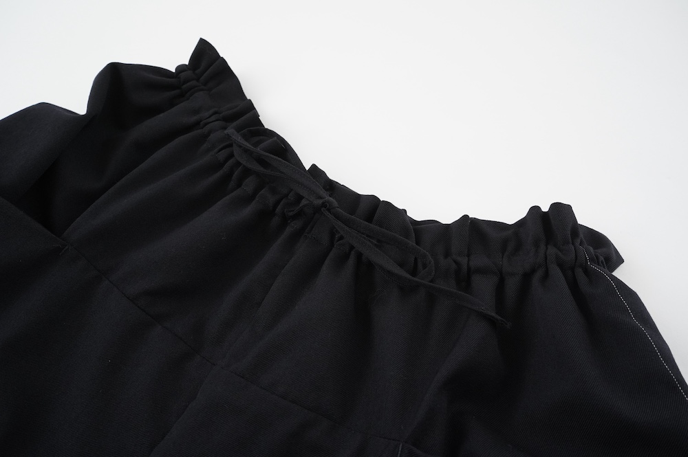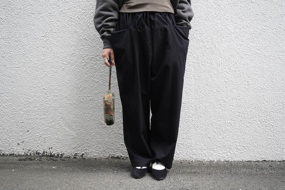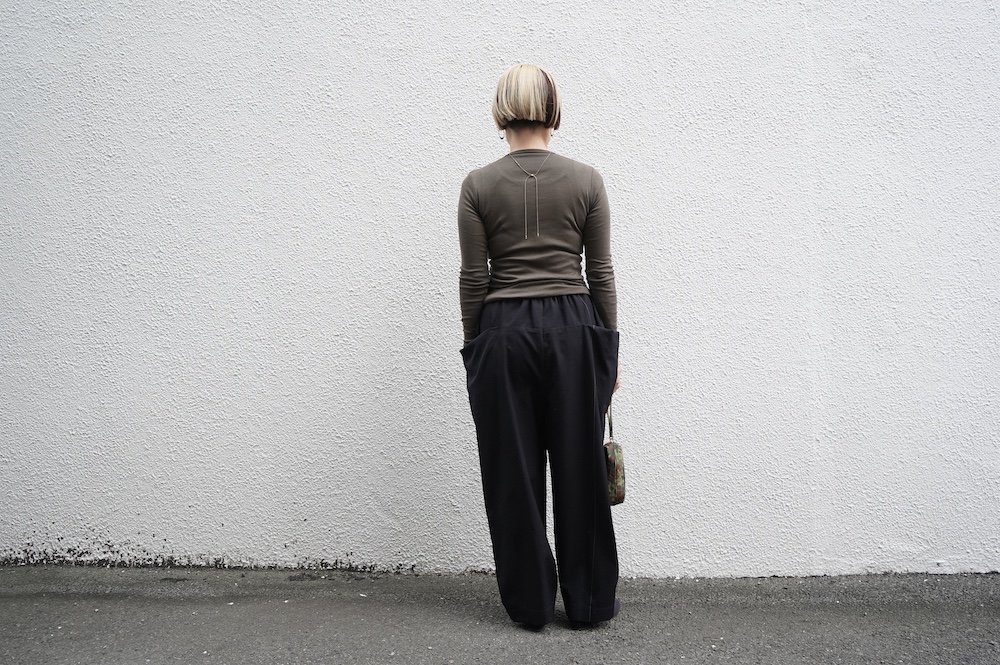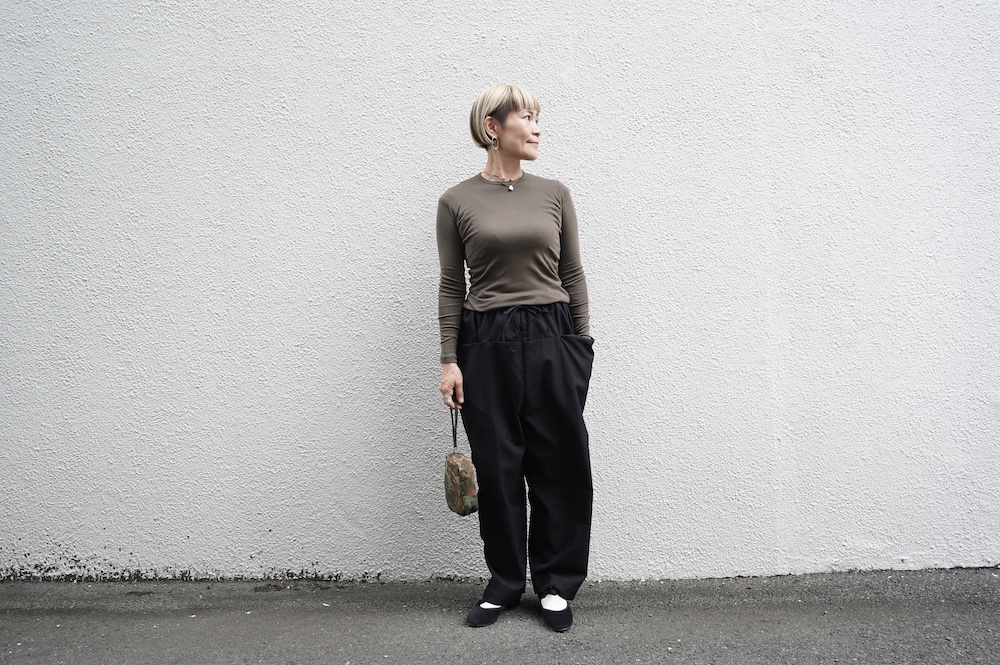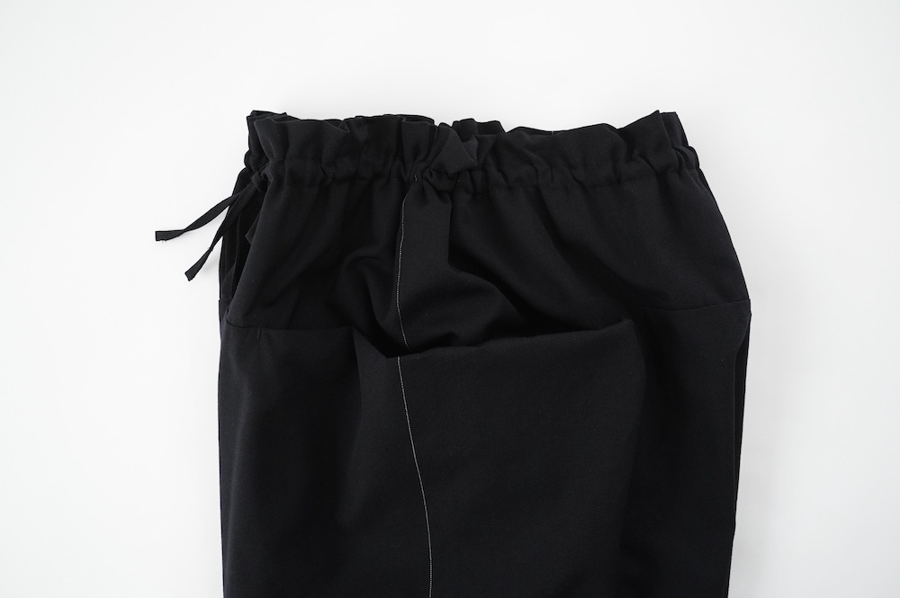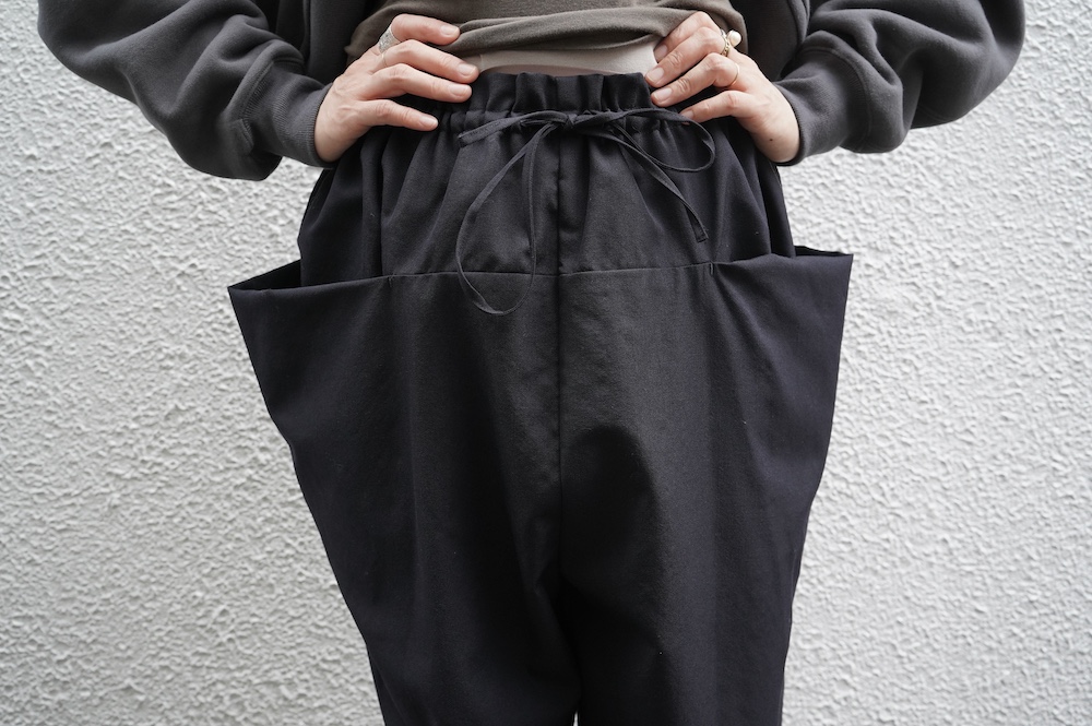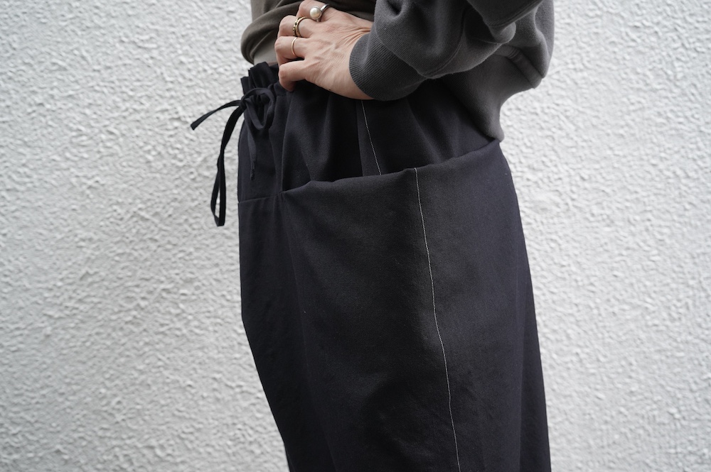 デザインはガーデナー(庭仕事用)の作業服から着想し、大きなポケットが特徴的なイージーパンツ。ポケットは身頃と一体型のカンガルー式ポケットになっており、通常のガーデナーポケットのようなパッチポケットではないため、ポケットのデザインだけでも洗練された印象です。ウエストはゴムと紐。わたり幅はやや広めですが、テーパードが効いているのでスラックスのようなすっきりとしたシルエットです。裏地はついていません。見えない部分ですが内側の縫い合わせはパイピング始末をしており、小花柄を使用しているのがさりげなく可愛らしい。マニッシュな雰囲気が格好良いイージーパンツです。