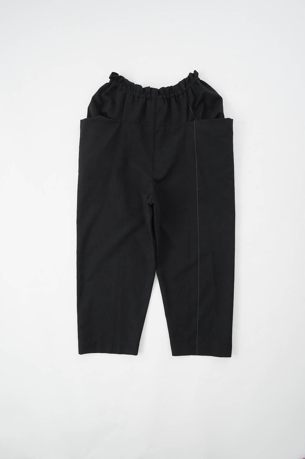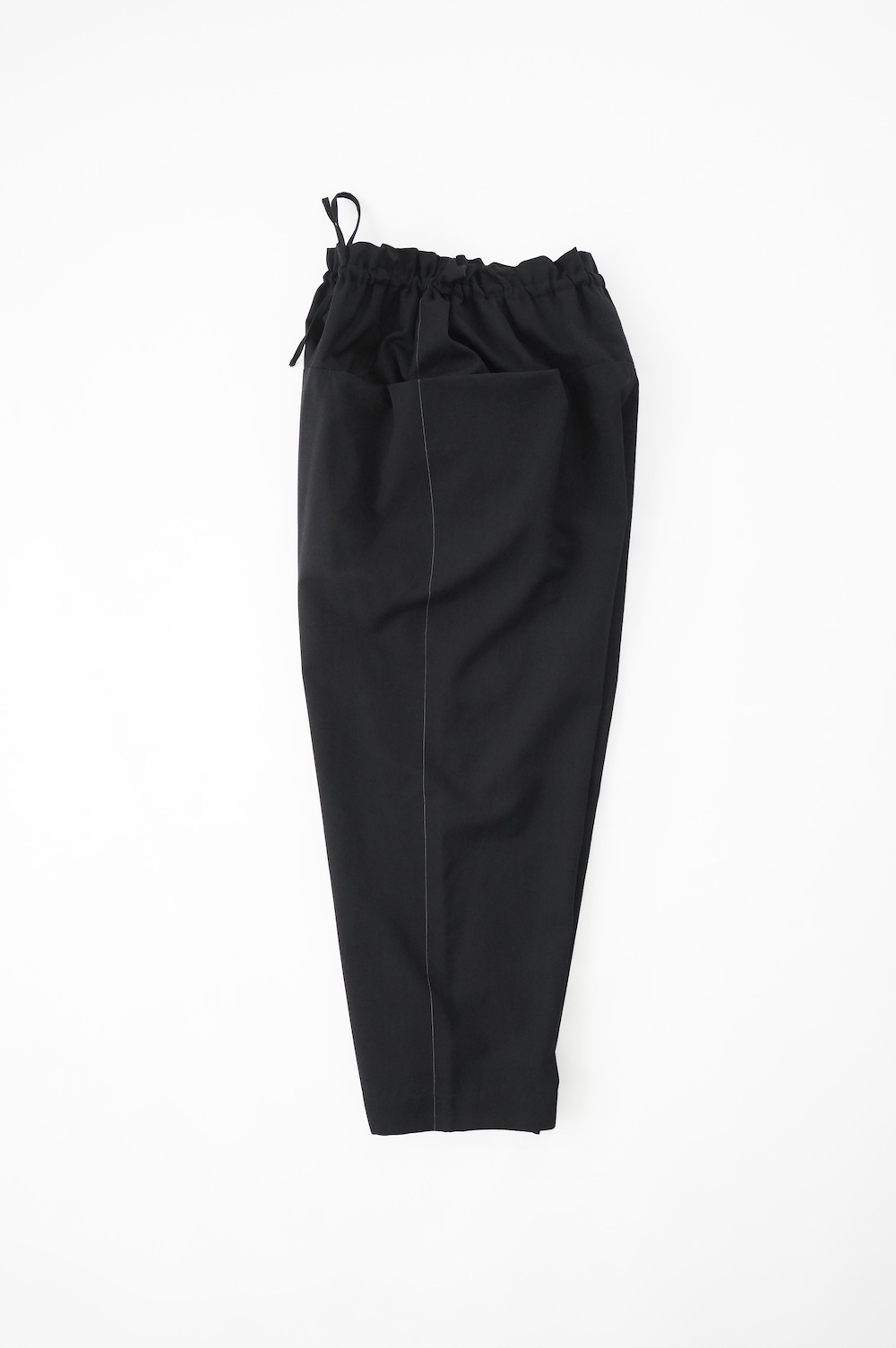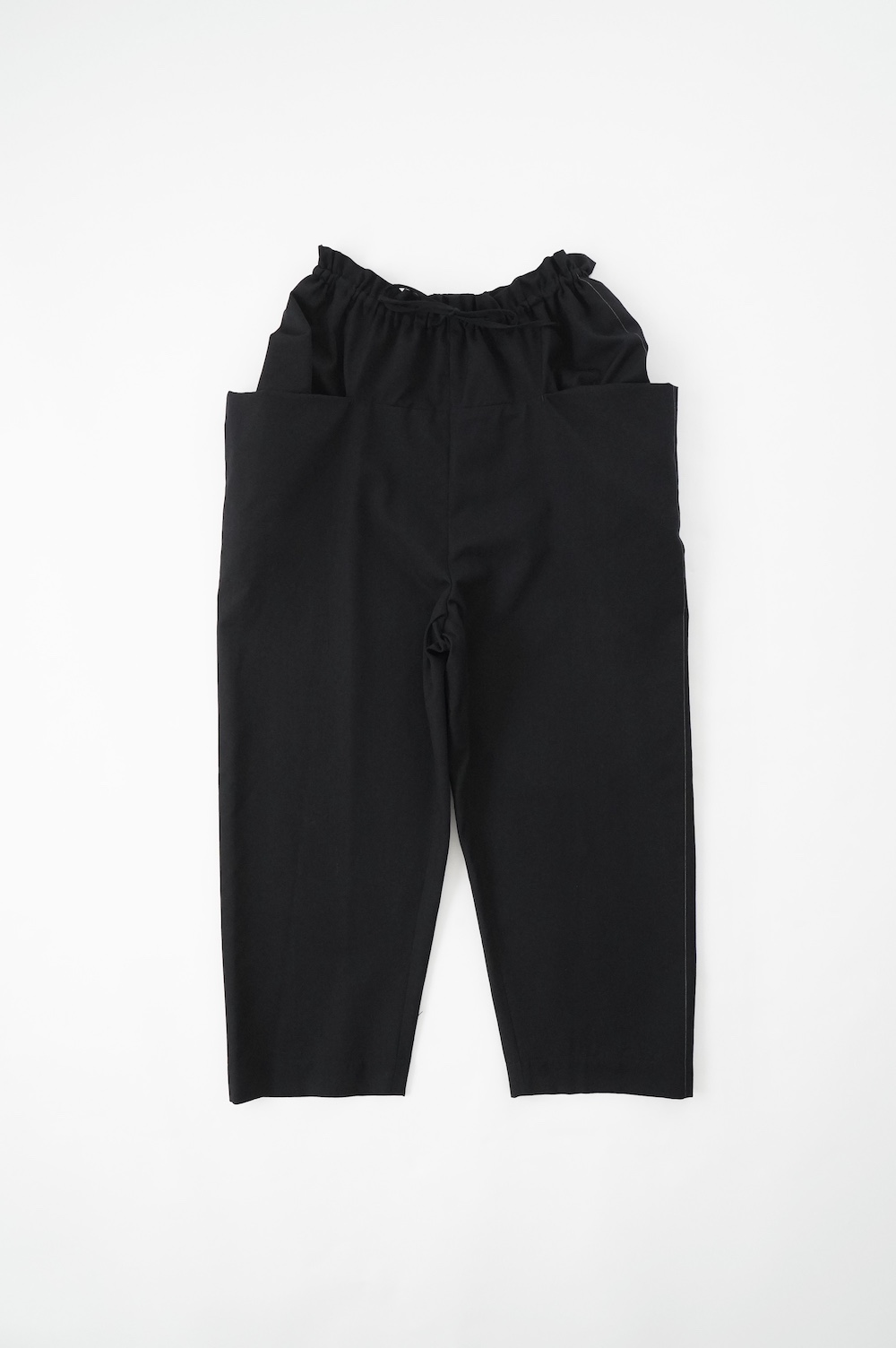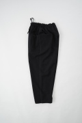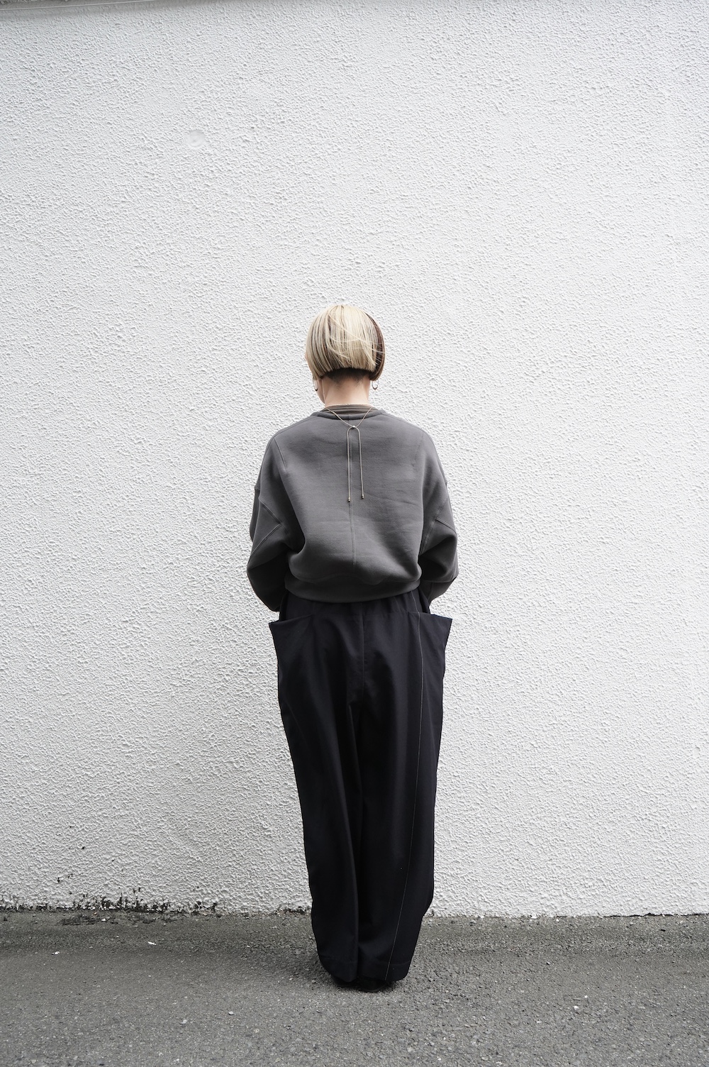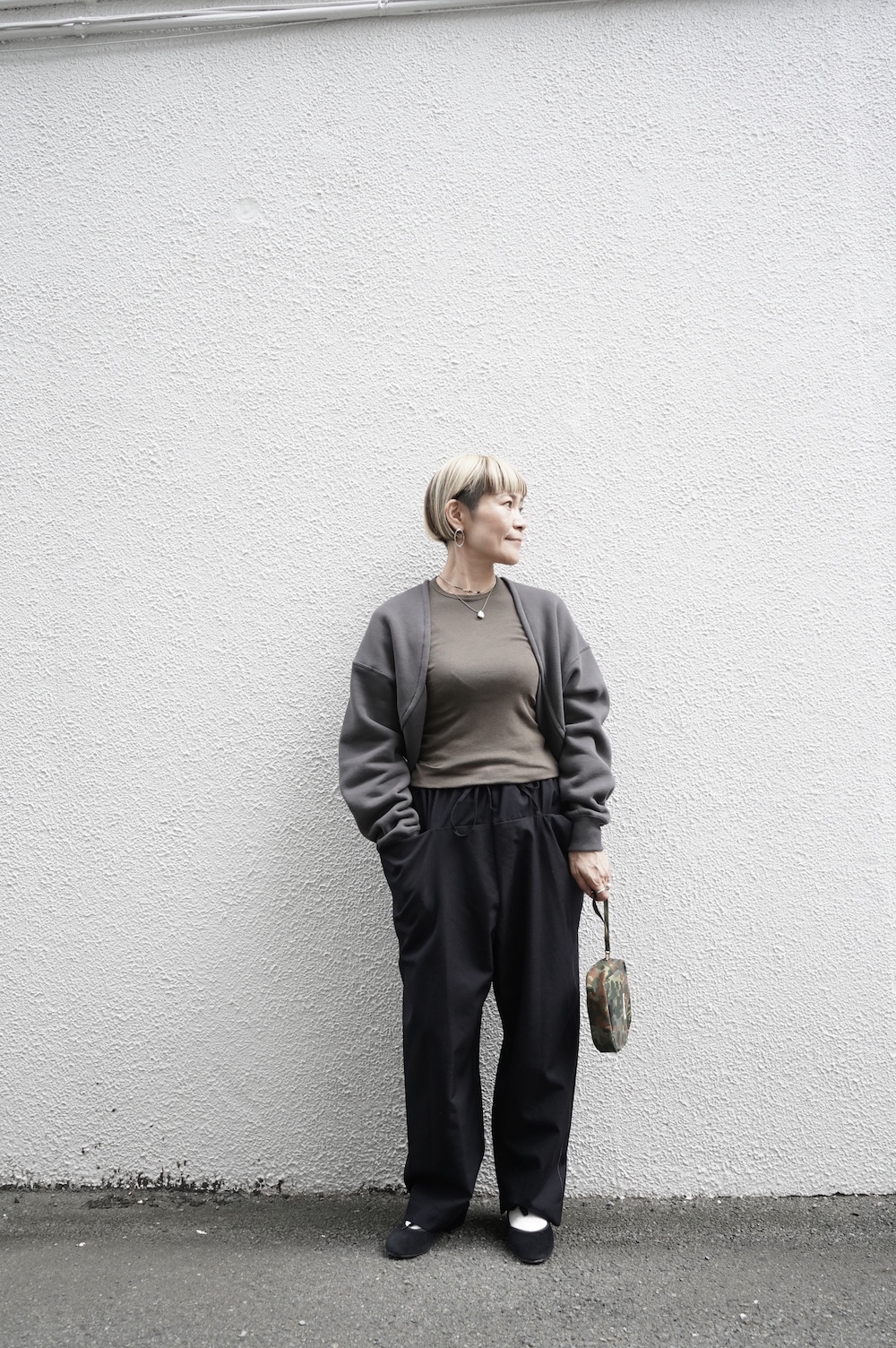 デザインはガーデナー(庭仕事用)の作業服から着想し、大きなポケットが特徴的なイージーパンツ。ポケットは身頃と一体型のカンガルー式ポケットになっており、通常のガーデナーポケットのようなパッチポケットではないため、ポケットのデザインだけでも洗練された印象です。ウエストはゴムと紐。わたり幅はやや広めですが、テーパードが効いているのでスラックスのようなすっきりとしたシルエットです。裏地はついていません。見えない部分ですが内側の縫い合わせはパイピング始末をしており、小花柄を使用しているのがさりげなく可愛らしい。マニッシュな雰囲気が格好良いイージーパンツです。