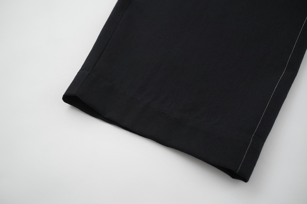 キタンのパンツ。毛織物の産地である尾州で、メリノウールの梳毛糸を使用して織り上げた濃紺のサージ生地を使用。白いラインがとても映える、黒に近い綺麗な濃紺色です。アクセントになっている白いラインは、ヴィンテージのキャンバス生地の耳(端)のラインをイメージしたもの。さりげないラインですが、存在感があります。スーツにもよく使用されるウールサージ生地は暖かさとしなやかさがあり、上品な素材です。