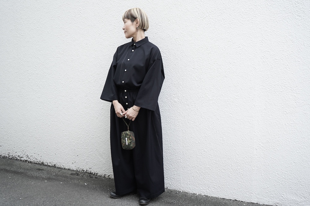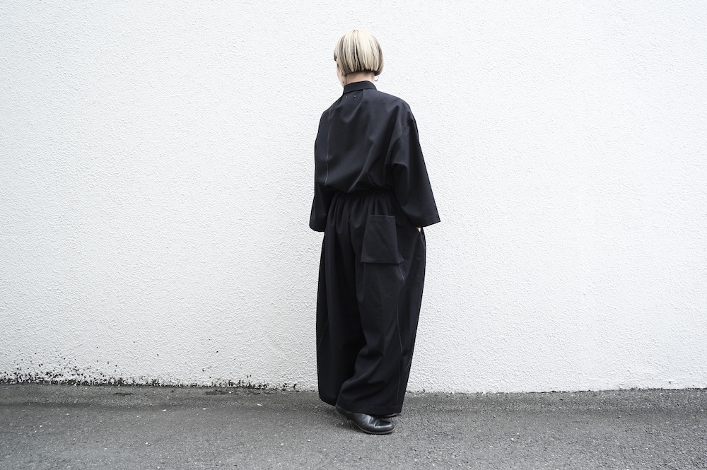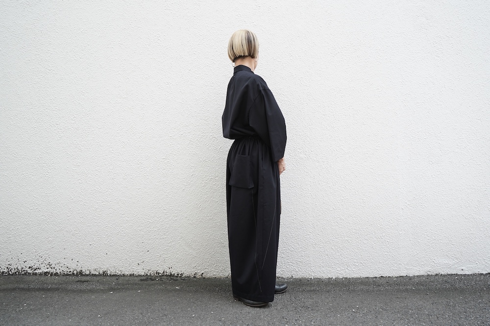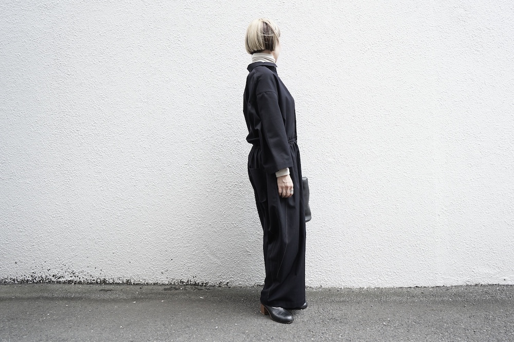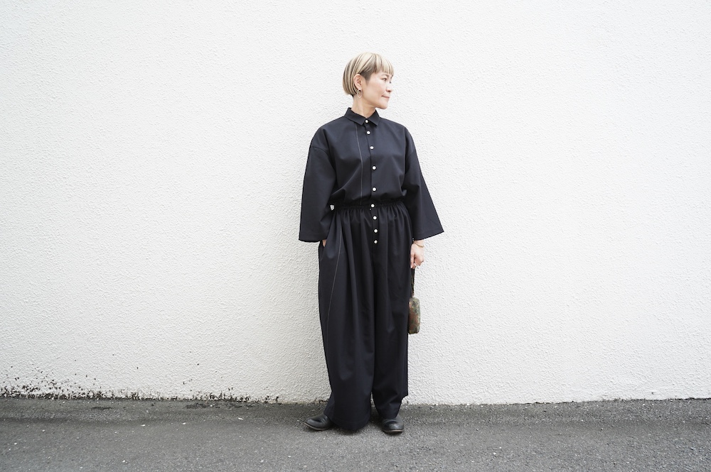デザインはレギュラーカラーを配したジャンプスーツ。全体的にゆったりとリラックスして着ていただけるサイジングで、パンツ部分もワイド幅です。ウエストよりやや下目に切り替えが施してあり、切り替え部分には紐がついているのでキュッと絞ってシルエットを変えていただけます。ウエストでキュッと絞って、パンツ部分には裁ち切りでギャザーが入っているのでちょうど腰位置で丸みのあるシルエットが出るように仕立てています。裏地はついていませんが、ポケットの袋布やパイピングに小花柄の生地を使用しているのが可愛らしい。マニッシュな雰囲気が格好良いジャンプスーツです。